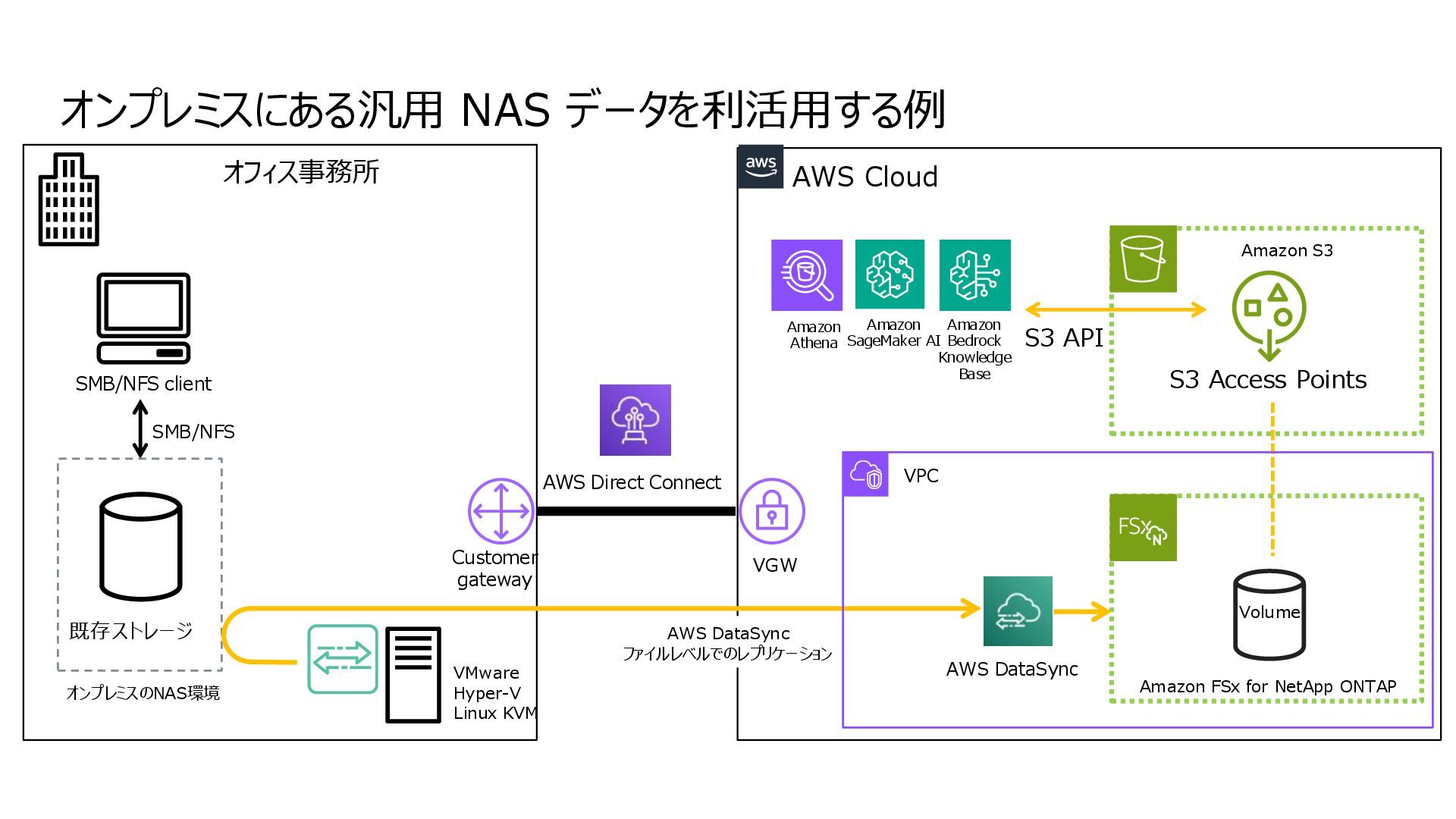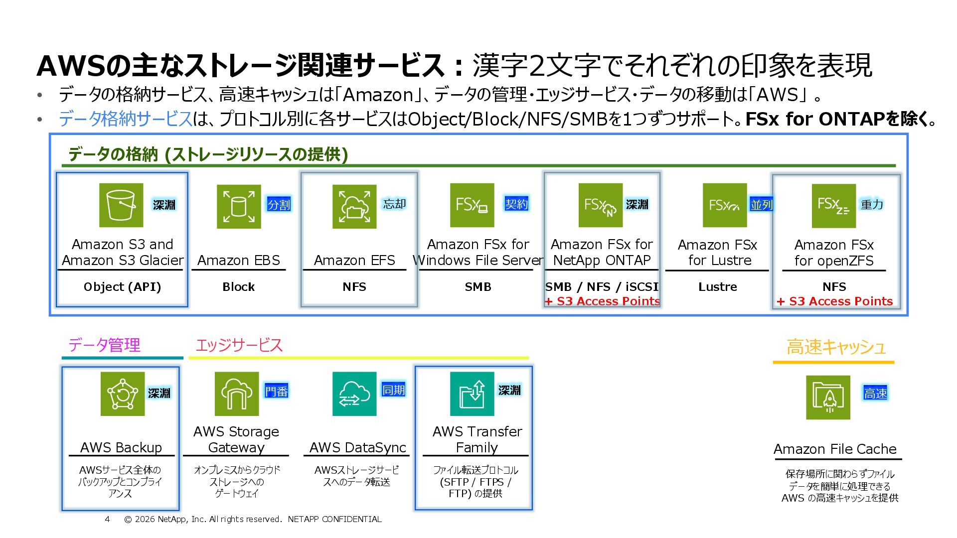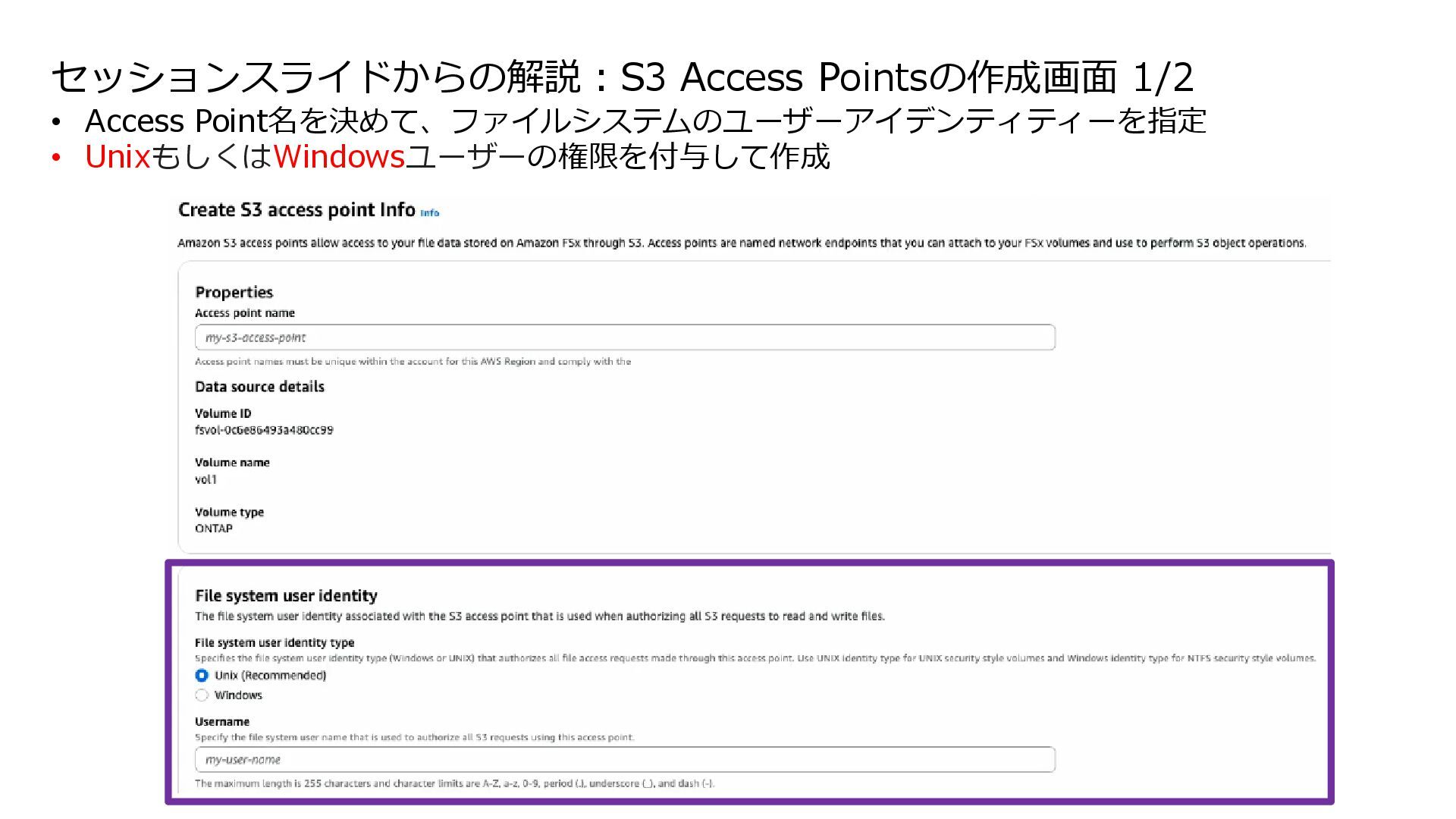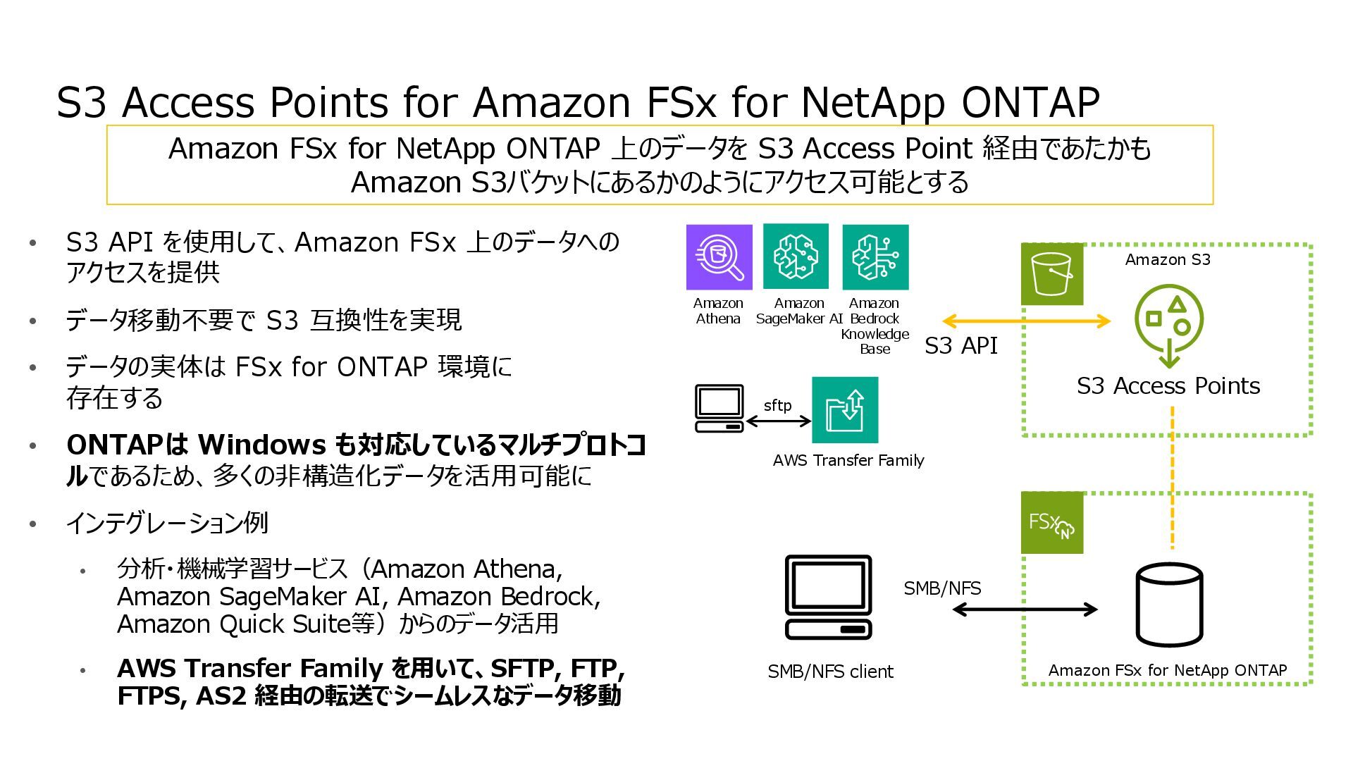 互換性を実現 • データの実体は FSx for ONTAP 環境に 存在する • ONTAPは Windows も対応しているマルチプロトコ ルであるため、多くの非構造化データを活用可能に • インテグレーション例 • 分析・機械学習サービス(Amazon Athena, Amazon SageMaker AI, Amazon Bedrock, Amazon Quick Suite等)からのデータ活用 • AWS Transfer Family を用いて、SFTP, FTP, FTPS, AS2 経由の転送でシームレスなデータ移動 S3 Access Points for Amazon FSx for NetApp ONTAP S3 Access Points Amazon FSx for NetApp ONTAP AWS Transfer Family SMB/NFS client Amazon Athena Amazon SageMaker AI Amazon Bedrock Knowledge Base SMB/NFS sftp S3 API Amazon FSx for NetApp ONTAP 上のデータを S3 Access Point 経由であたかも Amazon S3バケットにあるかのようにアクセス可能とする Amazon S3