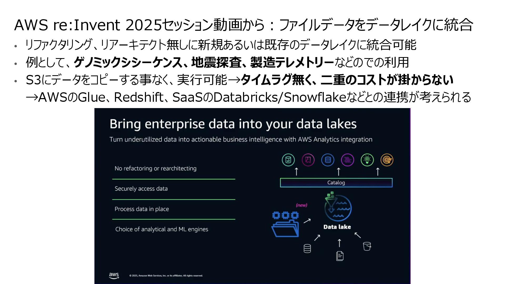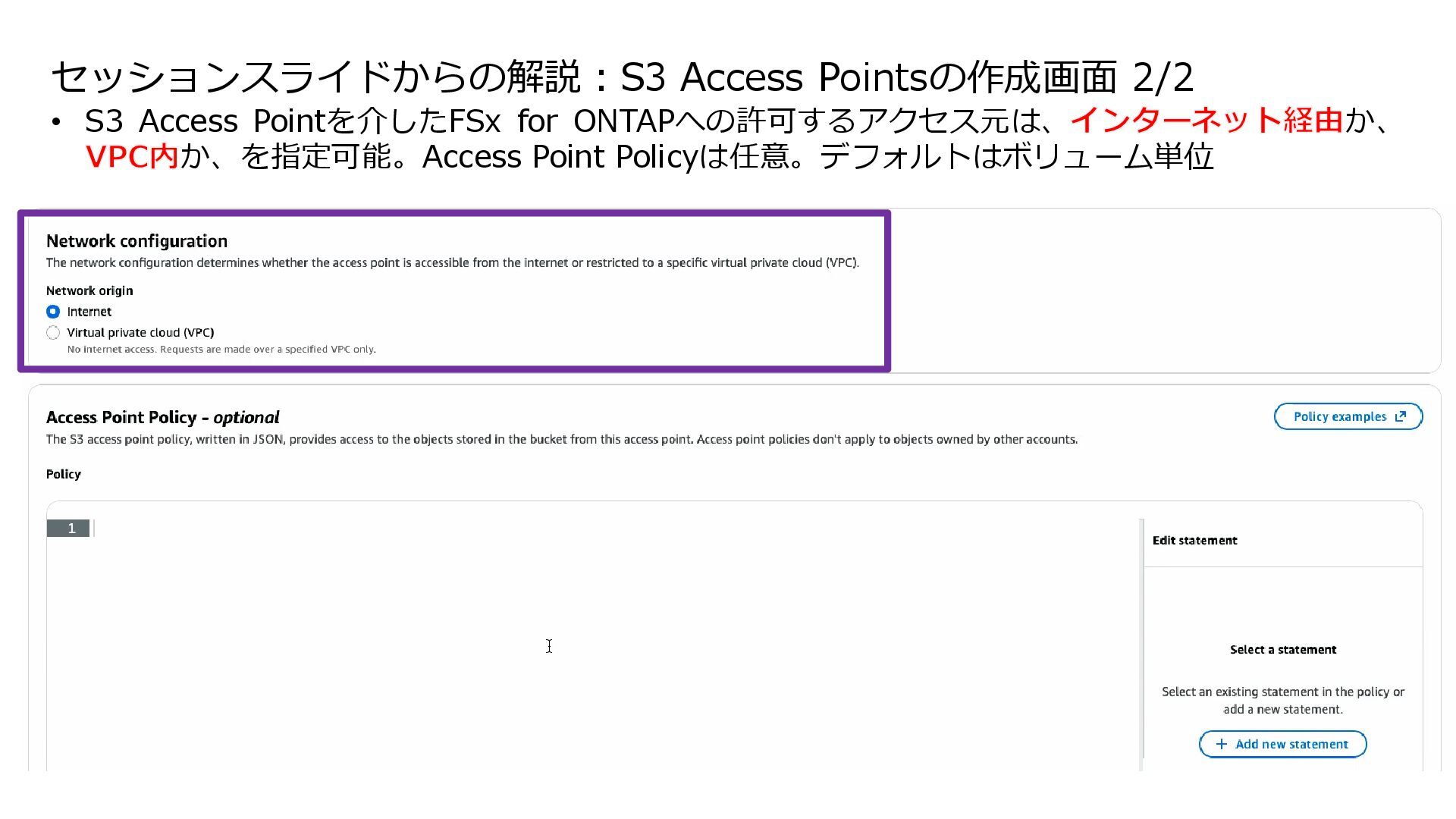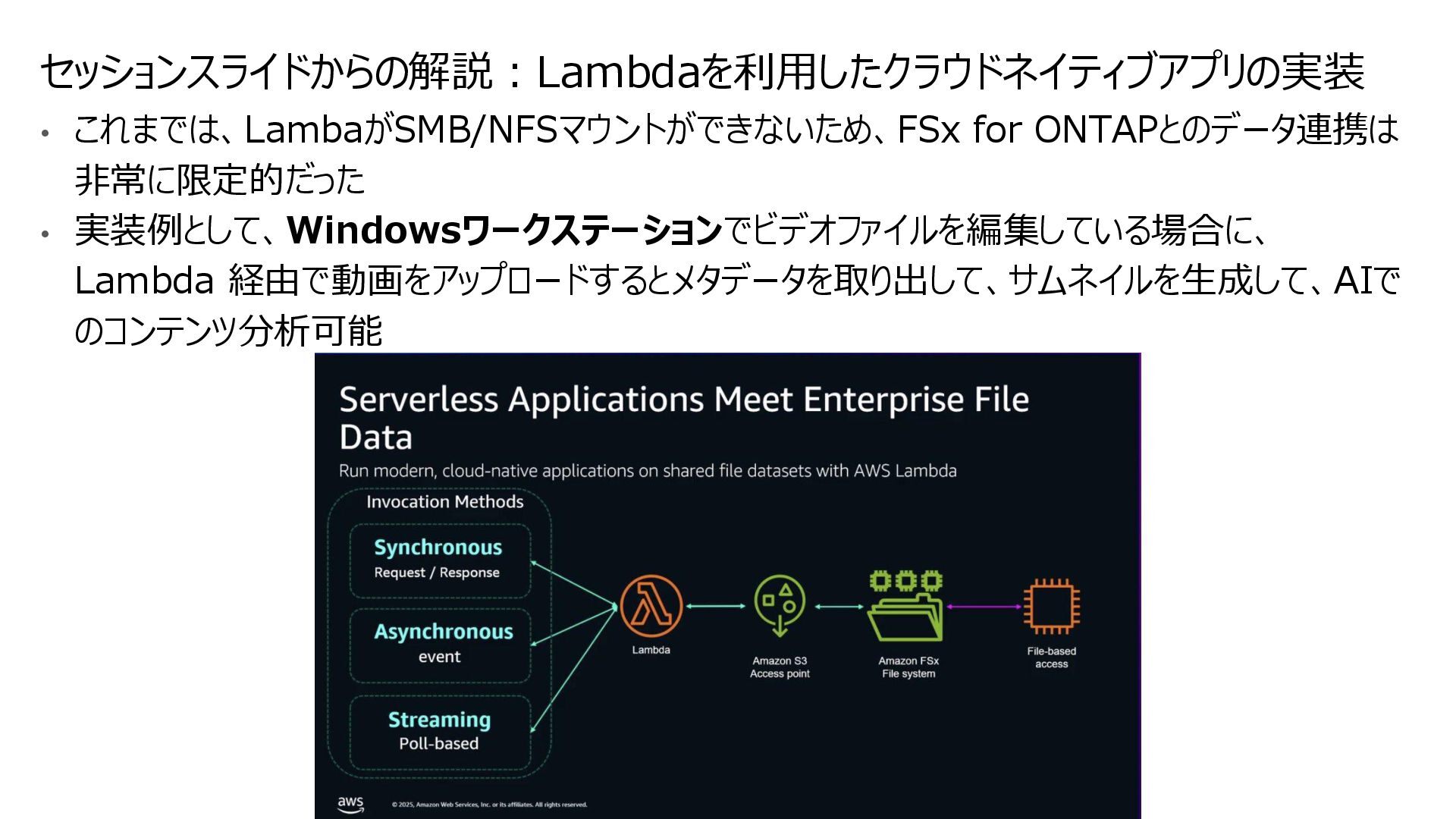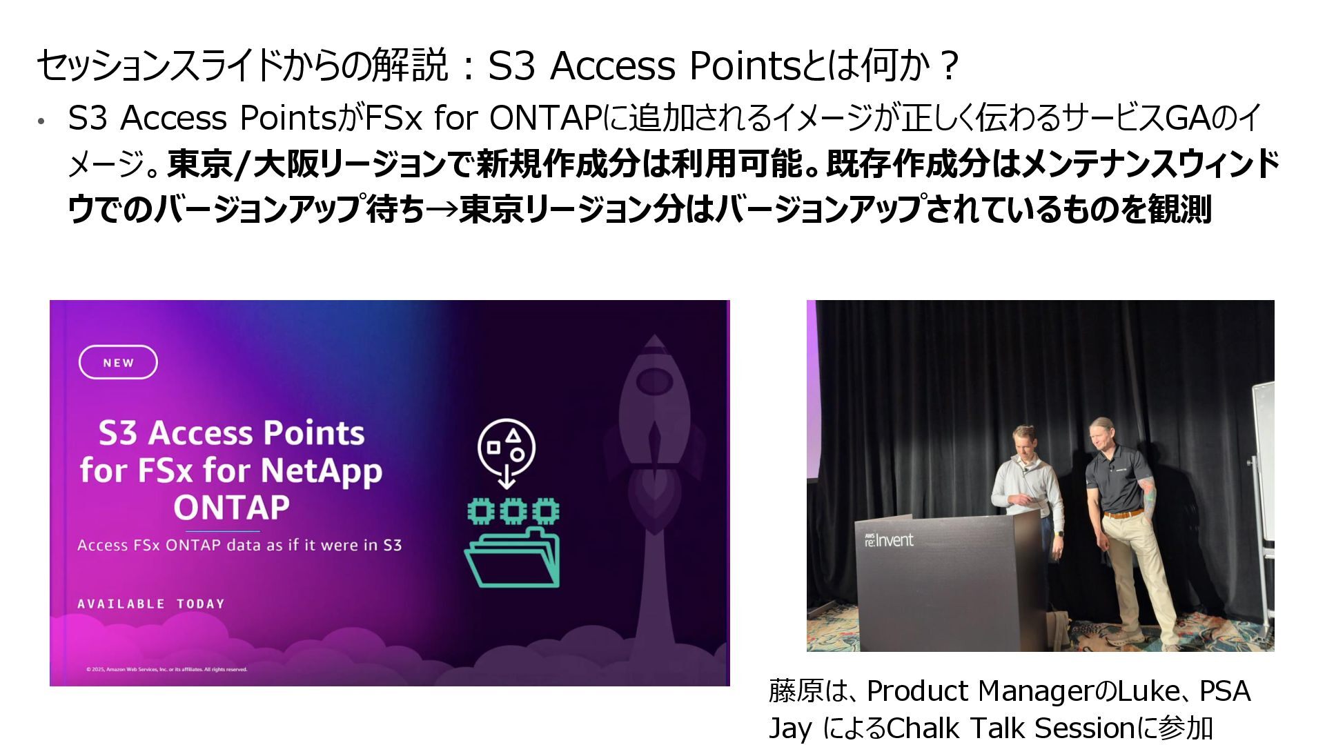 互換性を実現 • データの実体は FSx for ONTAP 環境に 存在する • ONTAPは Windows も対応しているマルチプロトコ ルであるため、多くの非構造化データを活用可能に • インテグレーション例 • 分析・機械学習サービス(Amazon Athena, Amazon SageMaker AI, Amazon Bedrock, Amazon Quick Suite等)からのデータ活用 • AWS Transfer Family を用いて、SFTP, FTP, FTPS, AS2 経由の転送でシームレスなデータ移動 S3 Access Points for Amazon FSx for NetApp ONTAP S3 Access Points Amazon FSx for NetApp ONTAP AWS Transfer Family SMB/NFS client Amazon Athena Amazon SageMaker AI Amazon Bedrock Knowledge Base SMB/NFS sftp S3 API Amazon FSx for NetApp ONTAP 上のデータを S3 Access Point 経由であたかも Amazon S3バケットにあるかのようにアクセス可能とする Amazon S3