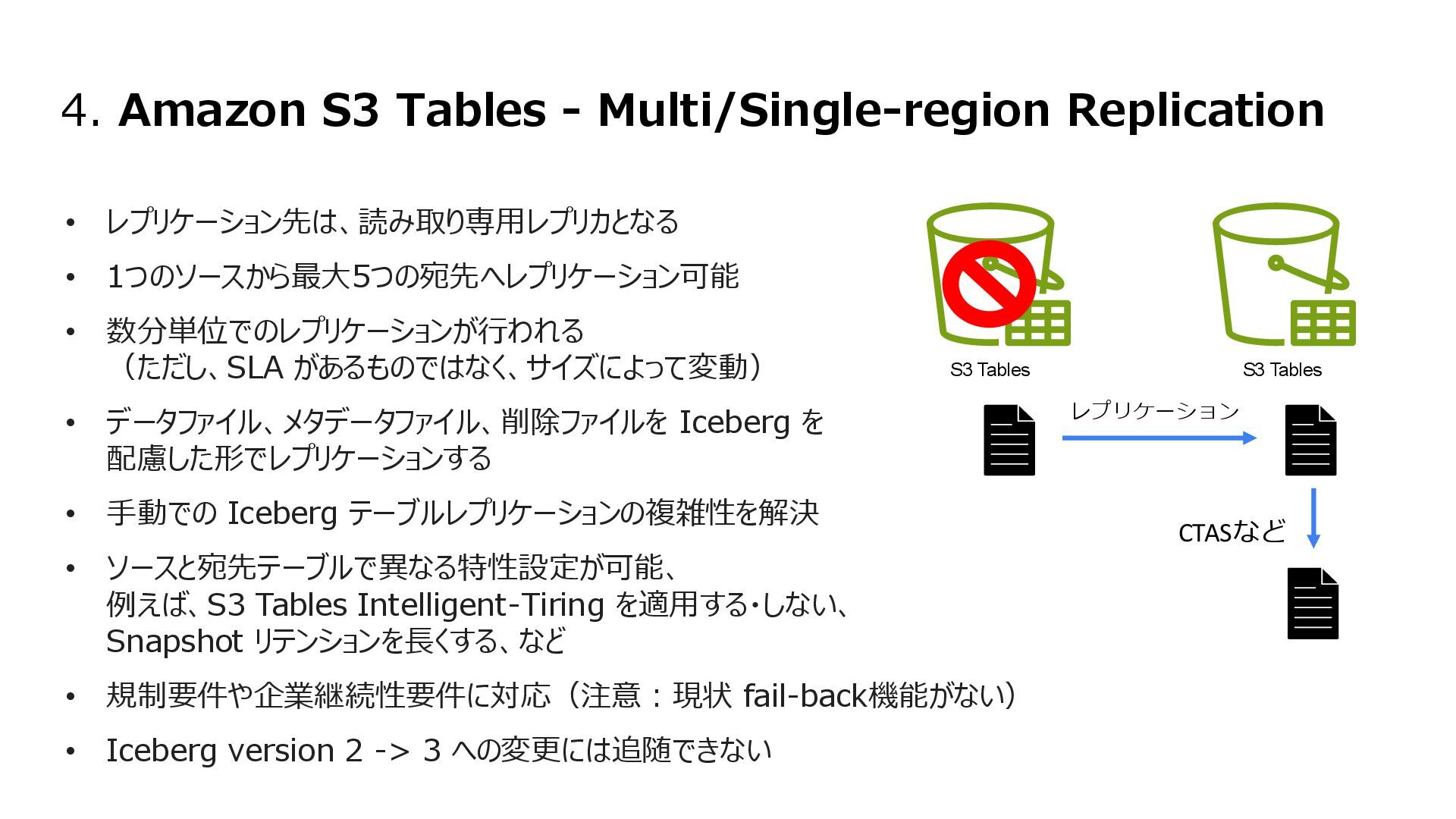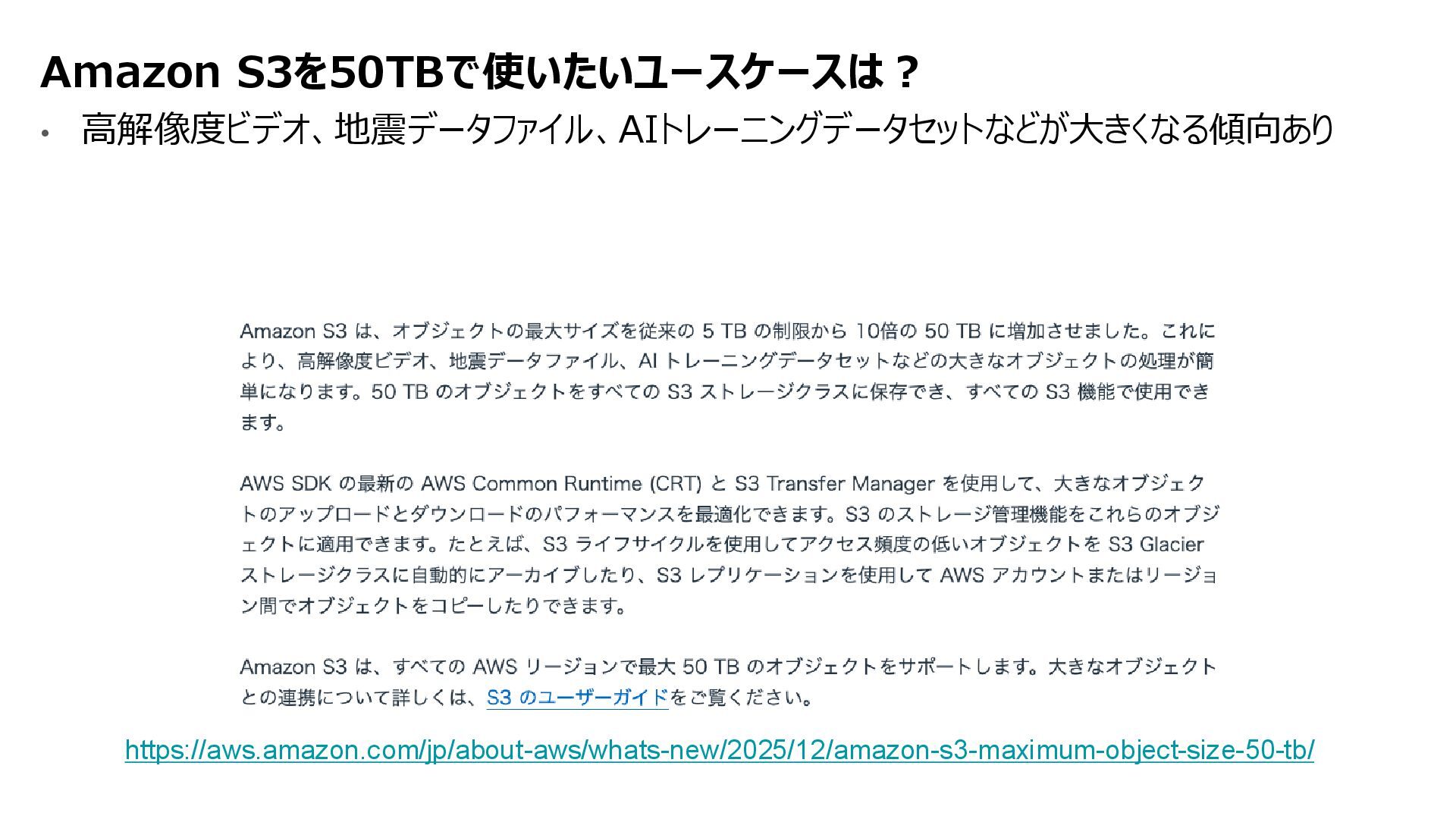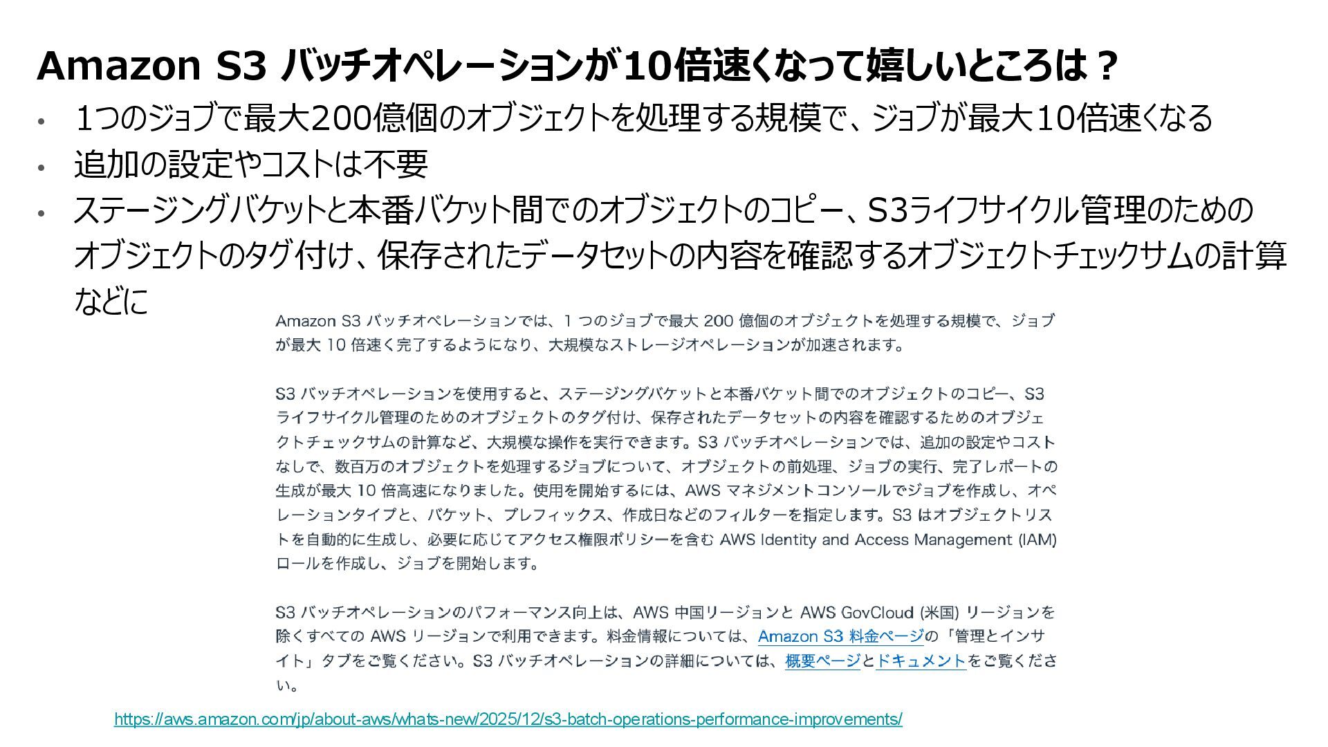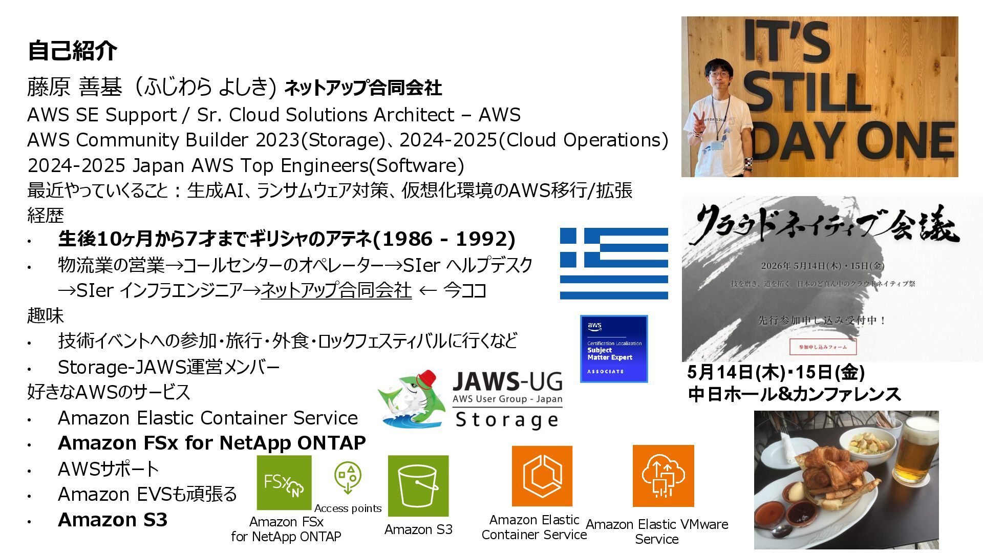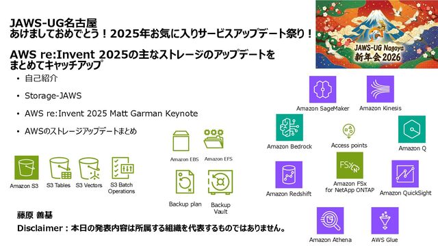互換性を実現 • データの実体は FSx for ONTAP 環境に 存在する • ONTAPは Windows も対応しているマルチプロトコ ルであるため、多くの非構造化データを活用可能に • インテグレーション例 • 分析・機械学習サービス(Amazon Athena, Amazon SageMaker AI, Amazon Bedrock, Amazon Quick Suite等)からのデータ活用 • AWS Transfer Family を用いて、SFTP, FTP, FTPS, AS2 経由の転送でシームレスなデータ移動 S3 Access Points for Amazon FSx for NetApp ONTAP S3 Access Points Amazon FSx for NetApp ONTAP AWS Transfer Family SMB/NFS client Amazon Athena Amazon SageMaker AI Amazon Bedrock Knowledge Base SMB/NFS sftp S3 API Amazon FSx for NetApp ONTAP 上のデータを S3 Access Point 経由であたかも Amazon S3バケットにあるかのようにアクセス可能とする Amazon S3