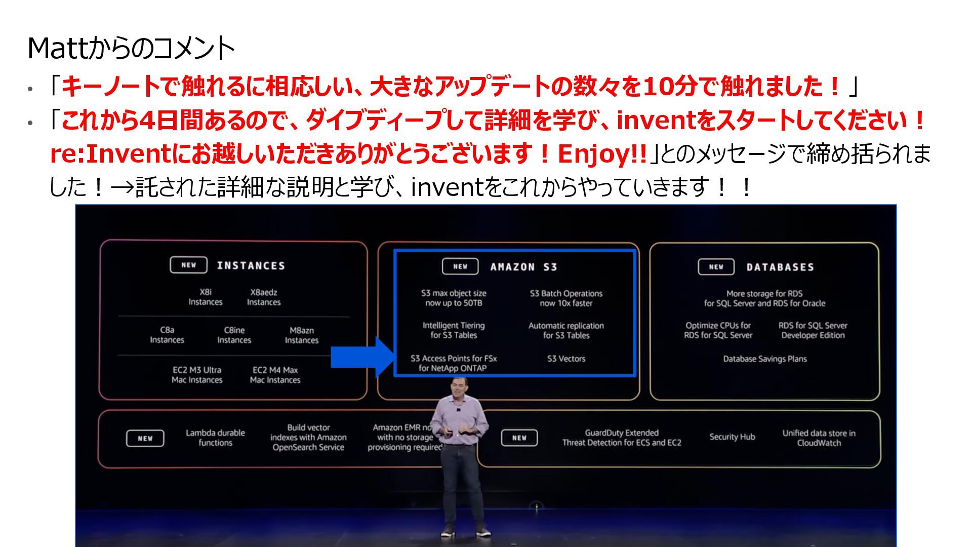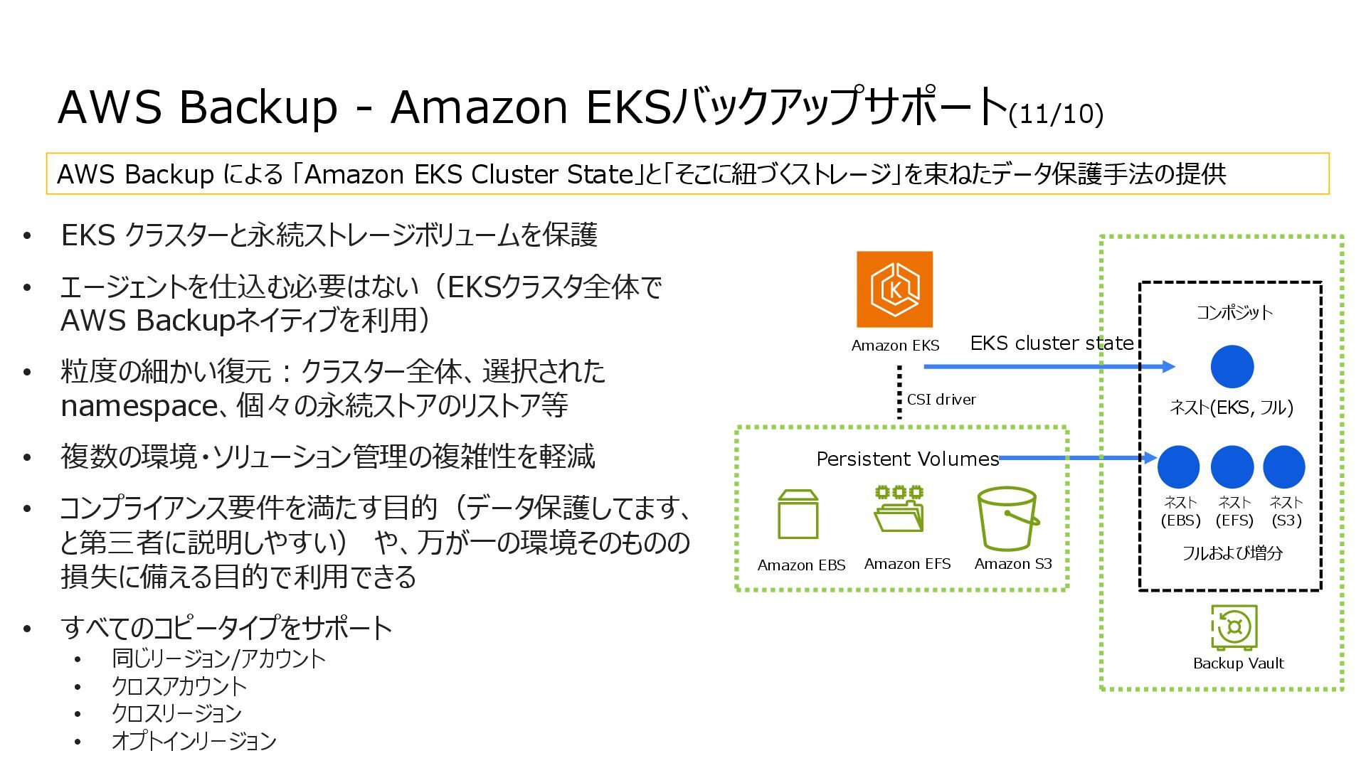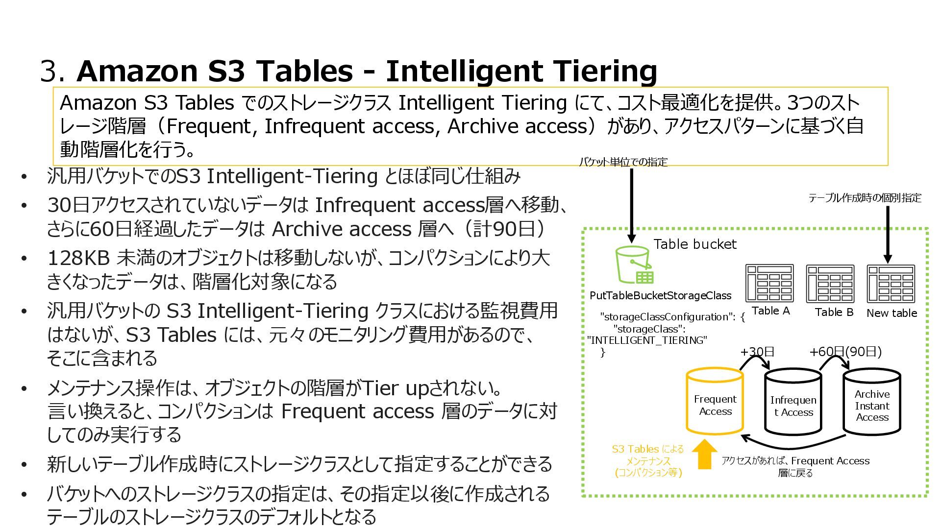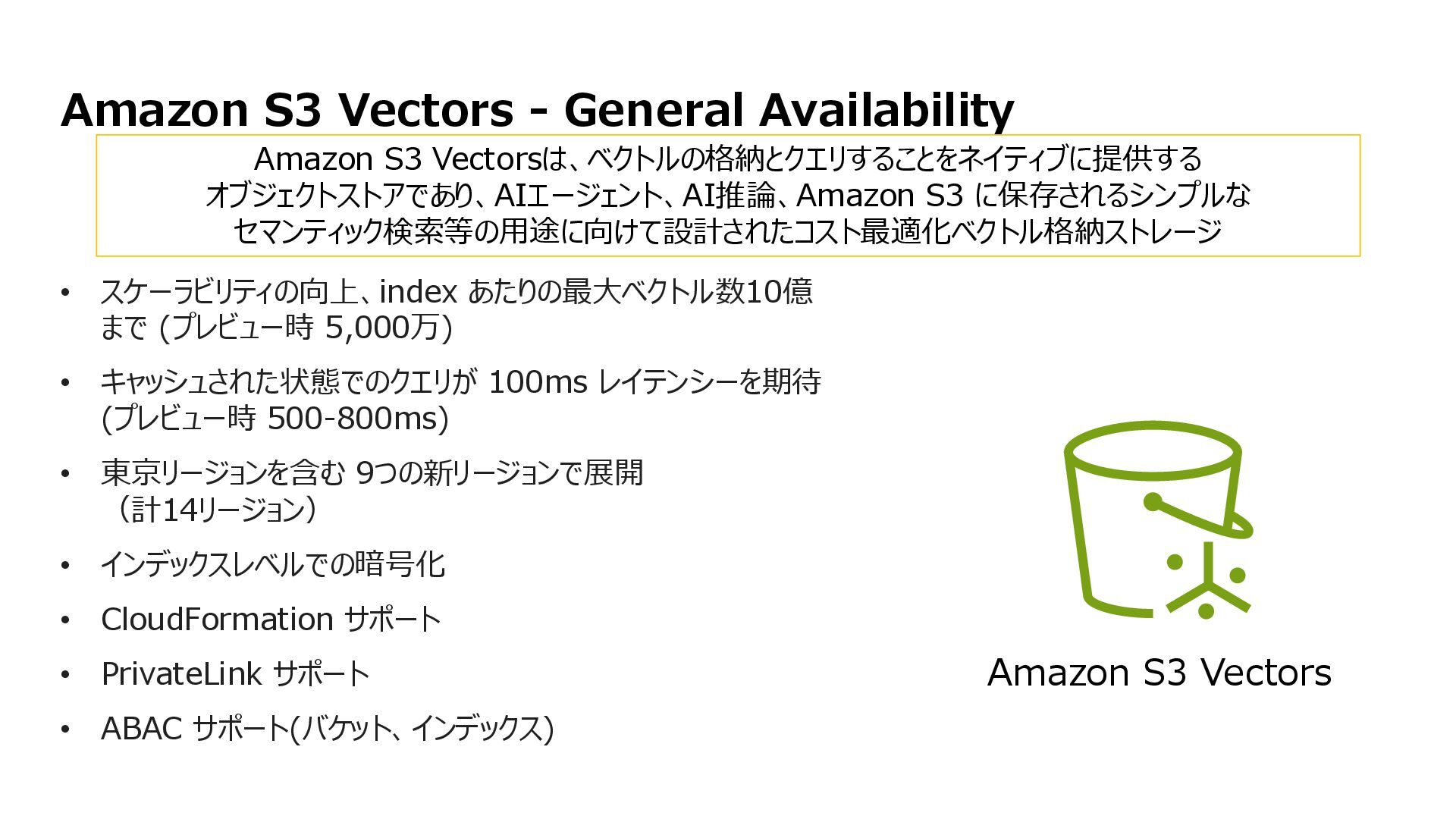 互換性を実現 • データの実体は FSx for ONTAP 環境に 存在する • ONTAPは Windows も対応しているマルチプロトコ ルであるため、多くの非構造化データを活用可能に • インテグレーション例 • 分析・機械学習サービス(Amazon Athena, Amazon SageMaker AI, Amazon Bedrock, Amazon Quick Suite等)からのデータ活用 • AWS Transfer Family を用いて、SFTP, FTP, FTPS, AS2 経由の転送でシームレスなデータ移動 S3 Access Points for Amazon FSx for NetApp ONTAP S3 Access Points Amazon FSx for NetApp ONTAP AWS Transfer Family SMB/NFS client Amazon Athena Amazon SageMaker AI Amazon Bedrock Knowledge Base SMB/NFS sftp S3 API Amazon FSx for NetApp ONTAP 上のデータを S3 Access Point 経由であたかも Amazon S3バケットにあるかのようにアクセス可能とする Amazon S3