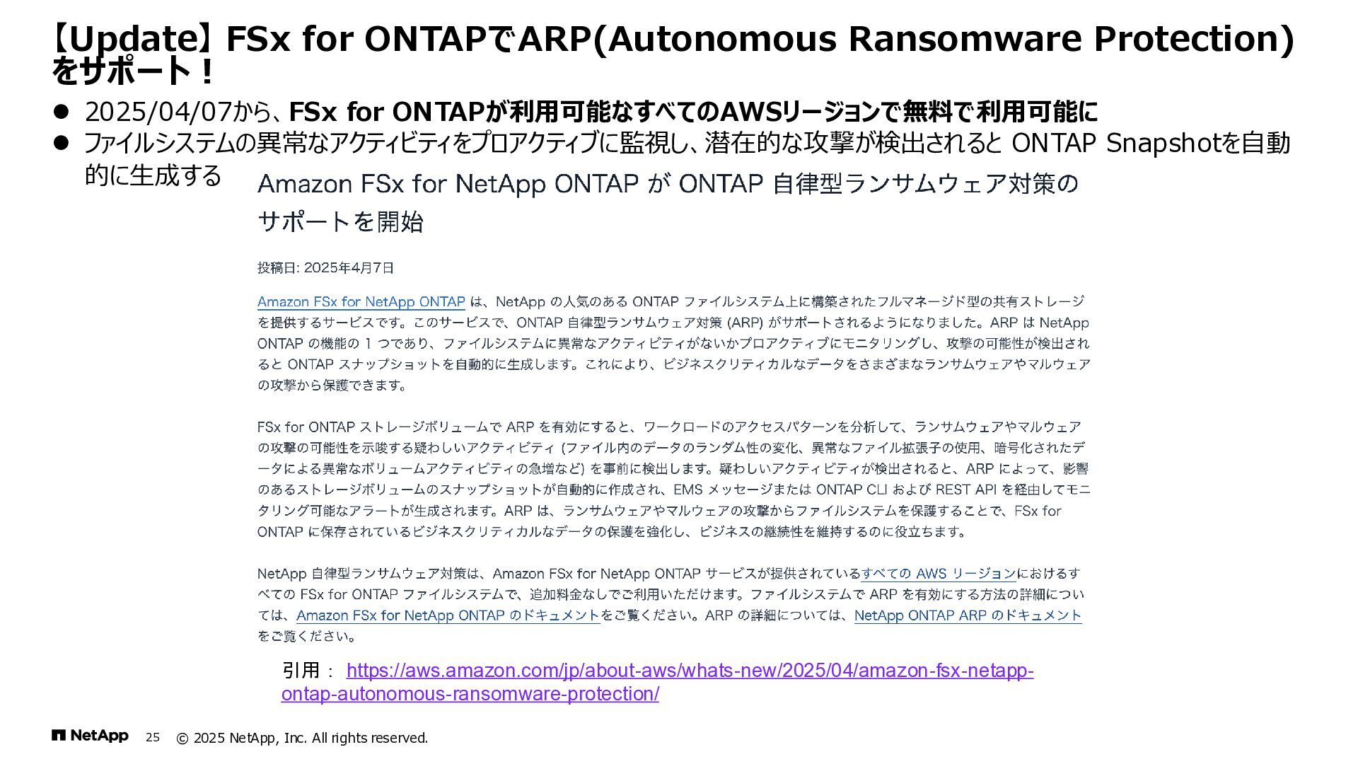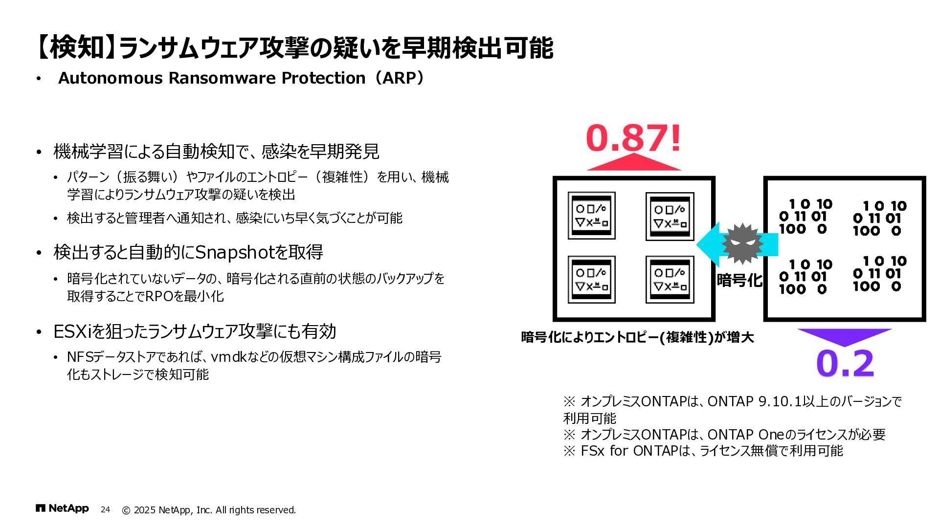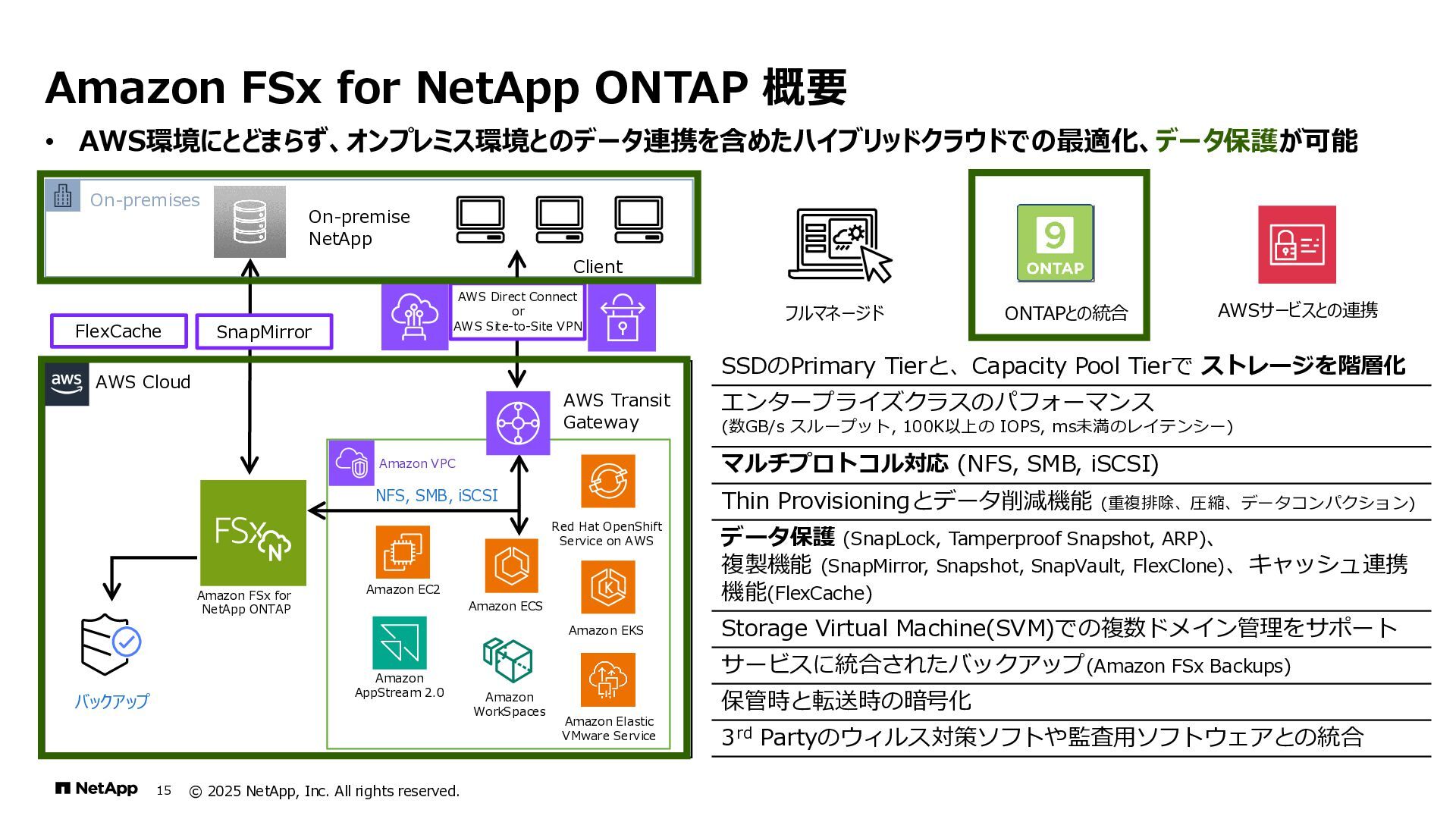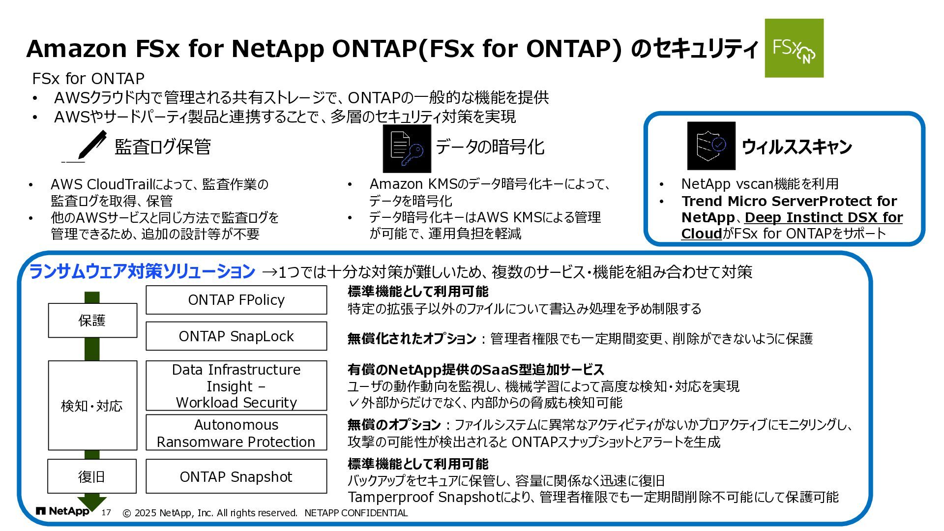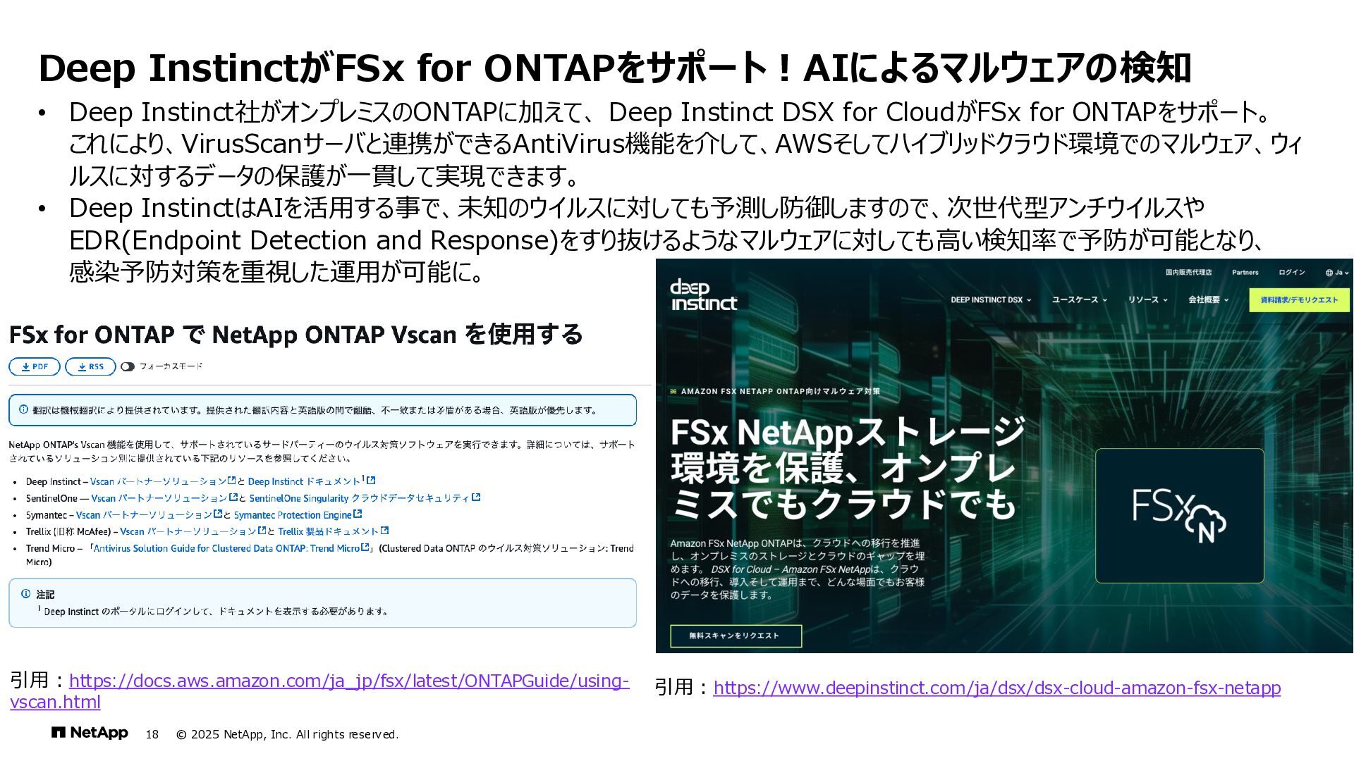 Instinct社がオンプレミスのONTAPに加えて、 Deep Instinct DSX for CloudがFSx for ONTAPをサポート。 これにより、VirusScanサーバと連携ができるAntiVirus機能を介して、AWSそしてハイブリッドクラウド環境でのマルウェア、ウィ ルスに対するデータの保護が一貫して実現できます。 • Deep InstinctはAIを活用する事で、未知のウイルスに対しても予測し防御しますので、次世代型アンチウイルスや EDR(Endpoint Detection and Response)をすり抜けるようなマルウェアに対しても高い検知率で予防が可能となり、 感染予防対策を重視した運用が可能に。 Deep InstinctがFSx for ONTAPをサポート!AIによるマルウェアの検知 引用:https://docs.aws.amazon.com/ja_jp/fsx/latest/ONTAPGuide/using- vscan.html 引用:https://www.deepinstinct.com/ja/dsx/dsx-cloud-amazon-fsx-netapp