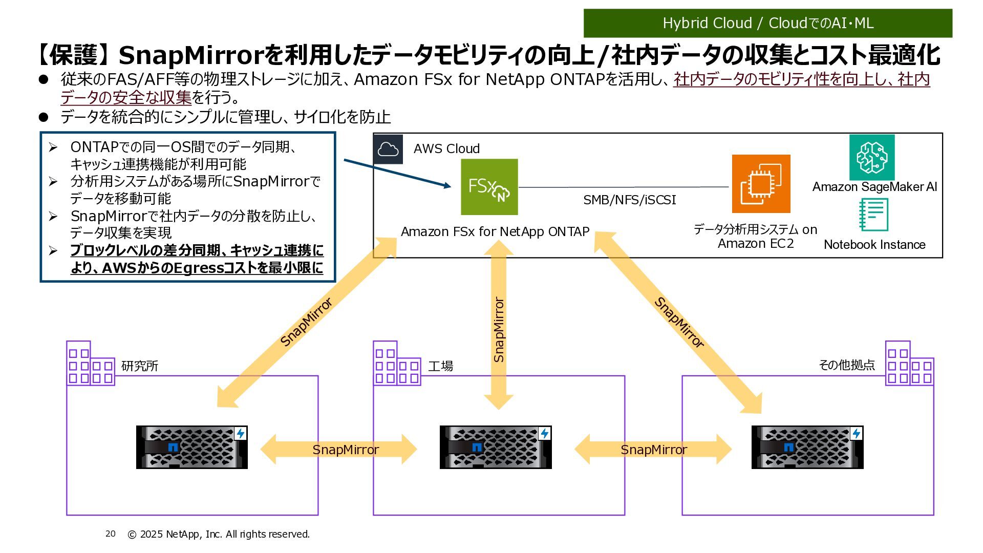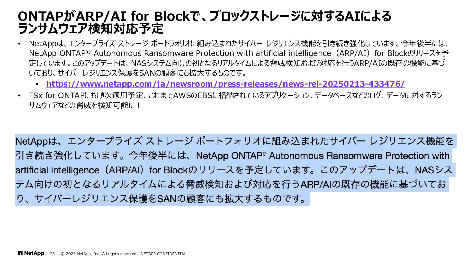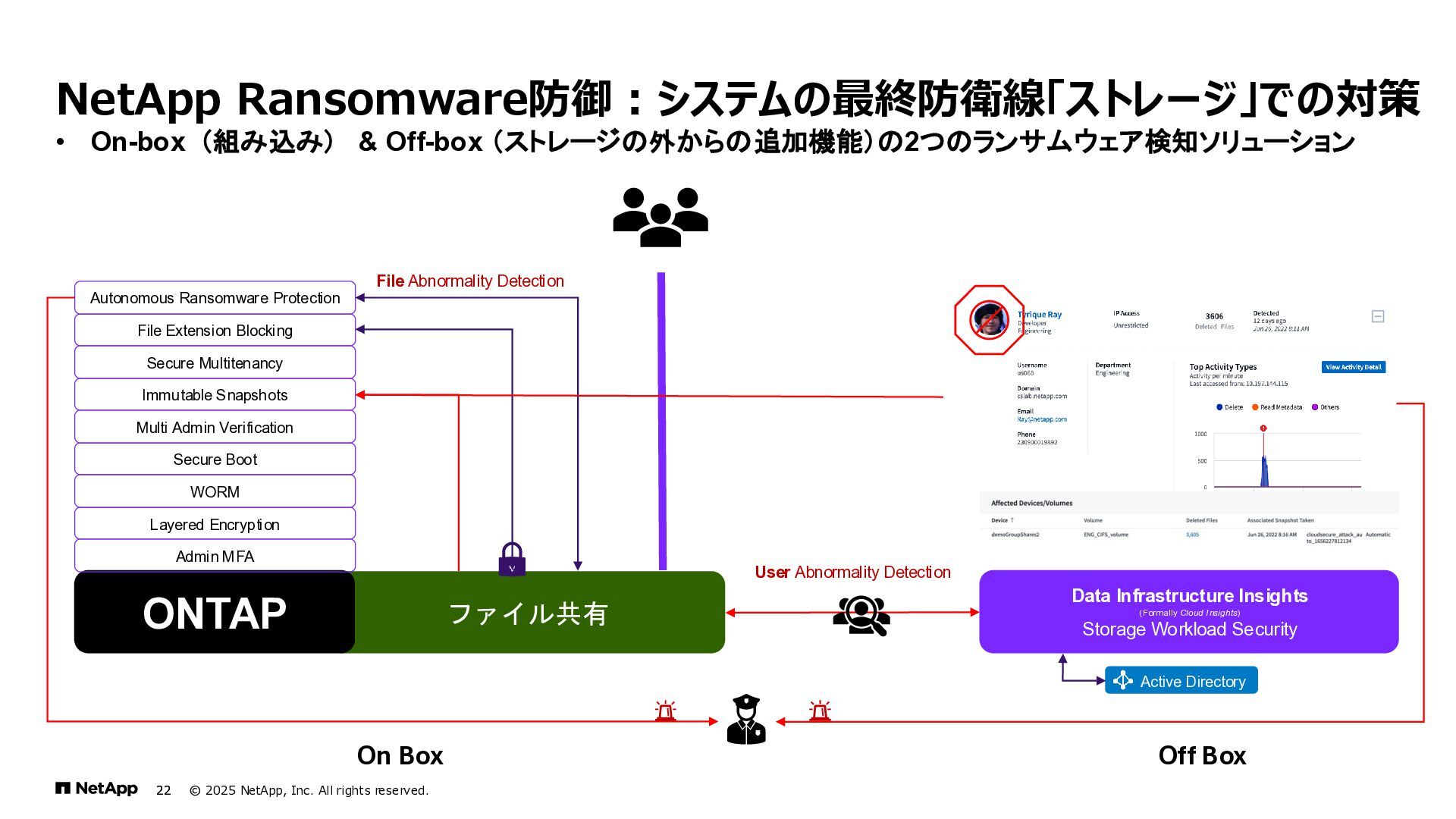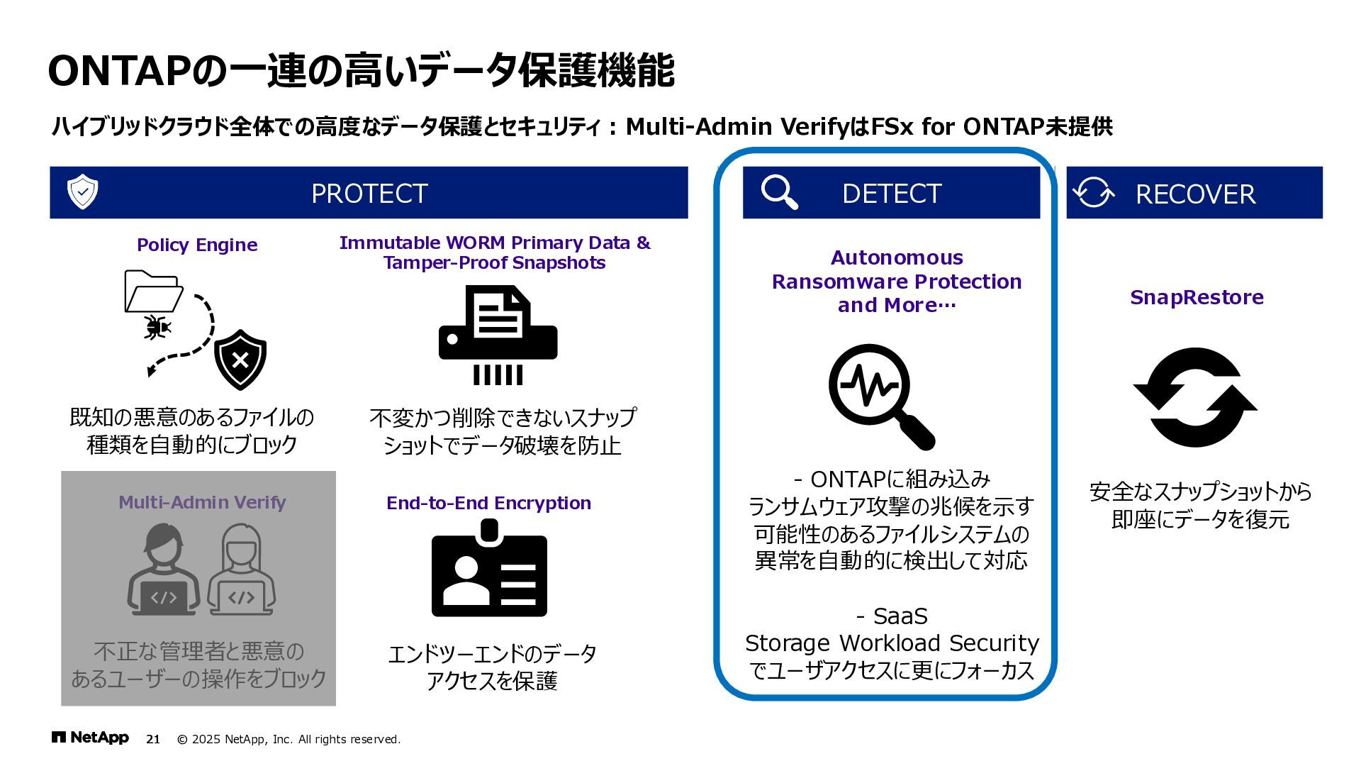 Instinct社がオンプレミスのONTAPに加えて、 Deep Instinct DSX for CloudがFSx for ONTAPをサポート。 これにより、VirusScanサーバと連携ができるAntiVirus機能を介して、AWSそしてハイブリッドクラウド環境でのマルウェア、ウィ ルスに対するデータの保護が一貫して実現できます。 • Deep InstinctはAIを活用する事で、未知のウイルスに対しても予測し防御しますので、次世代型アンチウイルスや EDR(Endpoint Detection and Response)をすり抜けるようなマルウェアに対しても高い検知率で予防が可能となり、 感染予防対策を重視した運用が可能に。 Deep InstinctがFSx for ONTAPをサポート!AIによるマルウェアの検知 引用:https://docs.aws.amazon.com/ja_jp/fsx/latest/ONTAPGuide/using- vscan.html 引用:https://www.deepinstinct.com/ja/dsx/dsx-cloud-amazon-fsx-netapp
