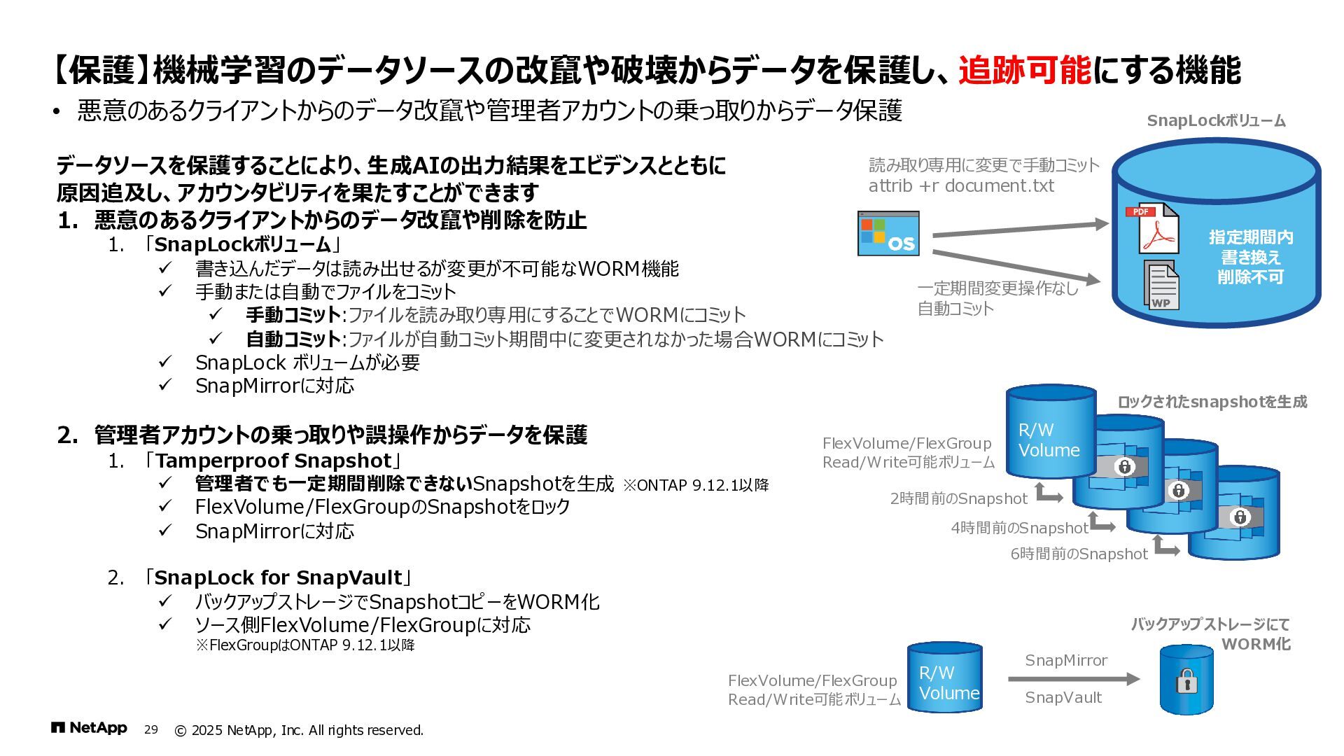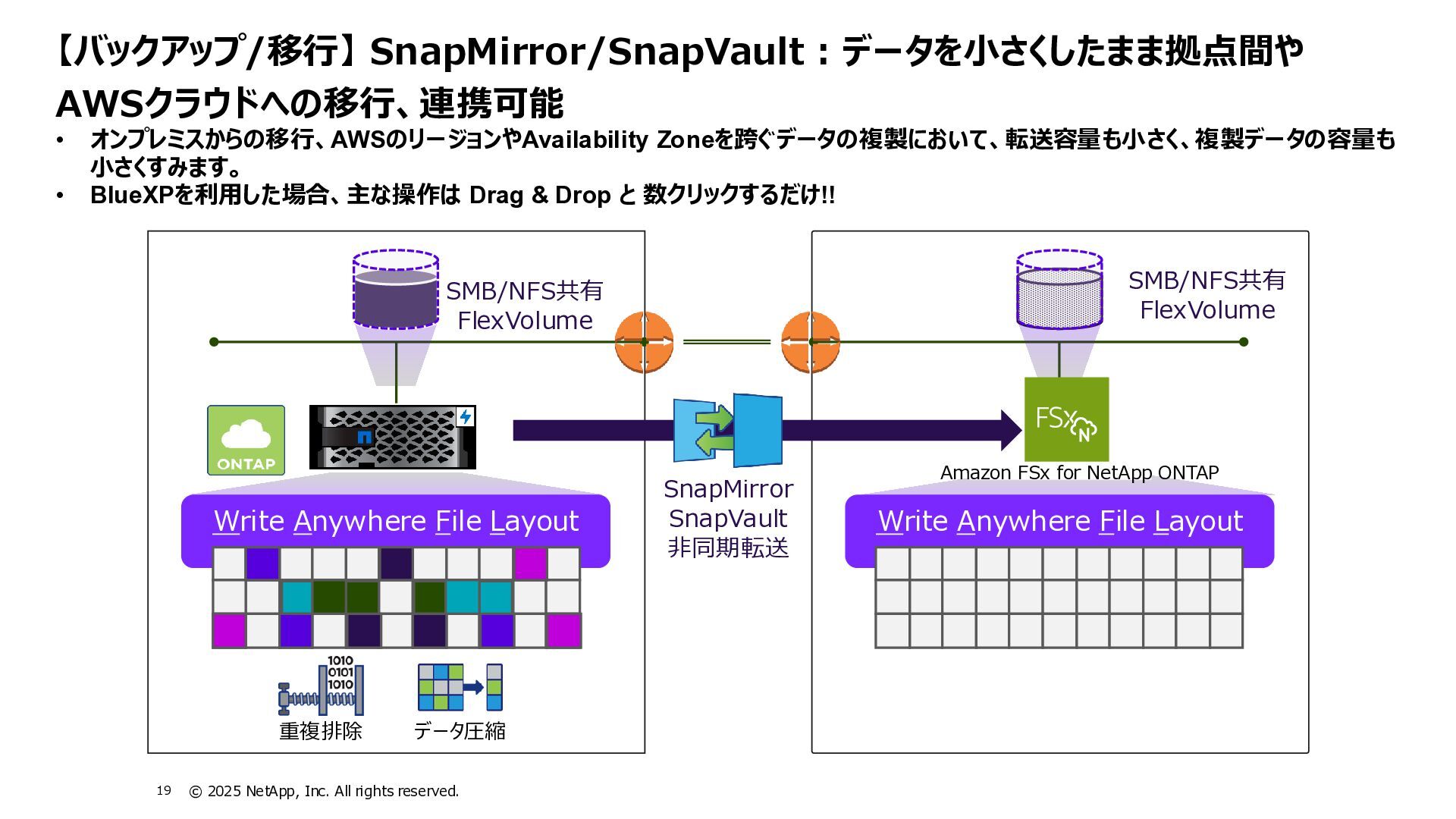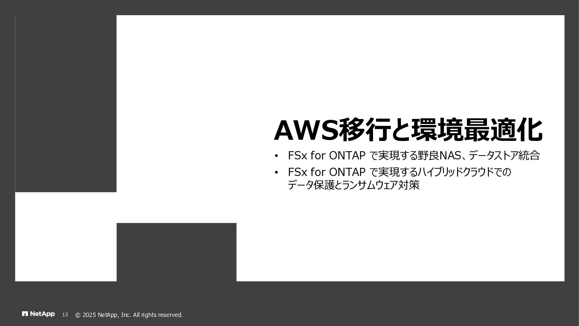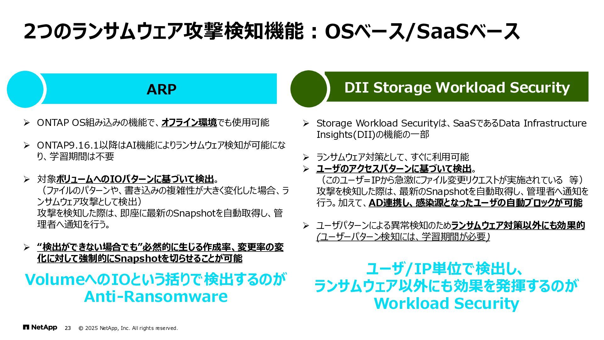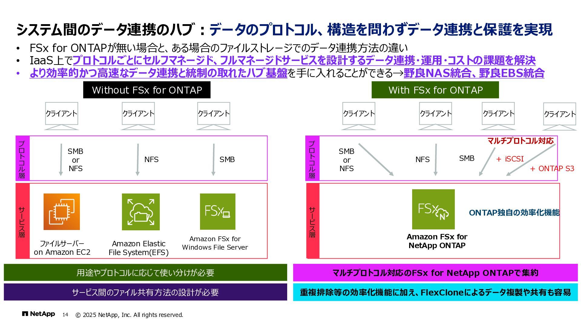 Instinct社がオンプレミスのONTAPに加えて、 Deep Instinct DSX for CloudがFSx for ONTAPをサポート。 これにより、VirusScanサーバと連携ができるAntiVirus機能を介して、AWSそしてハイブリッドクラウド環境でのマルウェア、ウィ ルスに対するデータの保護が一貫して実現できます。 • Deep InstinctはAIを活用する事で、未知のウイルスに対しても予測し防御しますので、次世代型アンチウイルスや EDR(Endpoint Detection and Response)をすり抜けるようなマルウェアに対しても高い検知率で予防が可能となり、 感染予防対策を重視した運用が可能に。 Deep InstinctがFSx for ONTAPをサポート!AIによるマルウェアの検知 引用:https://docs.aws.amazon.com/ja_jp/fsx/latest/ONTAPGuide/using- vscan.html 引用:https://www.deepinstinct.com/ja/dsx/dsx-cloud-amazon-fsx-netapp