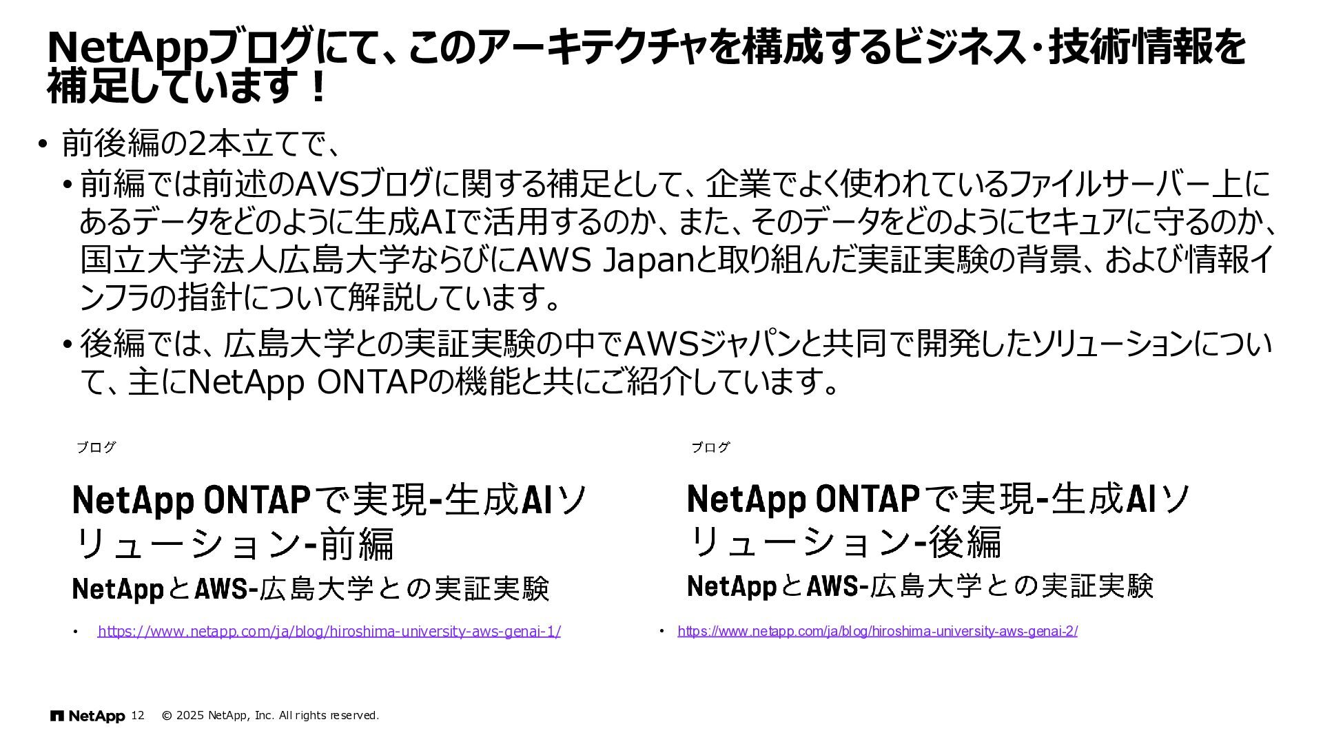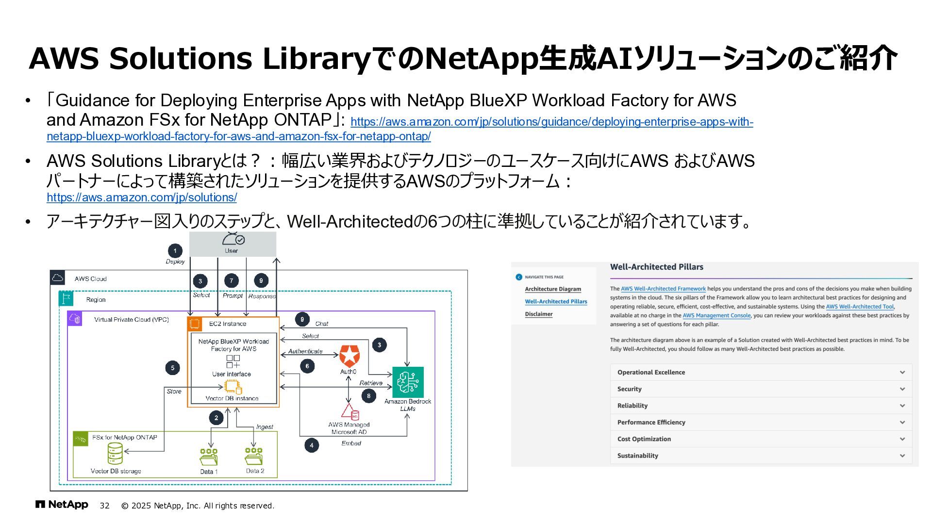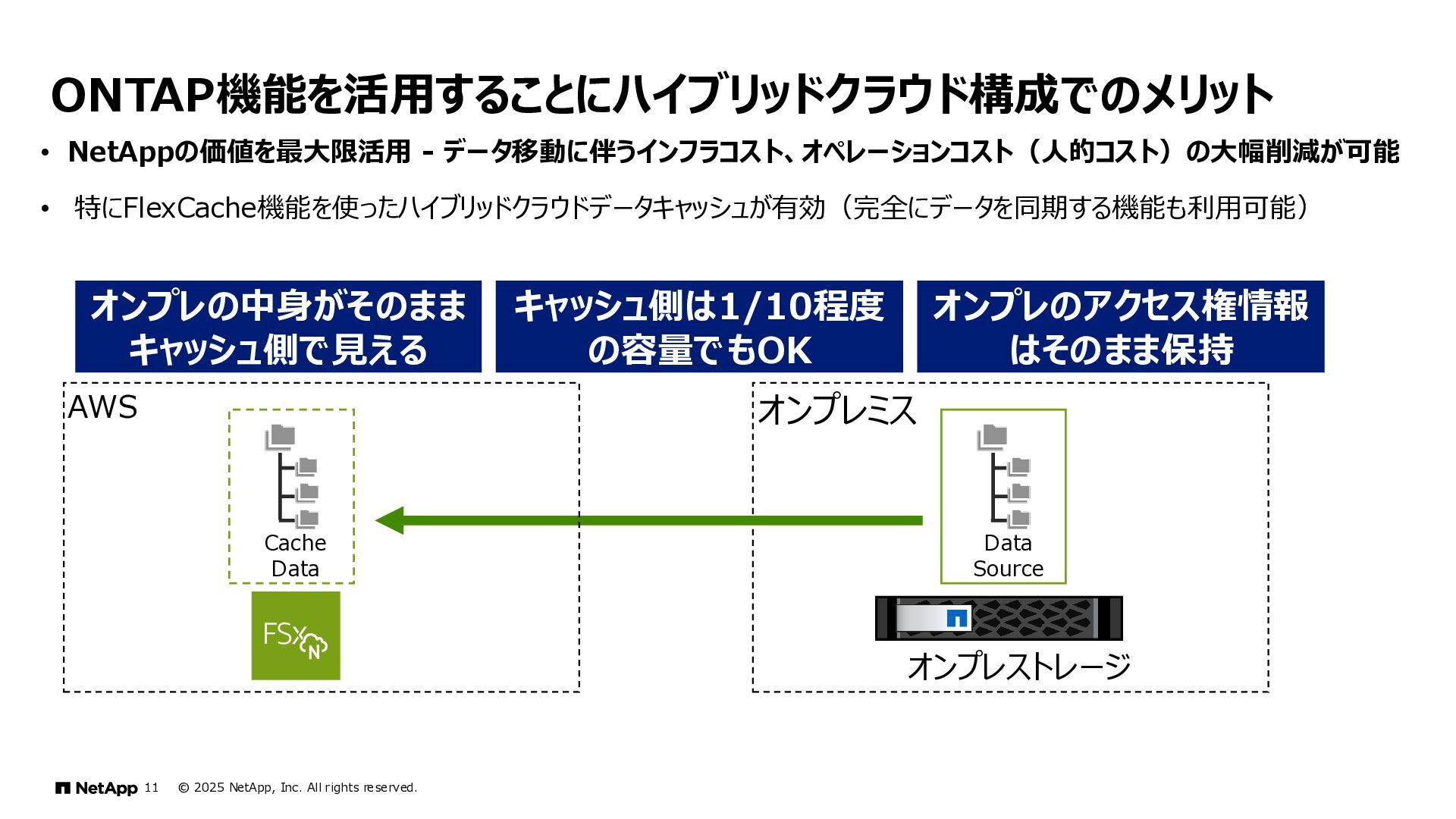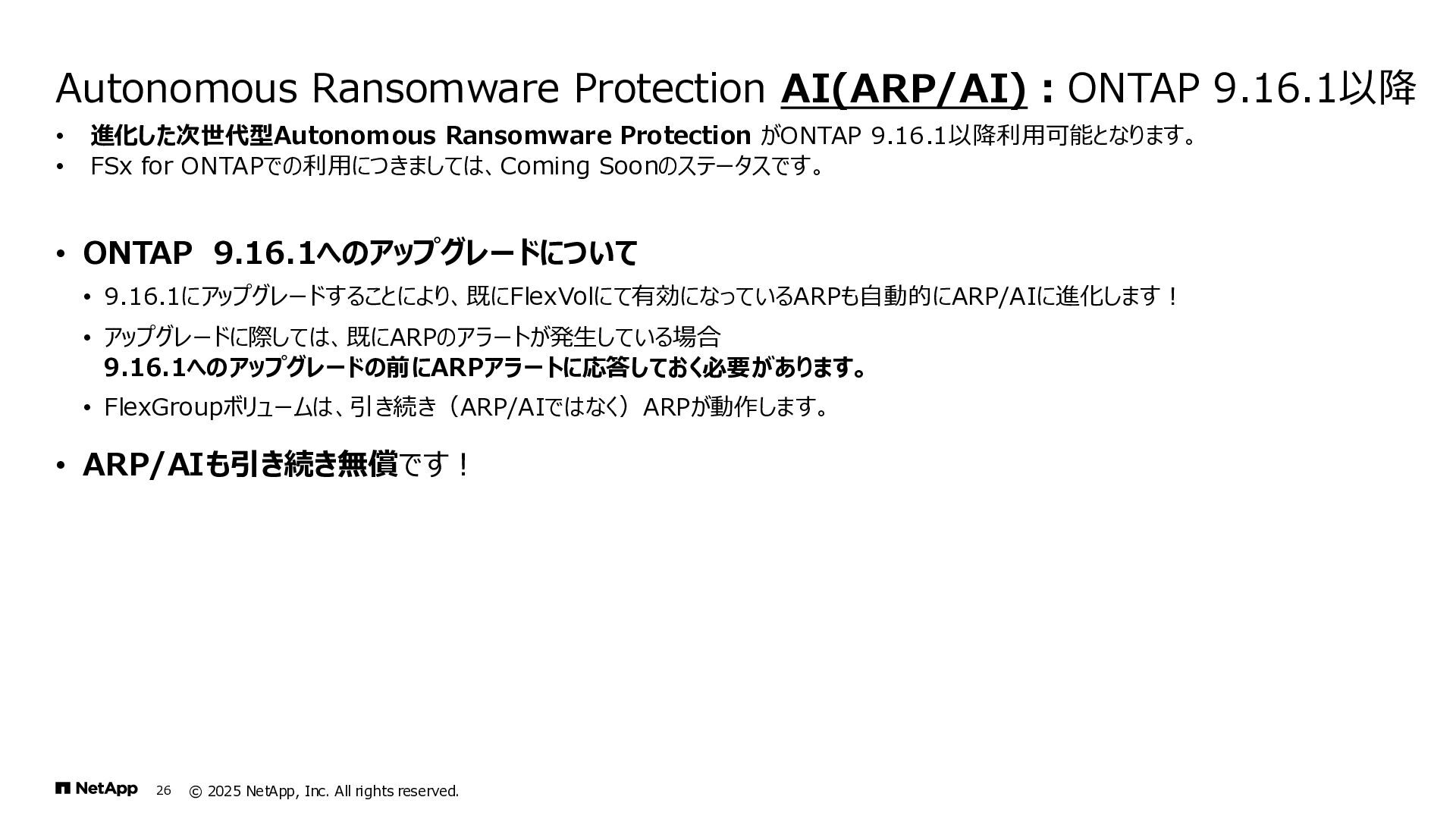 Instinct社がオンプレミスのONTAPに加えて、 Deep Instinct DSX for CloudがFSx for ONTAPをサポート。 これにより、VirusScanサーバと連携ができるAntiVirus機能を介して、AWSそしてハイブリッドクラウド環境でのマルウェア、ウィ ルスに対するデータの保護が一貫して実現できます。 • Deep InstinctはAIを活用する事で、未知のウイルスに対しても予測し防御しますので、次世代型アンチウイルスや EDR(Endpoint Detection and Response)をすり抜けるようなマルウェアに対しても高い検知率で予防が可能となり、 感染予防対策を重視した運用が可能に。 Deep InstinctがFSx for ONTAPをサポート!AIによるマルウェアの検知 引用:https://docs.aws.amazon.com/ja_jp/fsx/latest/ONTAPGuide/using- vscan.html 引用:https://www.deepinstinct.com/ja/dsx/dsx-cloud-amazon-fsx-netapp