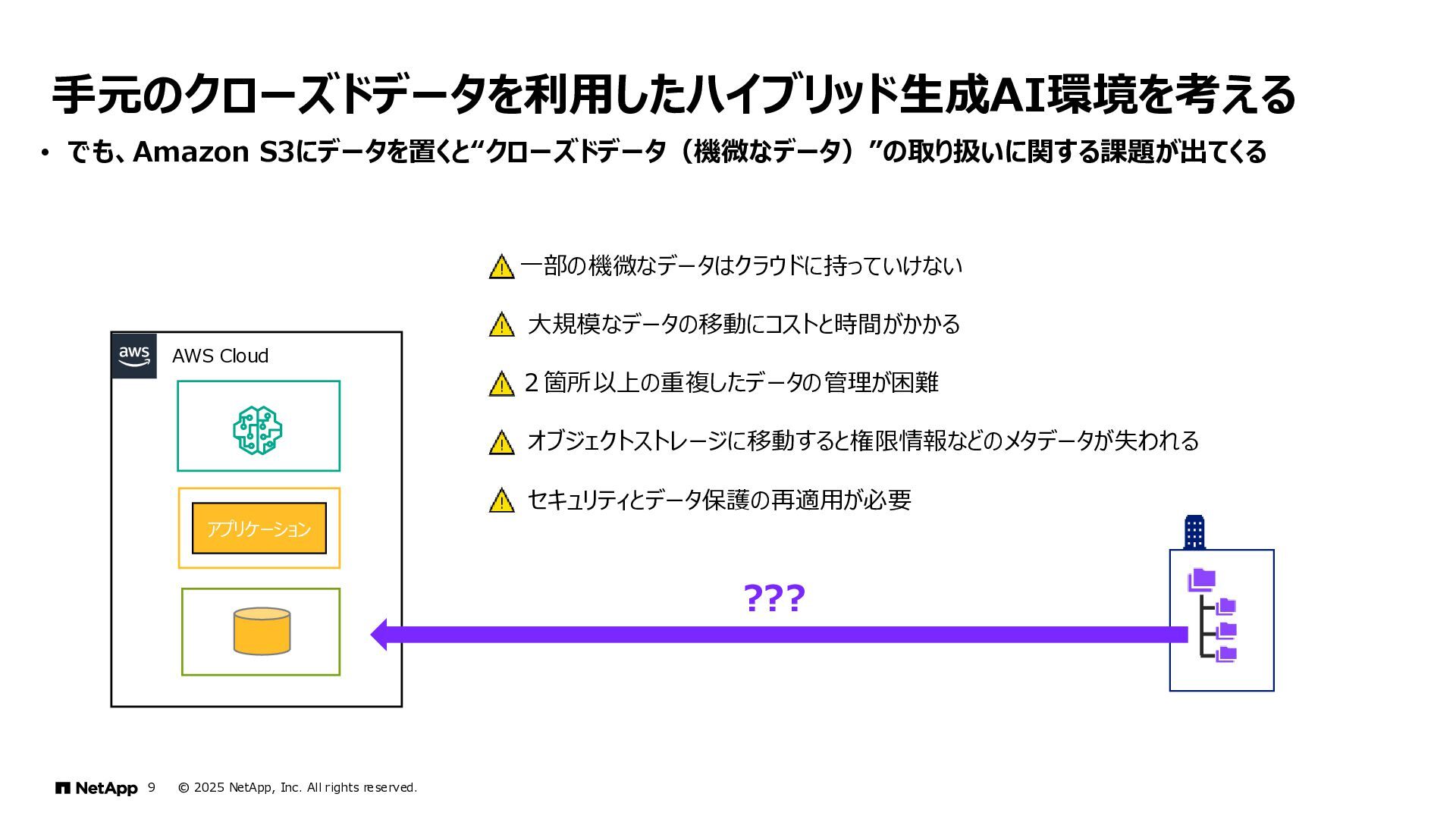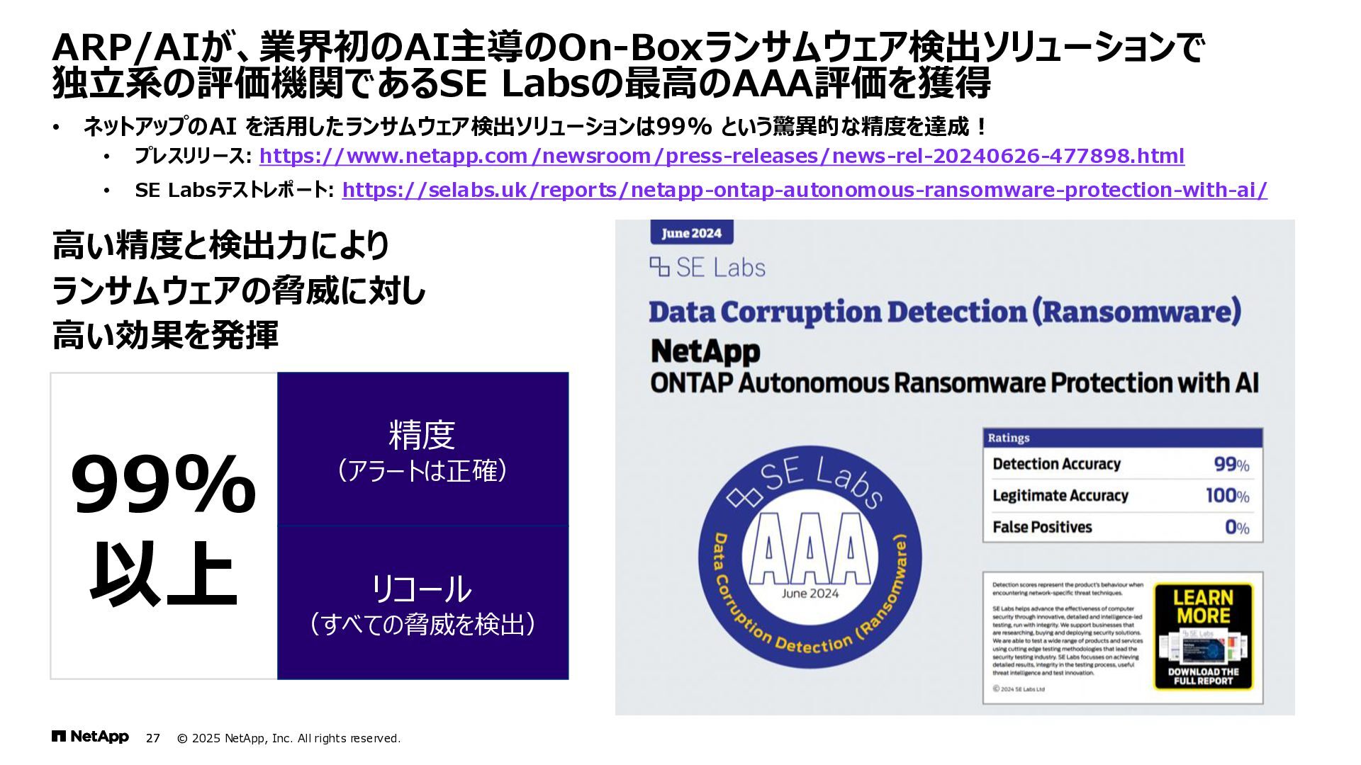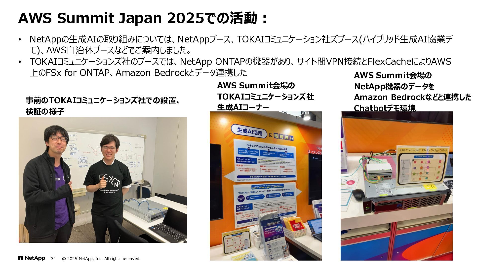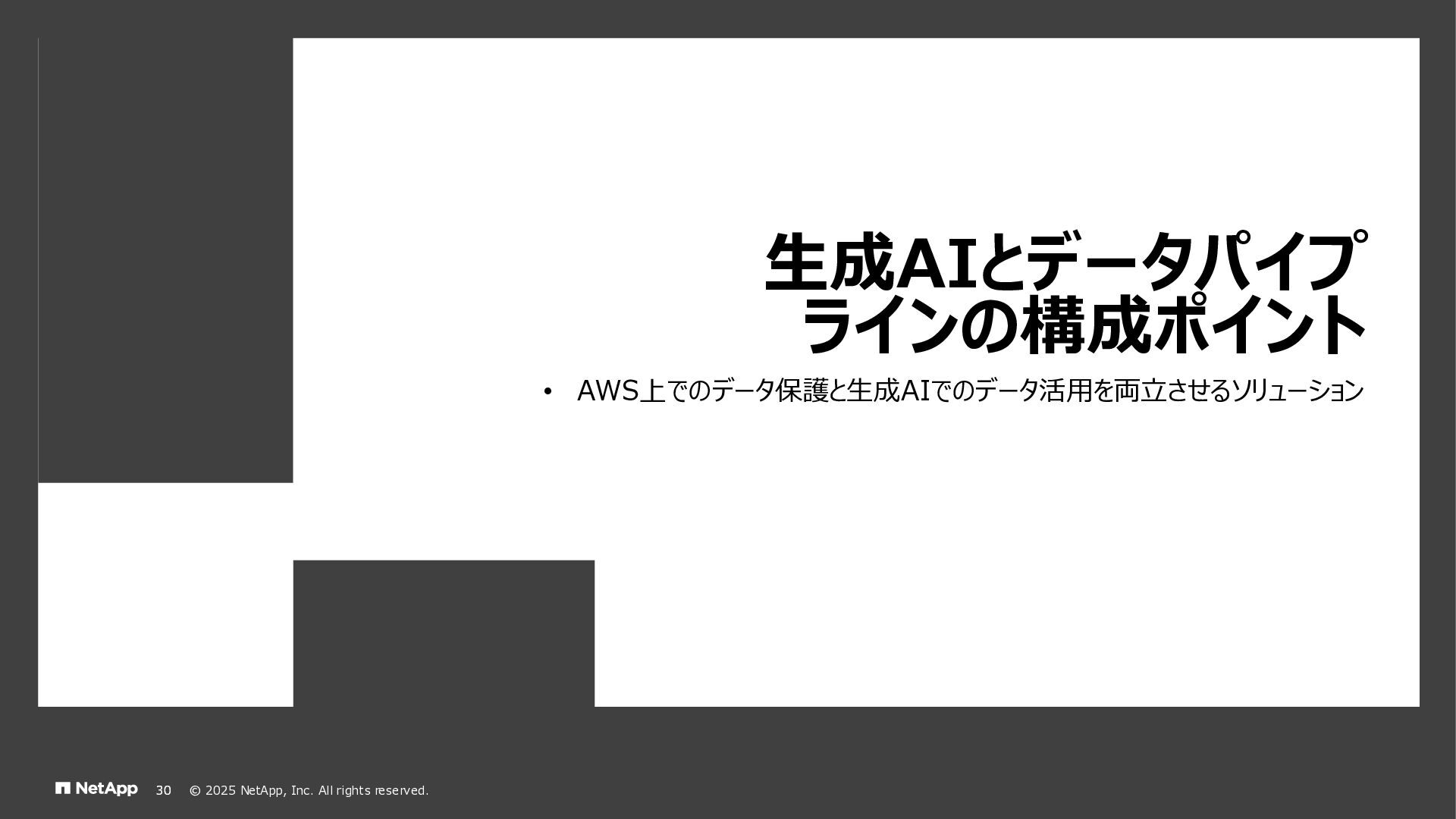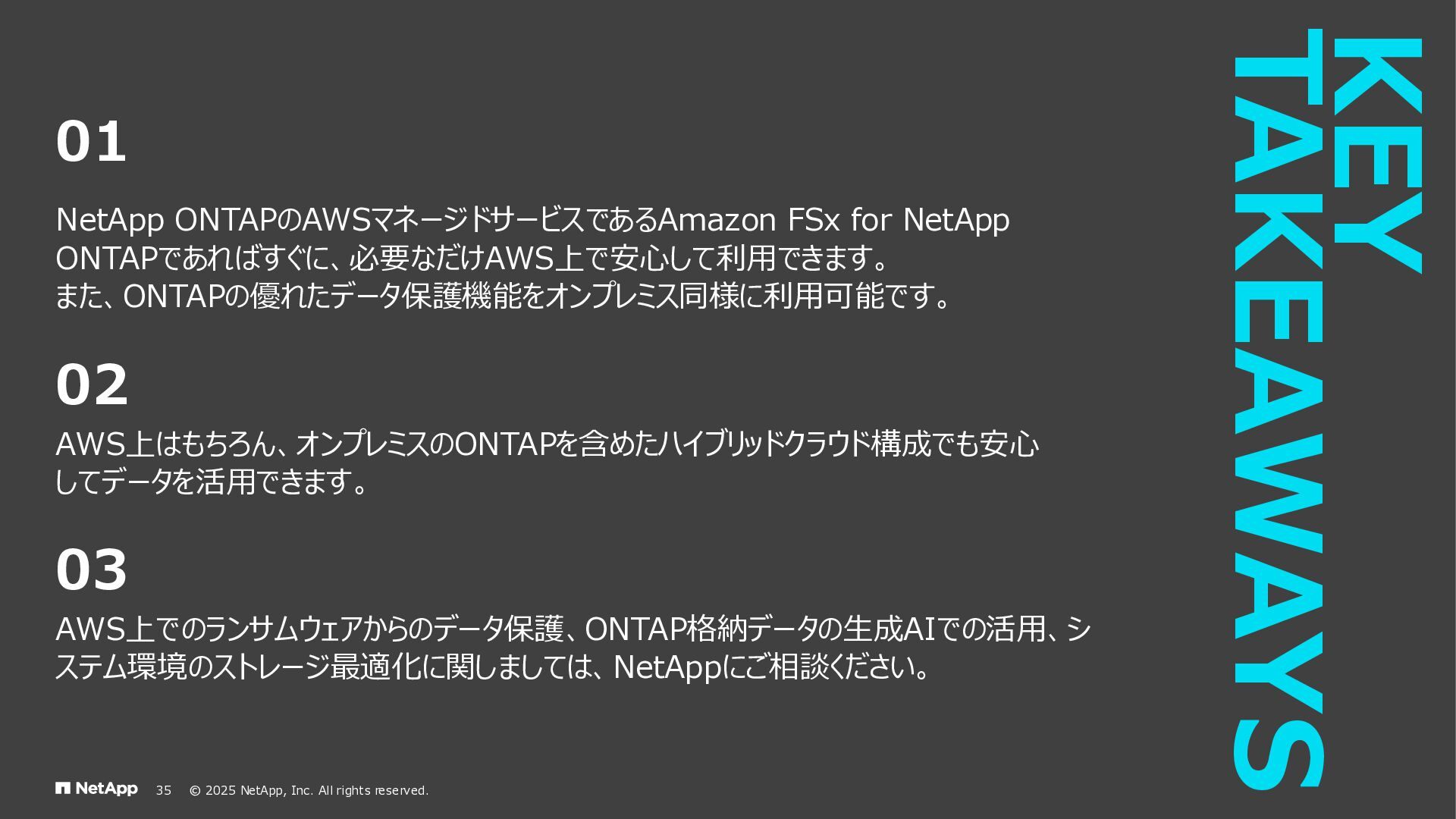 Instinct社がオンプレミスのONTAPに加えて、 Deep Instinct DSX for CloudがFSx for ONTAPをサポート。 これにより、VirusScanサーバと連携ができるAntiVirus機能を介して、AWSそしてハイブリッドクラウド環境でのマルウェア、ウィ ルスに対するデータの保護が一貫して実現できます。 • Deep InstinctはAIを活用する事で、未知のウイルスに対しても予測し防御しますので、次世代型アンチウイルスや EDR(Endpoint Detection and Response)をすり抜けるようなマルウェアに対しても高い検知率で予防が可能となり、 感染予防対策を重視した運用が可能に。 Deep InstinctがFSx for ONTAPをサポート!AIによるマルウェアの検知 引用:https://docs.aws.amazon.com/ja_jp/fsx/latest/ONTAPGuide/using- vscan.html 引用:https://www.deepinstinct.com/ja/dsx/dsx-cloud-amazon-fsx-netapp