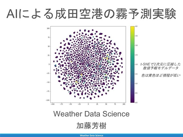 D / ( B + C + D ) このうち適当に予測しても当たってしまう 割合を考慮したものをETSと呼ぶ •バイアススコア(BI) = ( C + D ) / ( B + D ) 空振り・見逃しのバランスを見る 【ベンチマーク】 視程ガイダンスの精度:成田空港はだいたいTS = 0.08 (±0.02) (数値予報課報告・別冊第64号より引用、正しくはETS) ここで霧かどうかの閾値は 1600m となっている → 分析[1]の閾値も 1600m とする 予報 0(なし) 1(あり) 実況 0(なし) A C 1(あり) B D