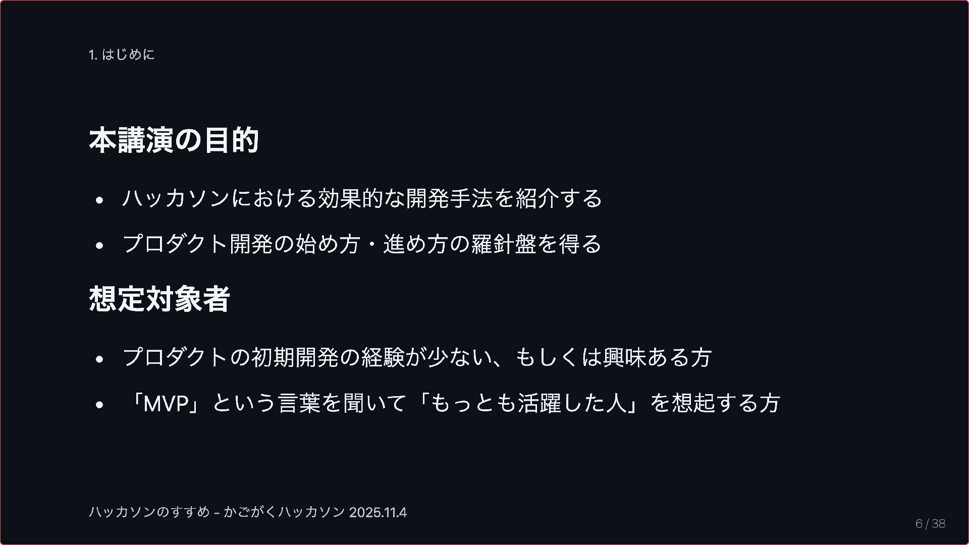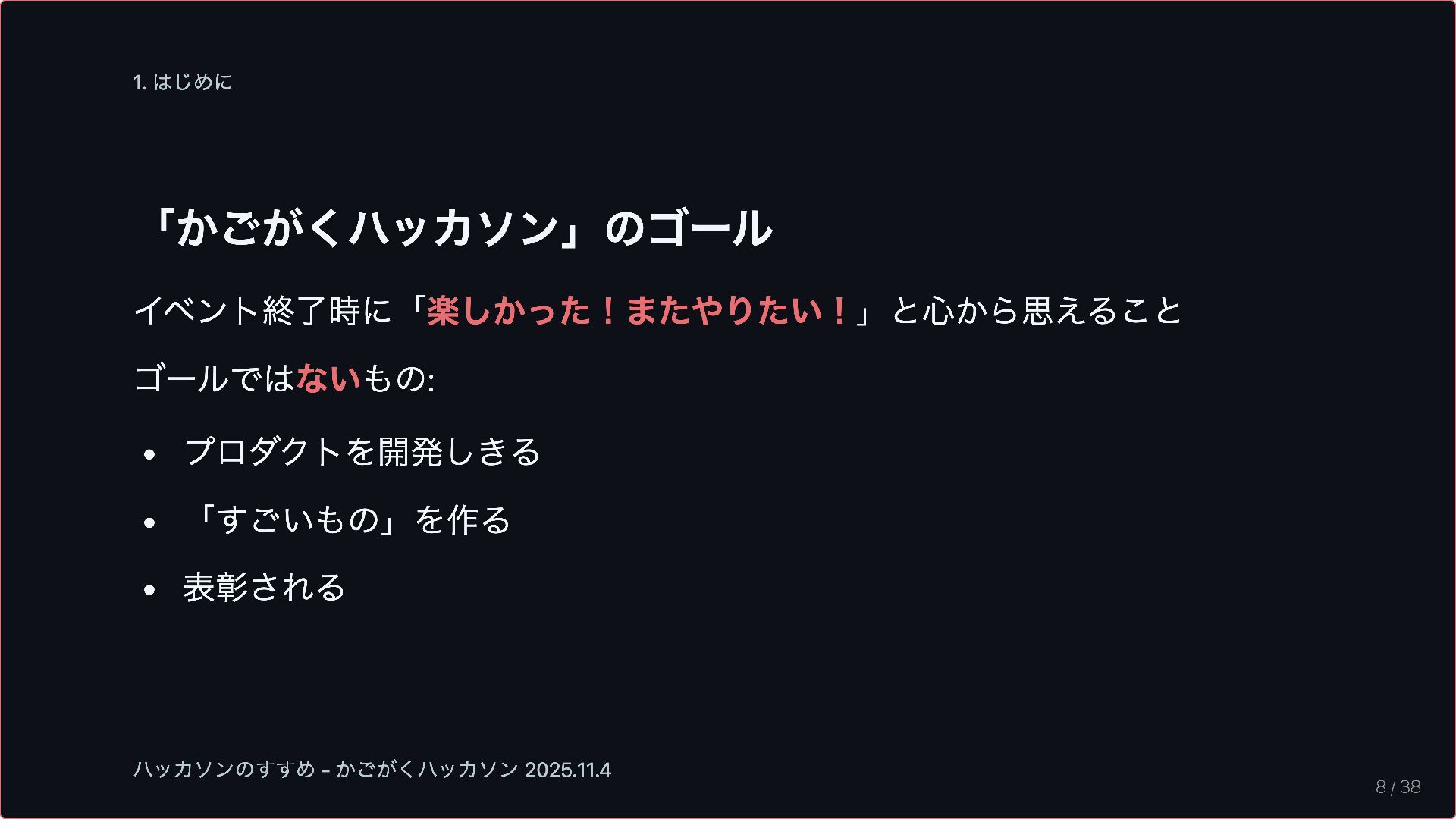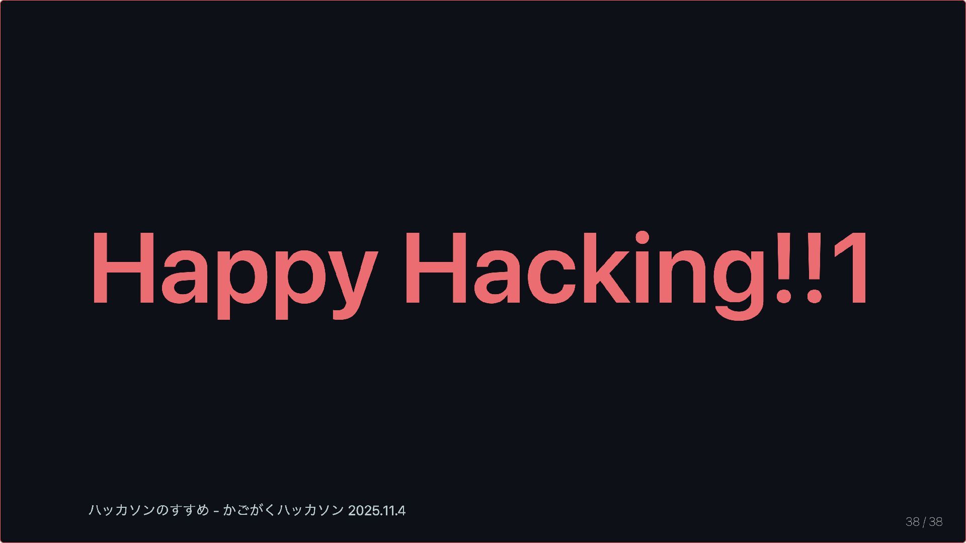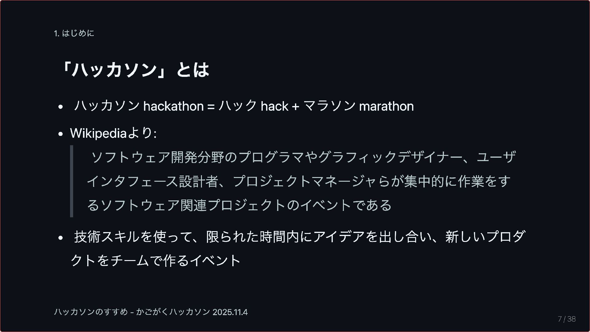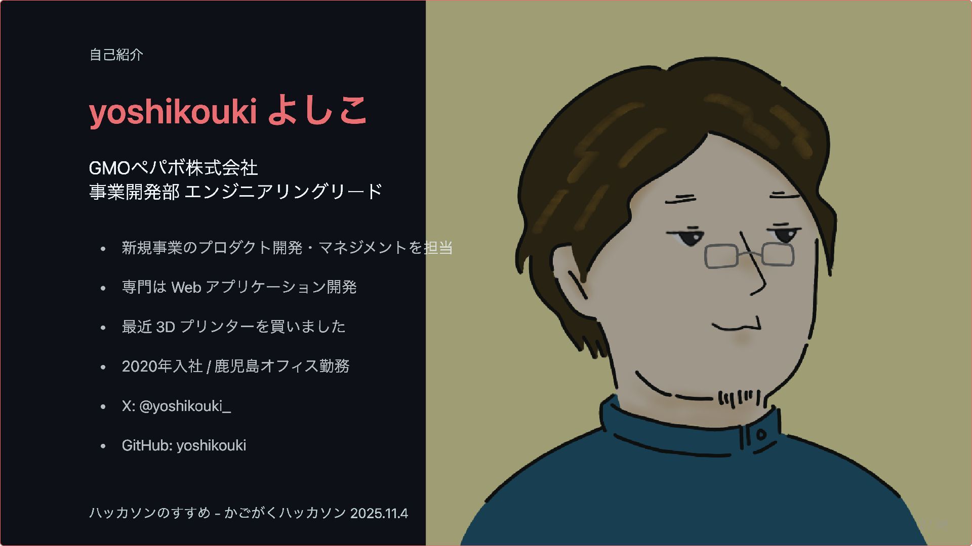 2025/10/04 (土) に開催した鹿児島学生向けハッカソン「かごがくハッカソン2025 byGMOペパボ 」の開会式後に開催したハッカソンのススメの資料です