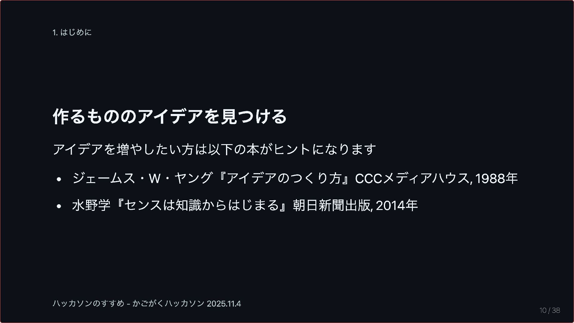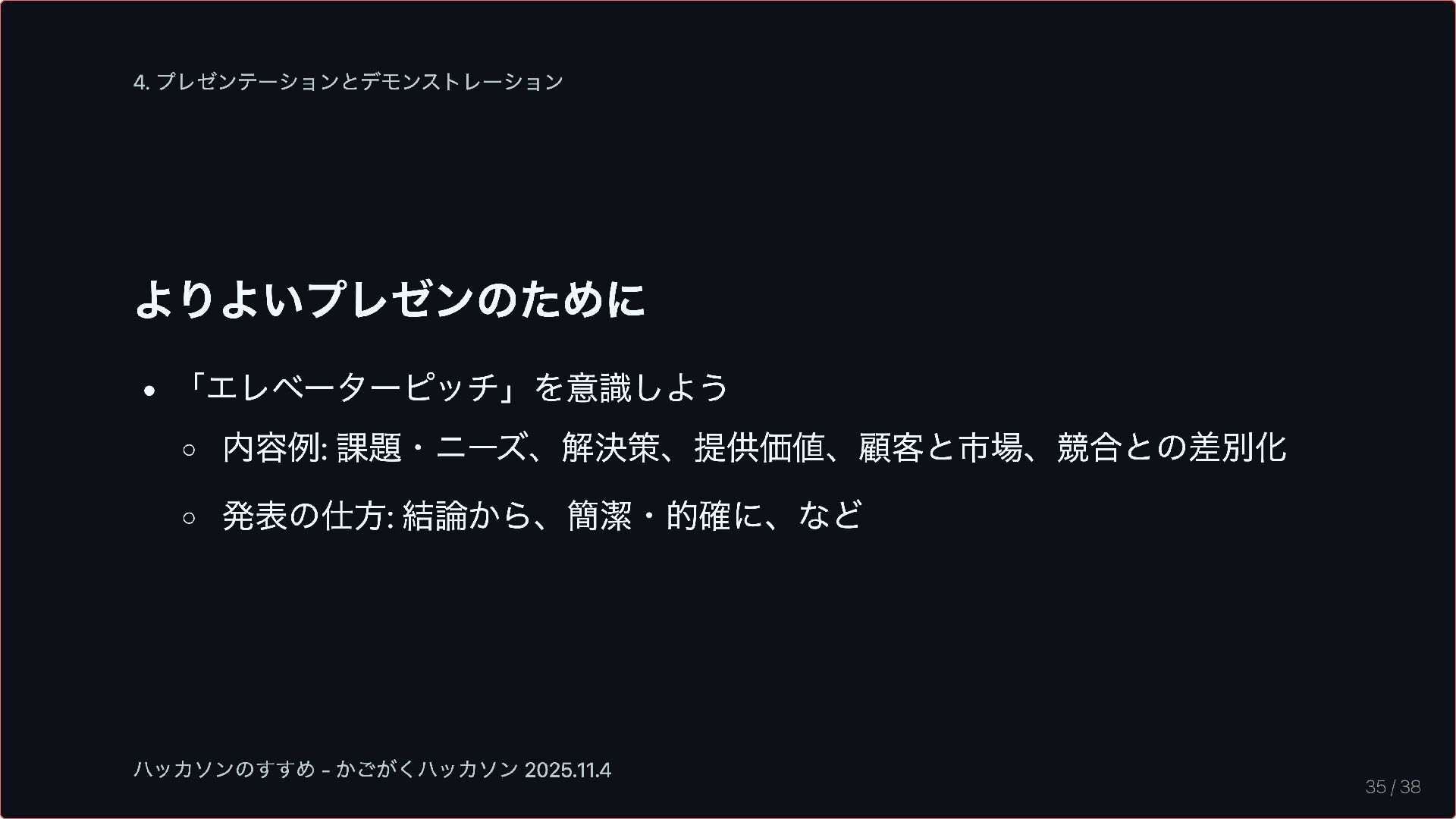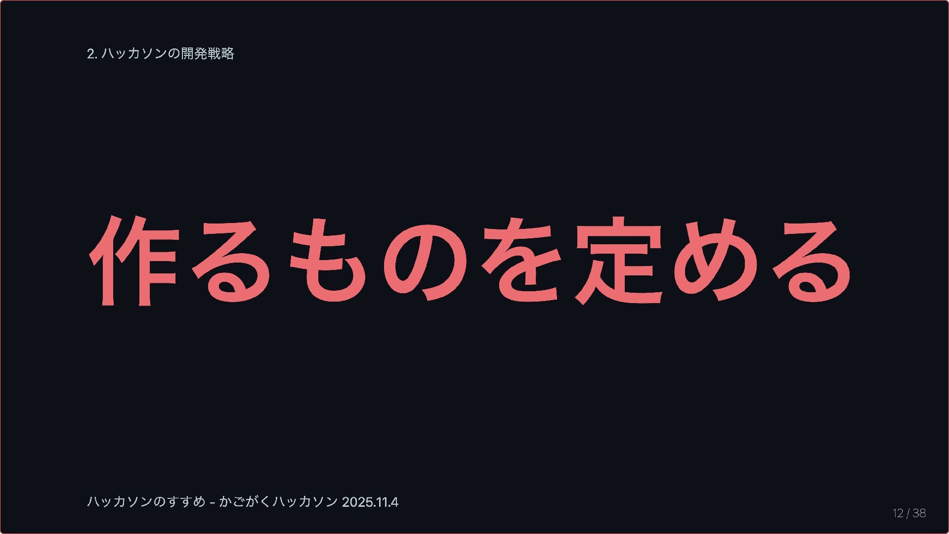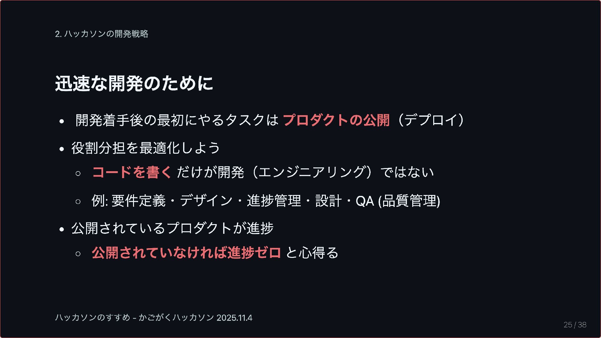 2025/10/04 (土) に開催した鹿児島学生向けハッカソン「かごがくハッカソン2025 byGMOペパボ 」の開会式後に開催したハッカソンのススメの資料です