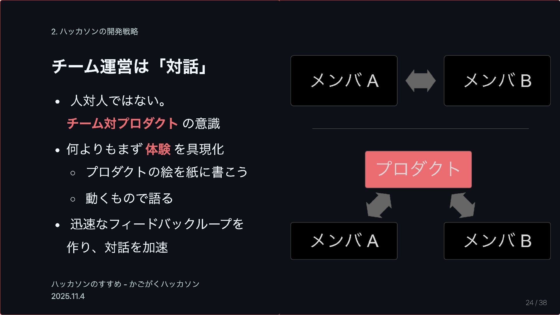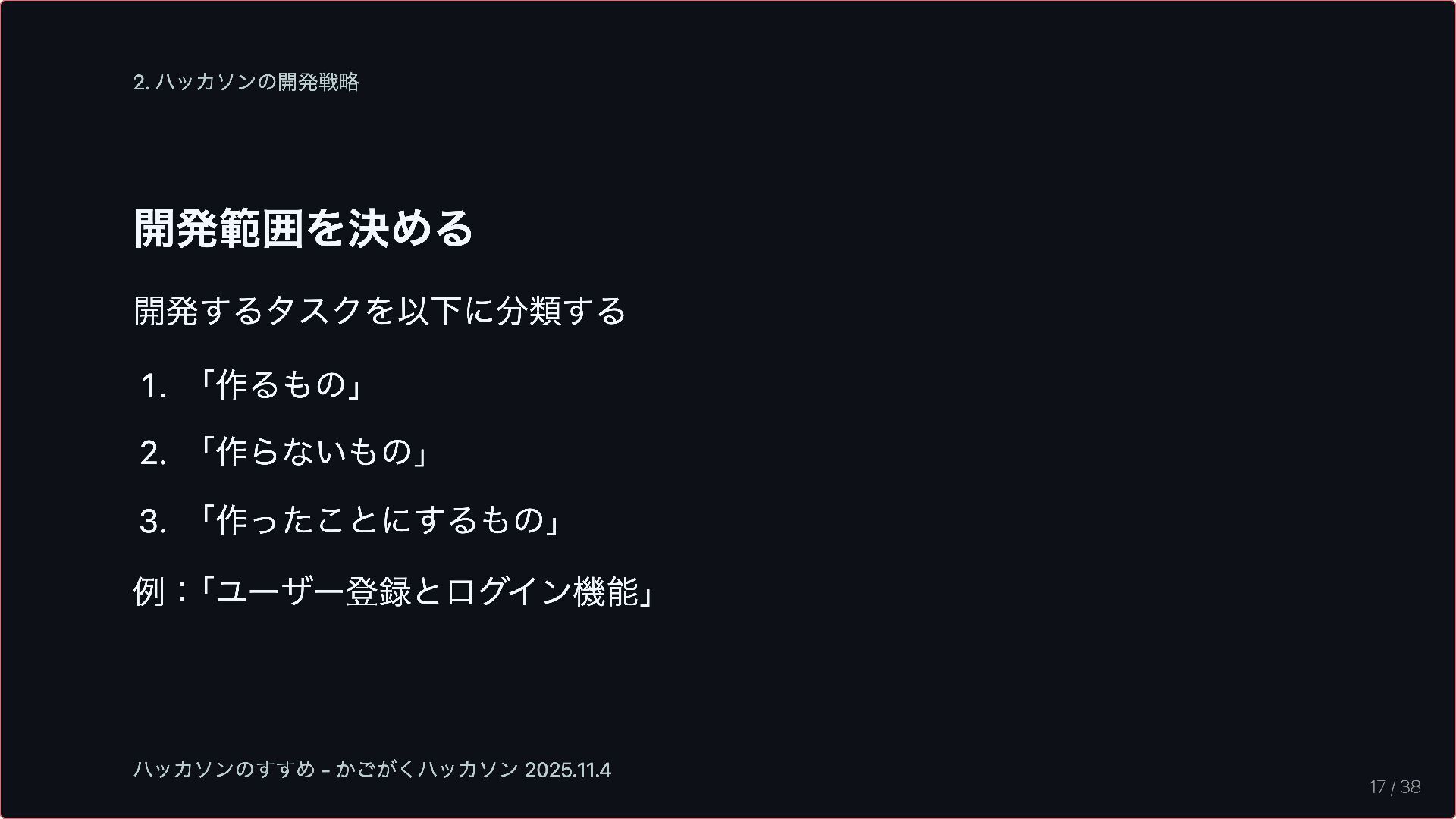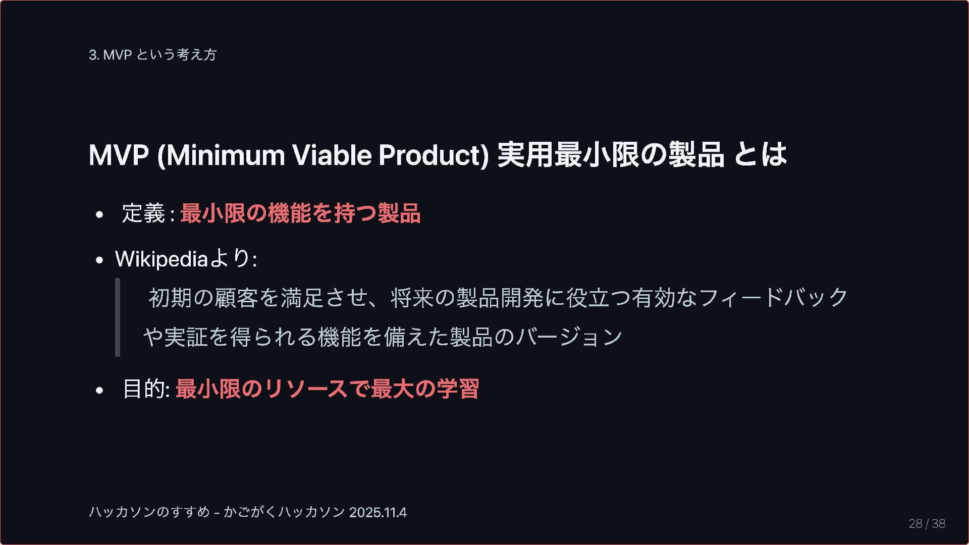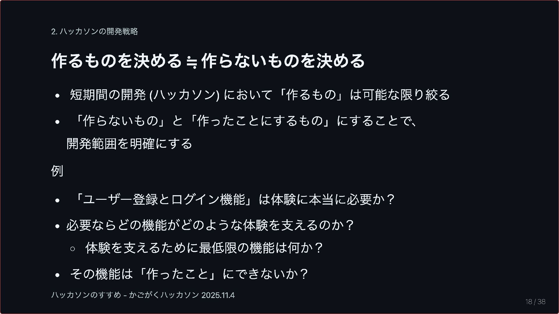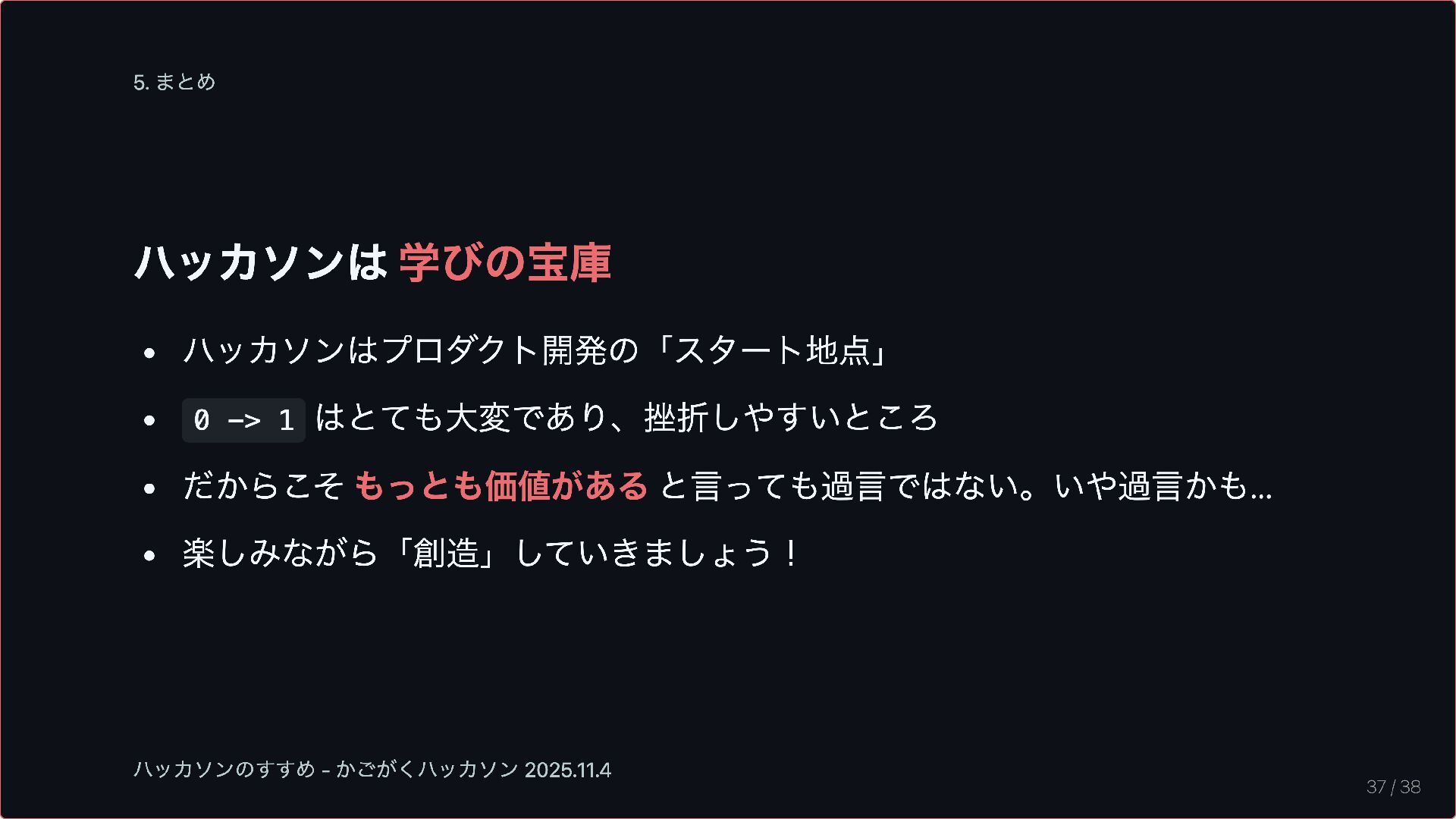 2025/10/04 (土) に開催した鹿児島学生向けハッカソン「かごがくハッカソン2025 byGMOペパボ 」の開会式後に開催したハッカソンのススメの資料です