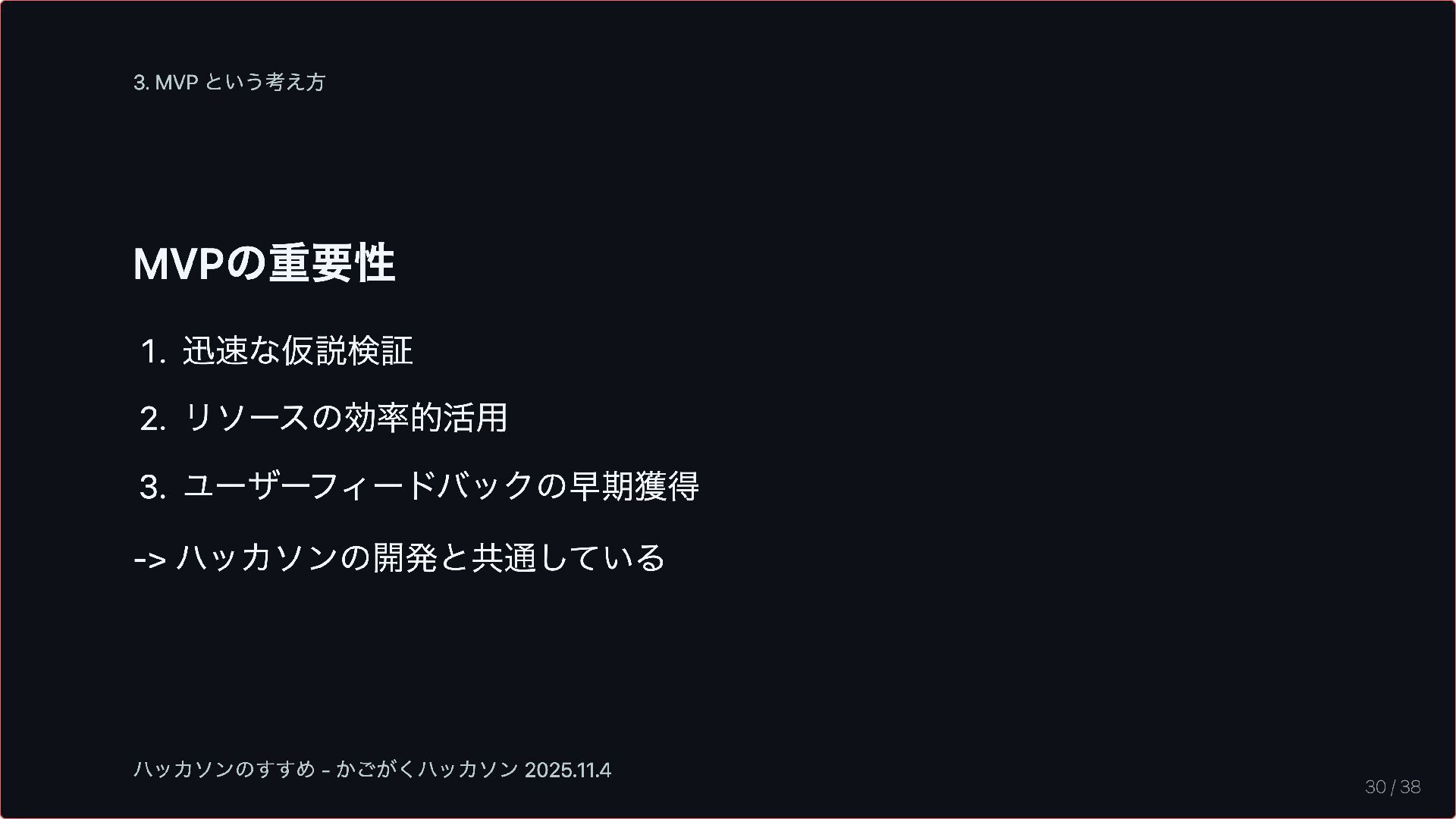 ハッカソンが初めてな学生の方でも進め方に迷わないように、MVPの考え方などを講義しました