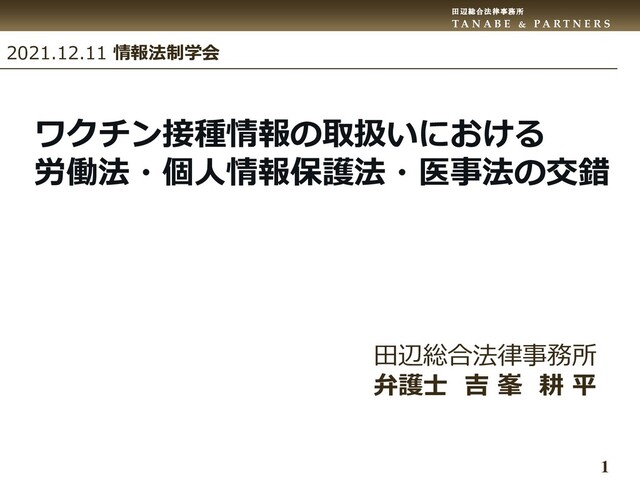 R T N E R S 17 要配慮個人情報にあたるか 該当する可能性があるとする説 吉田肇「ワクチン接種における企業対応に関する法的留 意点」労務事情1430号11頁 畔山亨「労働者のワクチン接種歴の確認は個人情報やプ ライバシーの観点に注意」労働基準広報2075号25頁 法2条3項 ワクチン接種情報は「病歴」ではない 政令2条2号 「疾病の予防及び早期発見のための健康診断 その他の検査」(健康診断等)ではない 予診は禁忌者の識別が目的 政令2条3号 健康診断等や心身の変化に基づく診療(注射) ではない そもそも病歴、検査情報、診療情報が「不当な差別、偏 見その他の不利益」を招くおそれがあるという趣旨が ワクチン接種情報には当てはまらない 非該当が自然とする説 影島広泰「ワクチン接種情報の取扱いにおける問題意 識」NBL1204号1頁