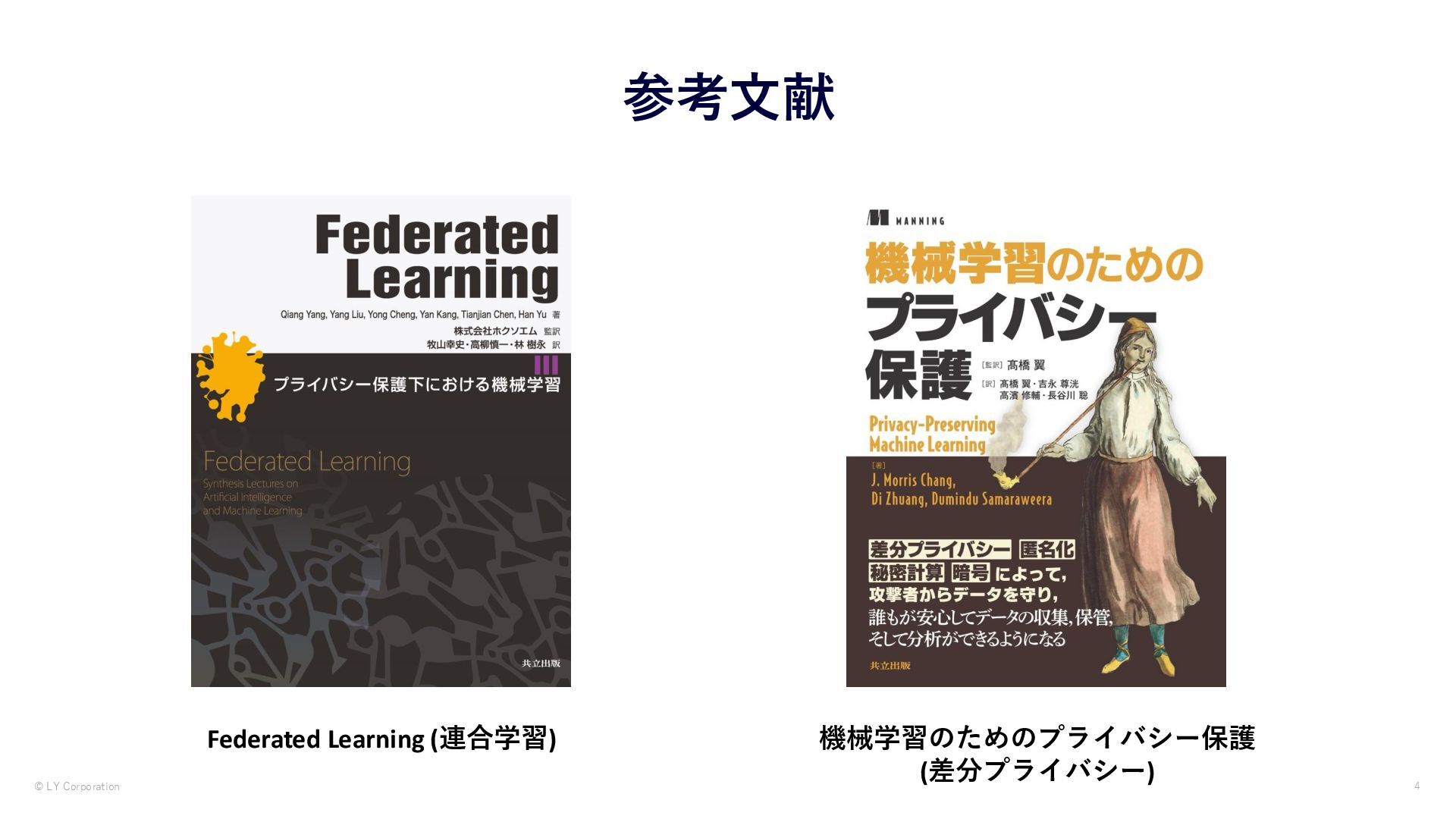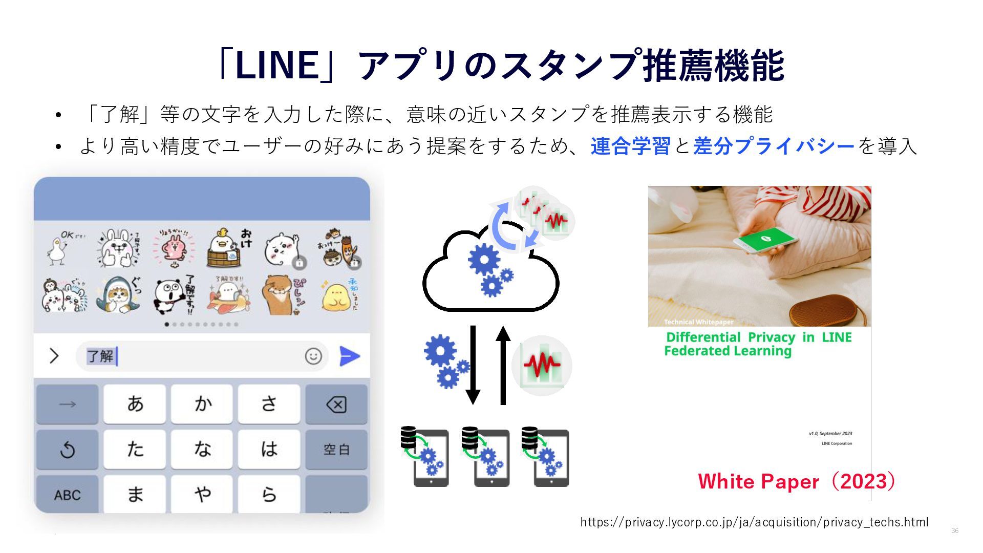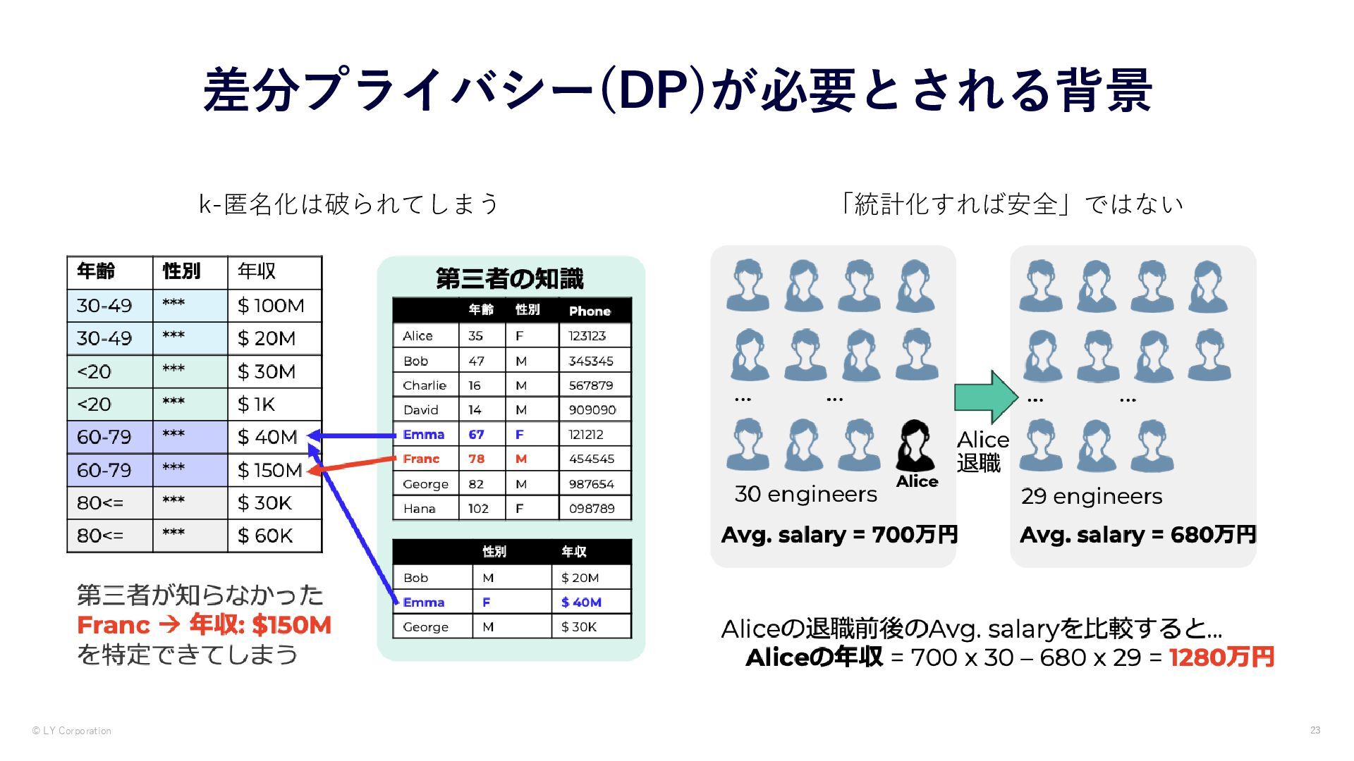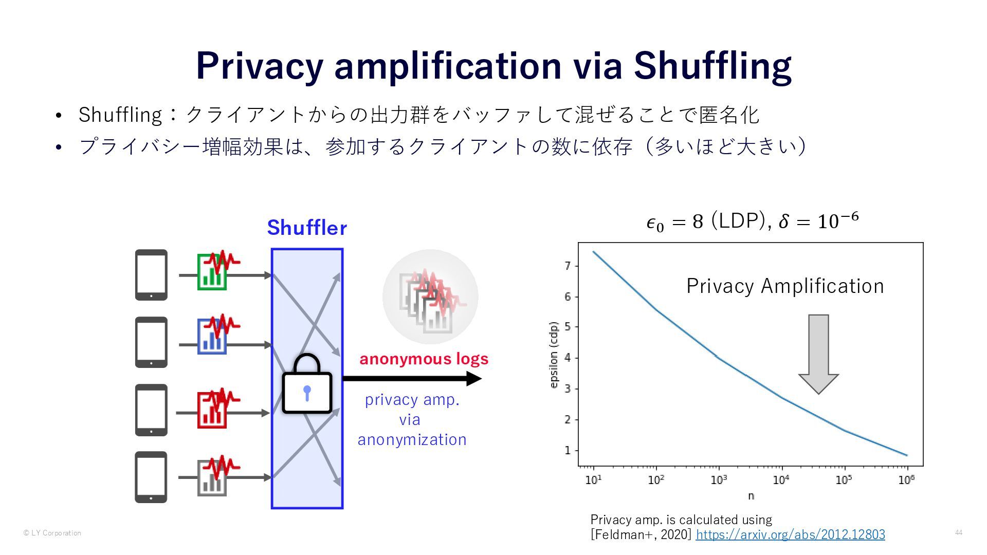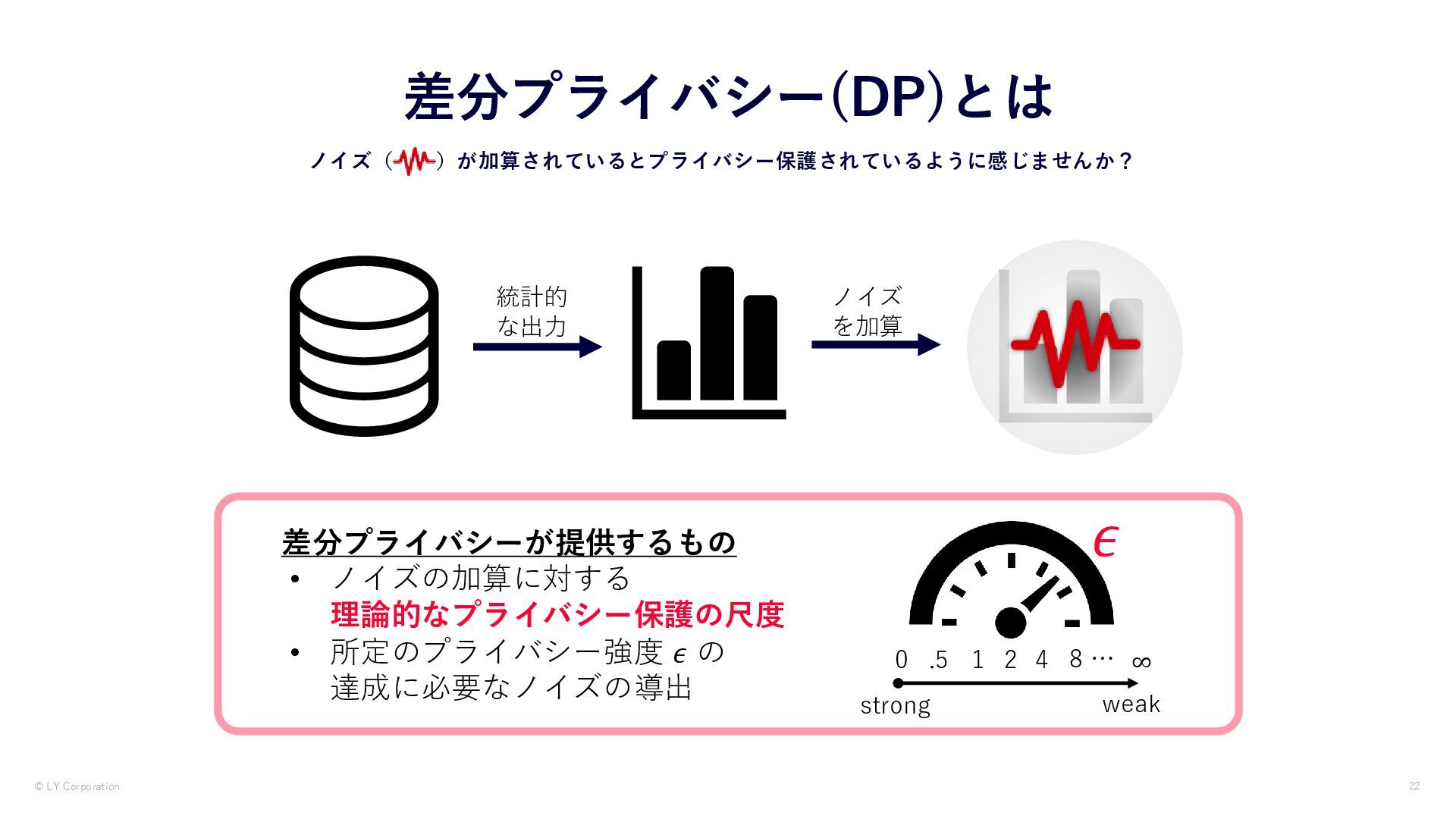 𝒟 → 𝒮 が 𝜖, 𝛿 -DP を満たすとは、隣接データベース 𝐷, 𝐷′ ∈ 𝒟 および任意の出力の集合 𝑆 ⊆ 𝒮 に対して以下が成り立つときである Database 𝑫 Output 𝜖 0 ∞ .5 1 2 strong weak 4 8 … Pr ℳ 𝐷 ∈ 𝑆 ≤ exp 𝜖 Pr ℳ 𝐷′ ∈ 𝑆 + 𝛿 ℳ 𝑫′: adjacent of 𝑫 ℳ (𝜖 ≥ 0, 𝛿 ∈ 0,1 ) 入力が変化しても出力にはほとんど(exp 𝜖 程度しか)影響がない Dwork. Differential privacy. ICALP, 2006.