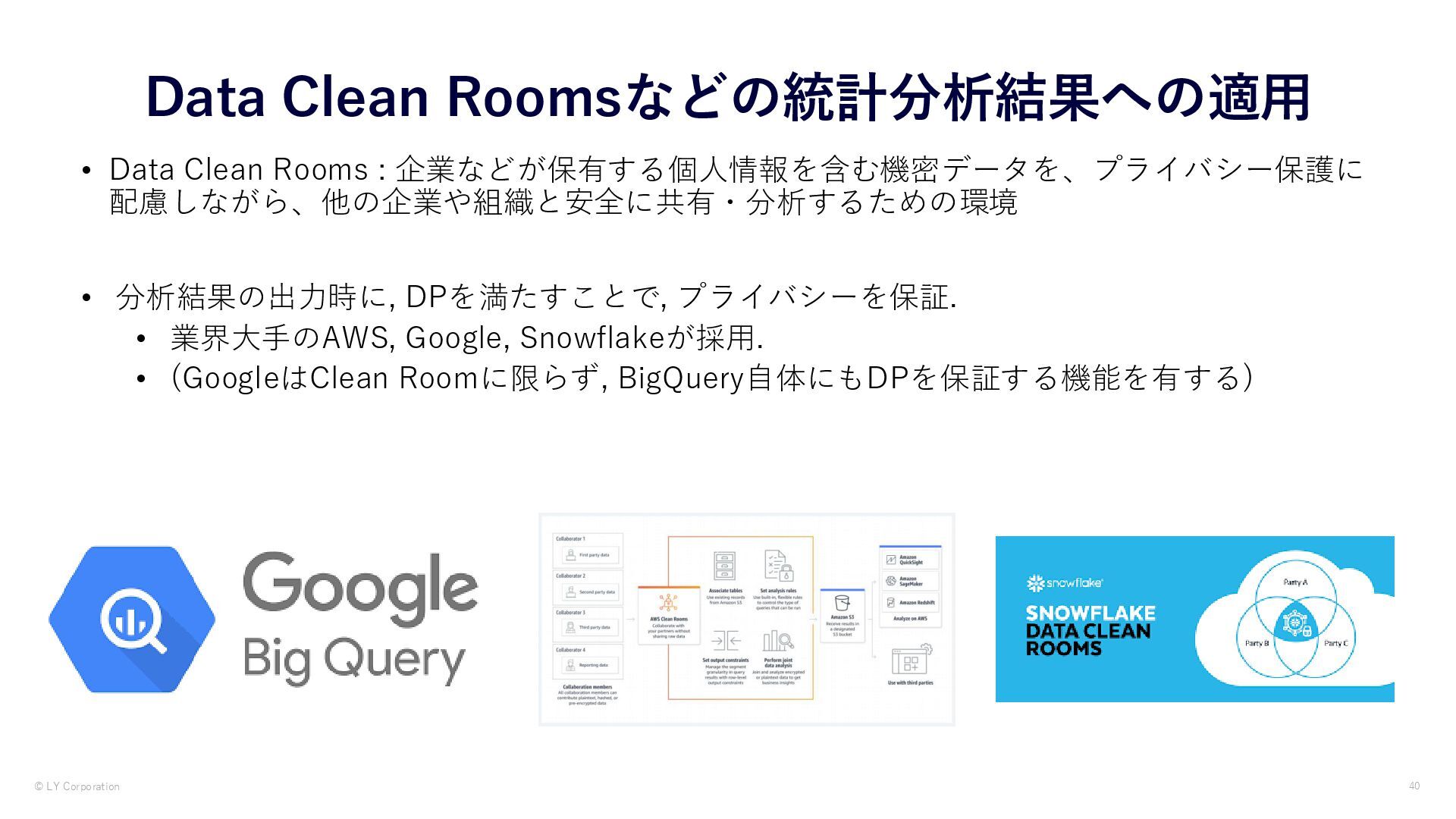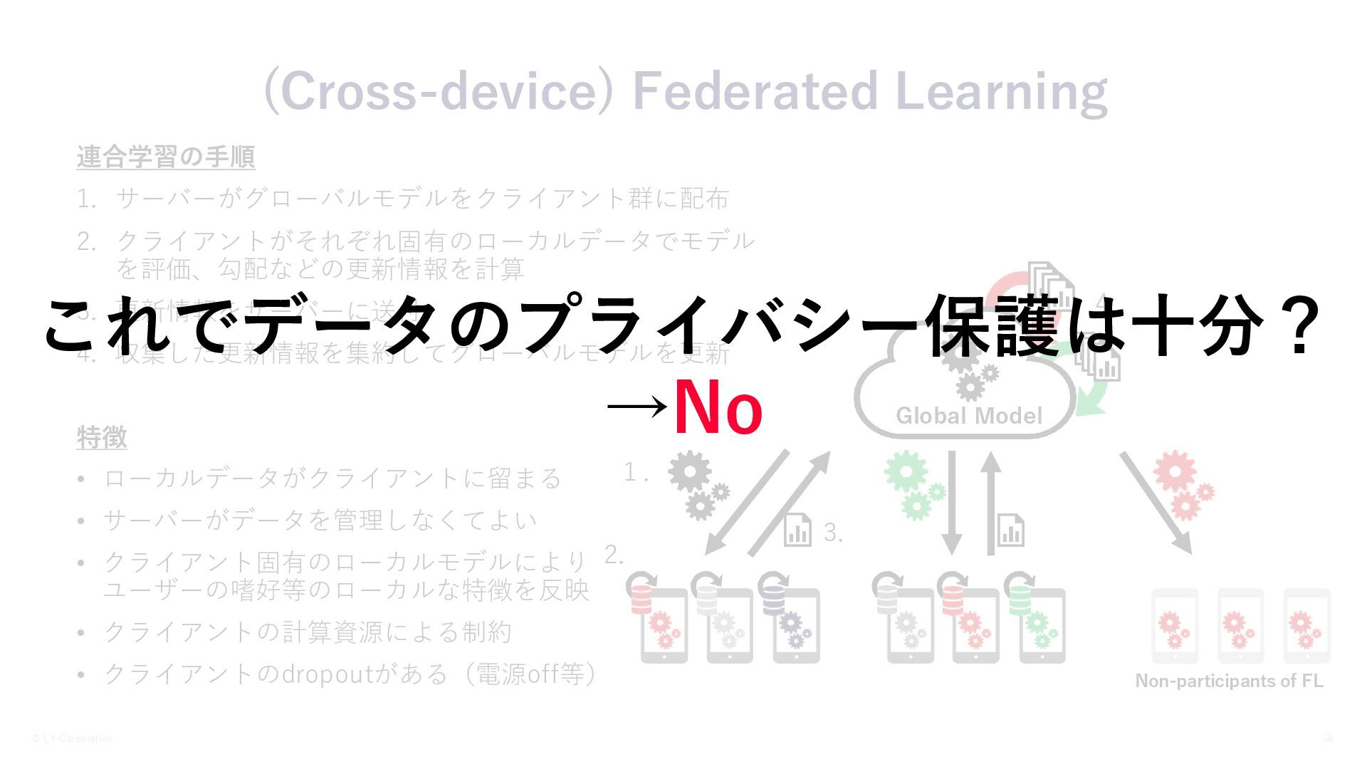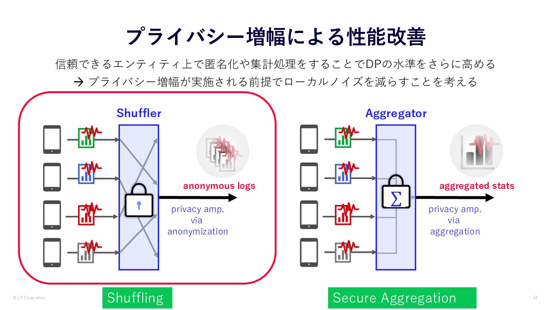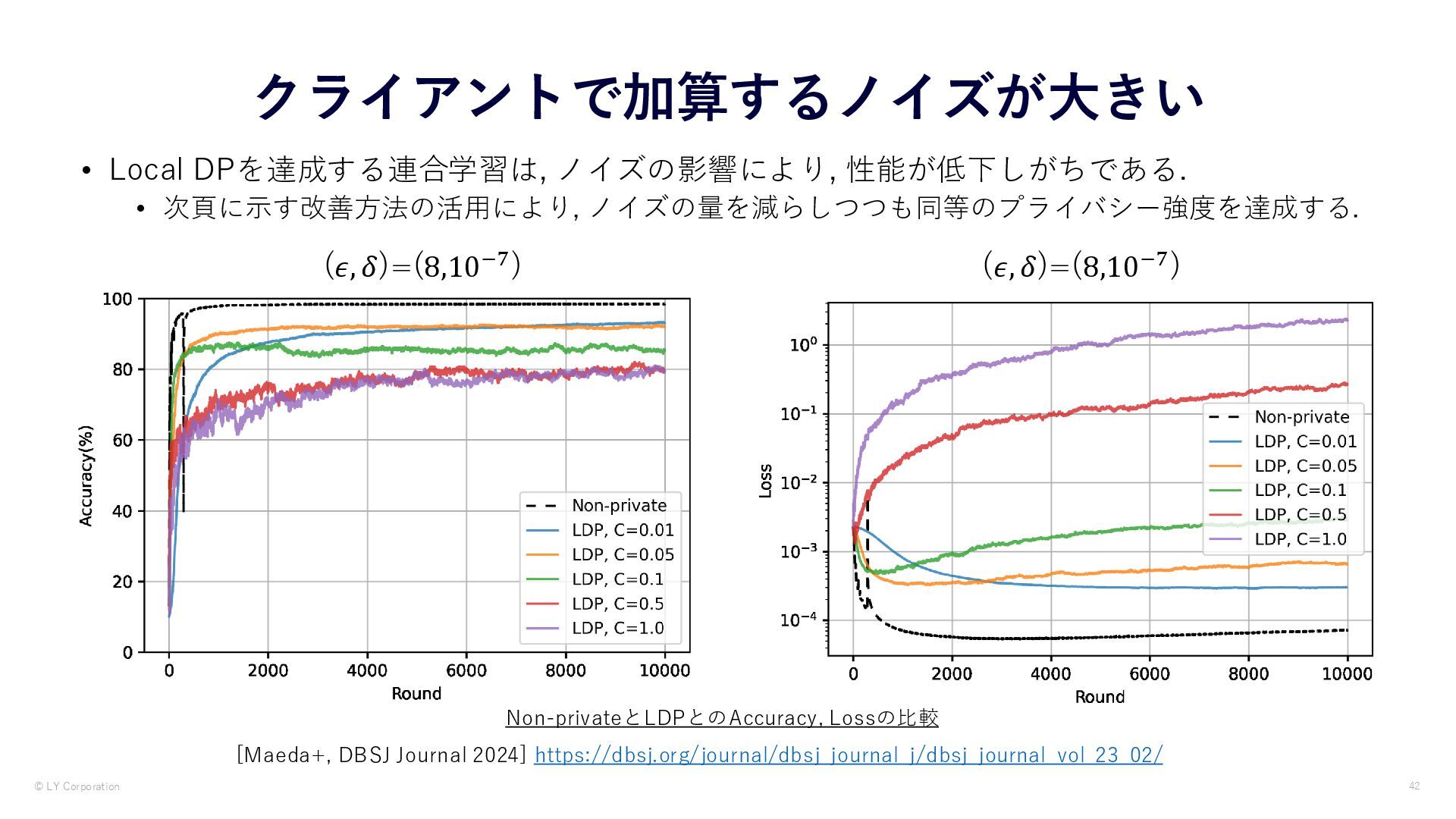 𝒟 → 𝒮 が 𝜖, 𝛿 -DP を満たすとは、隣接データベース 𝐷, 𝐷′ ∈ 𝒟 および任意の出力の集合 𝑆 ⊆ 𝒮 に対して以下が成り立つときである Database 𝑫 Output 𝜖 0 ∞ .5 1 2 strong weak 4 8 … Pr ℳ 𝐷 ∈ 𝑆 ≤ exp 𝜖 Pr ℳ 𝐷′ ∈ 𝑆 + 𝛿 ℳ 𝑫′: adjacent of 𝑫 ℳ (𝜖 ≥ 0, 𝛿 ∈ 0,1 ) 入力が変化しても出力にはほとんど(exp 𝜖 程度しか)影響がない Dwork. Differential privacy. ICALP, 2006.