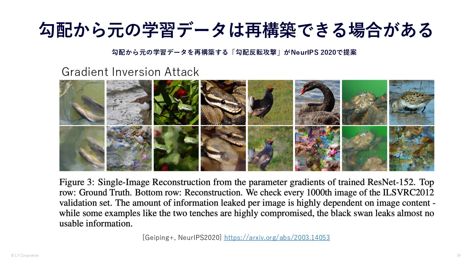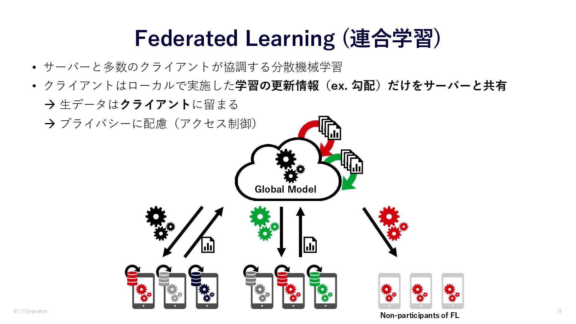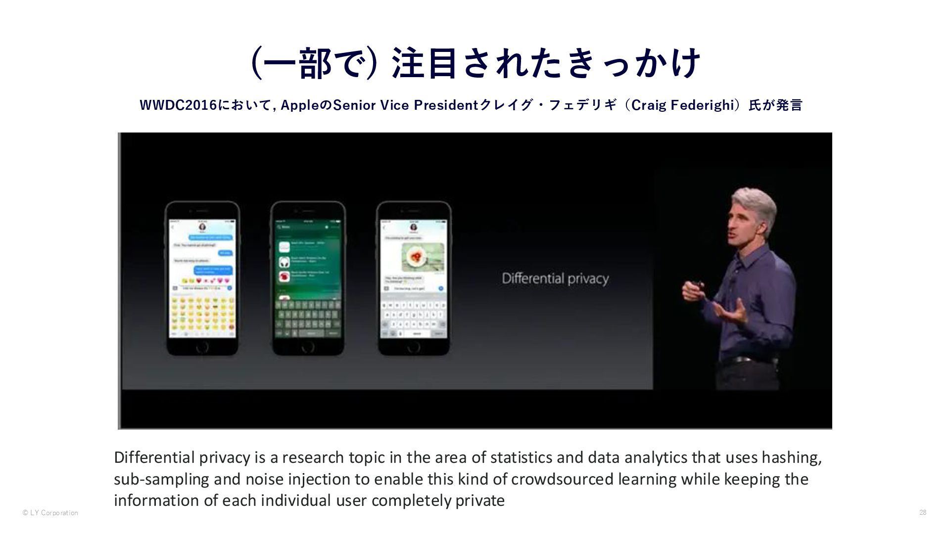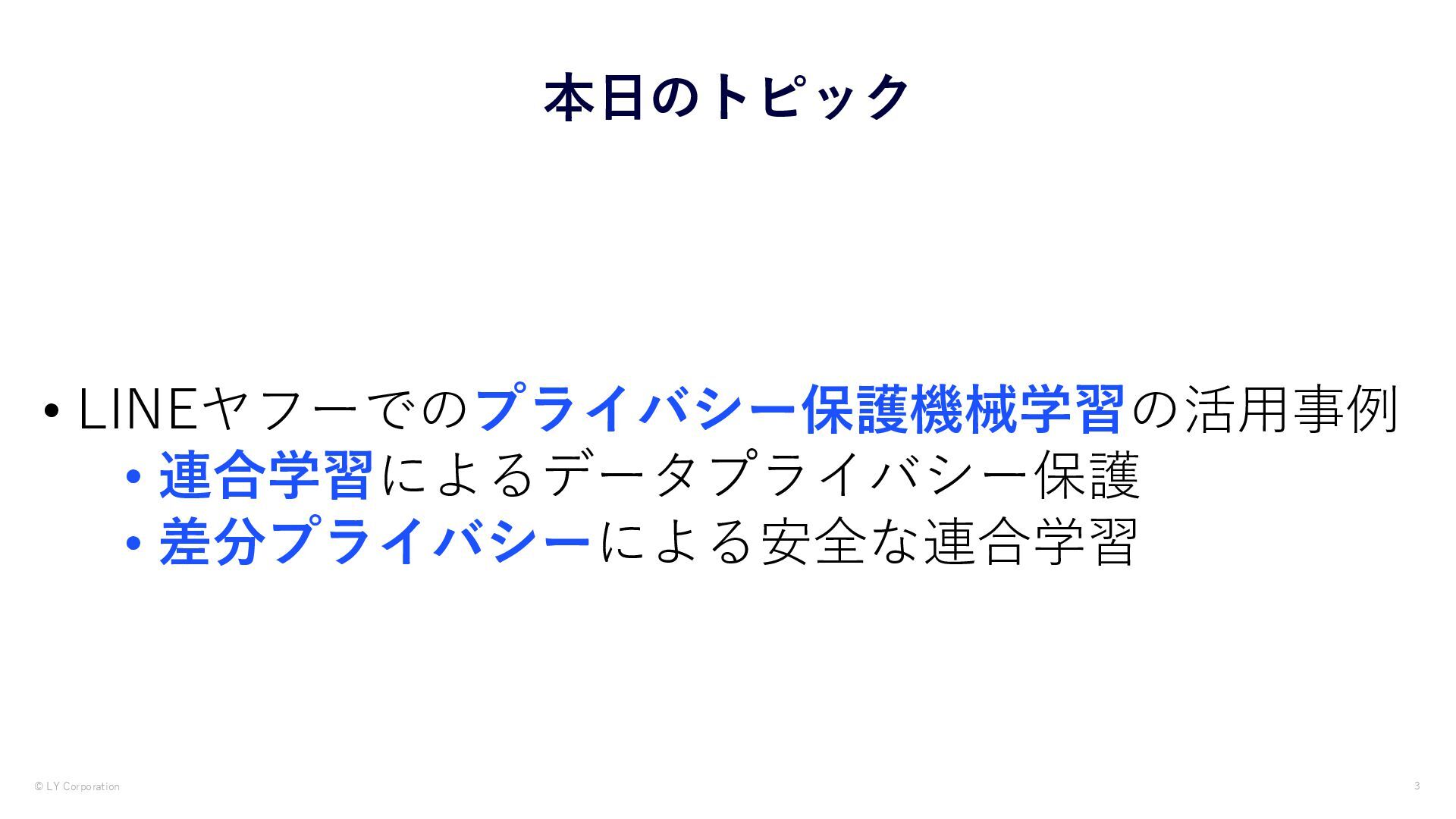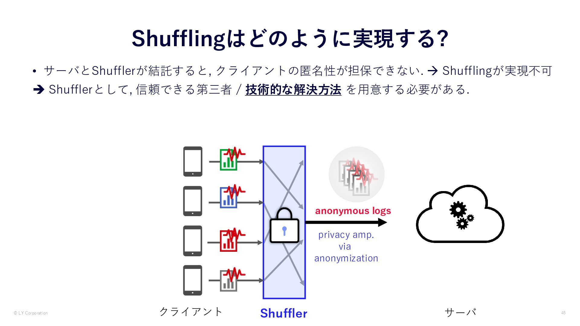 𝒟 → 𝒮 が 𝜖, 𝛿 -DP を満たすとは、隣接データベース 𝐷, 𝐷′ ∈ 𝒟 および任意の出力の集合 𝑆 ⊆ 𝒮 に対して以下が成り立つときである Database 𝑫 Output 𝜖 0 ∞ .5 1 2 strong weak 4 8 … Pr ℳ 𝐷 ∈ 𝑆 ≤ exp 𝜖 Pr ℳ 𝐷′ ∈ 𝑆 + 𝛿 ℳ 𝑫′: adjacent of 𝑫 ℳ (𝜖 ≥ 0, 𝛿 ∈ 0,1 ) 入力が変化しても出力にはほとんど(exp 𝜖 程度しか)影響がない Dwork. Differential privacy. ICALP, 2006.
