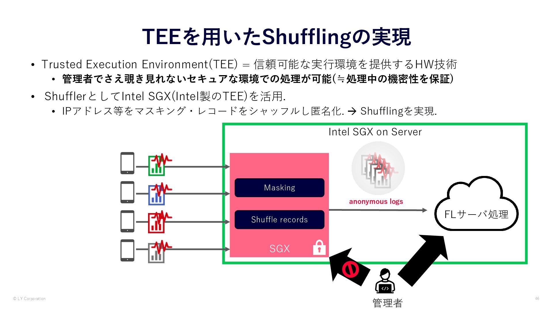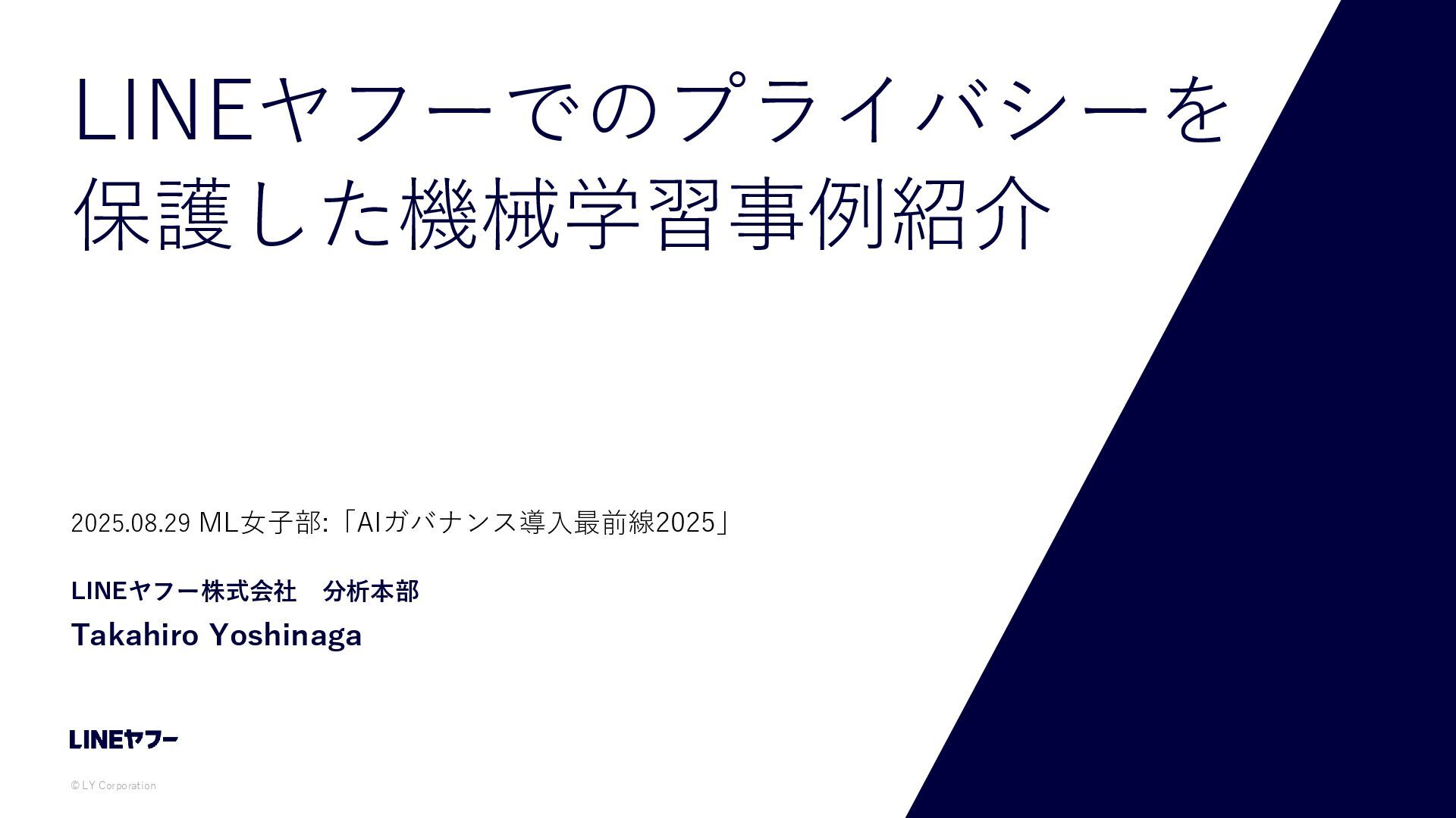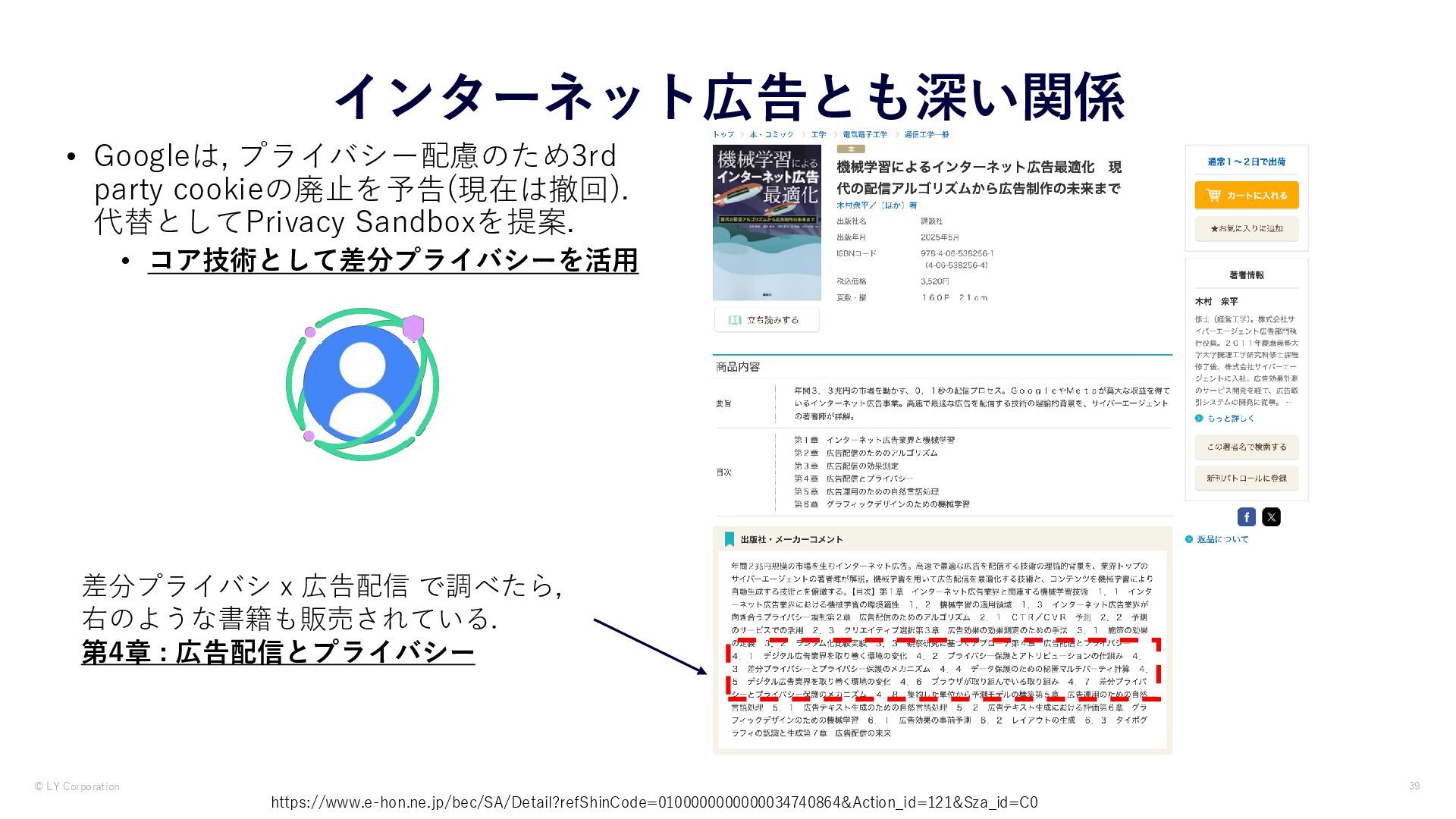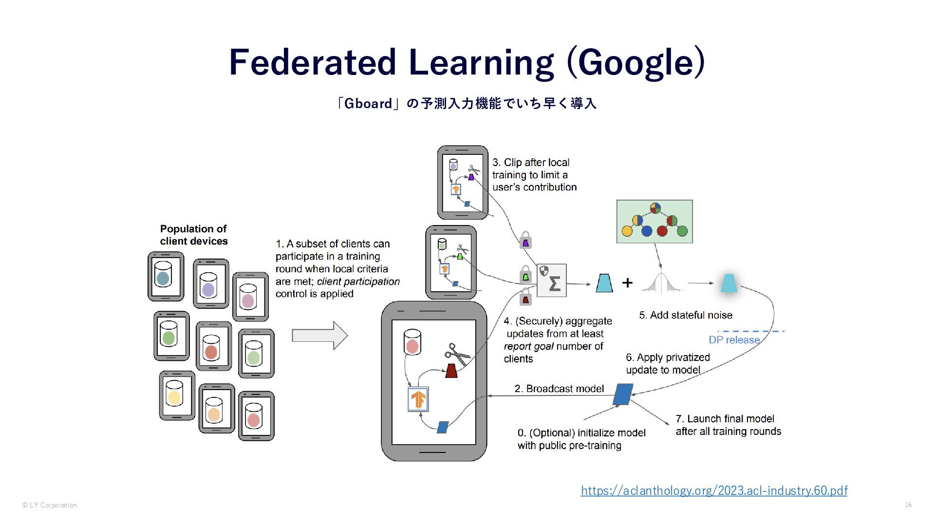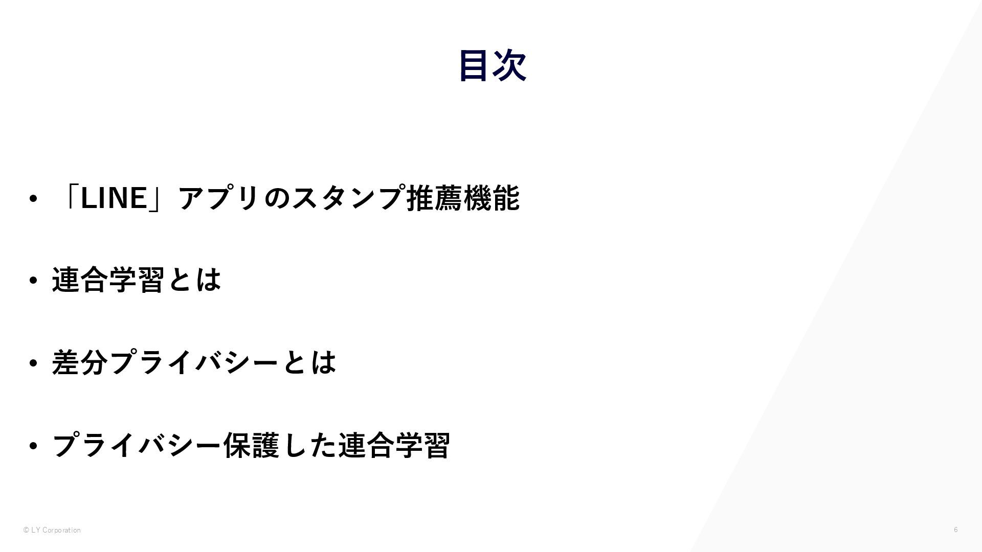 𝒟 → 𝒮 が 𝜖, 𝛿 -DP を満たすとは、隣接データベース 𝐷, 𝐷′ ∈ 𝒟 および任意の出力の集合 𝑆 ⊆ 𝒮 に対して以下が成り立つときである Database 𝑫 Output 𝜖 0 ∞ .5 1 2 strong weak 4 8 … Pr ℳ 𝐷 ∈ 𝑆 ≤ exp 𝜖 Pr ℳ 𝐷′ ∈ 𝑆 + 𝛿 ℳ 𝑫′: adjacent of 𝑫 ℳ (𝜖 ≥ 0, 𝛿 ∈ 0,1 ) 入力が変化しても出力にはほとんど(exp 𝜖 程度しか)影響がない Dwork. Differential privacy. ICALP, 2006.