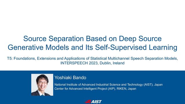 Self-Supervised Learning Yoshiaki Bando National Institute of Advanced Industrial Science and Technology (AIST), Japan Center for Advanced Intelligent Project (AIP), RIKEN, Japan T5: Foundations, Extensions and Applications of Statistical Multichannel Speech Separation Models, INTERSPEECH 2023, Dublin, Ireland