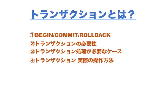 τϥϯβΫγϣϯͷඞཁੑ ᶃBEGIN/COMMIT/ROLLBACK ᶄτϥϯβΫγϣϯͷඞཁੑ ᶅτϥϯβΫγϣϯॲཧ͕ඞཁͳέʔε ᶆτϥϯβΫγϣϯ ࣮ࡍͷૢ࡞ํ๏