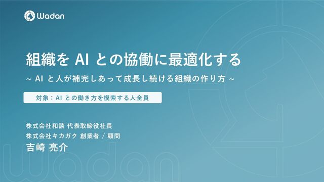 との協働に最適化する 個別最適を改善するためには少なくとも自分の上の階層に関しての理解が必要 End-to-End (E2E) での組織の最適化がこれからのトレンド 経営 人事 開発 採用 育成 カリキュラム作成 → 実施 → ... 市場調査 → プロトタイプ → ... 従来は KPI などの数値に落とした指標で繋がざるを得なかったが、AI の登場により行動を規定する プロセスの手続きを文章化すれば、AI が見て全体通した最適化ができる(筆者は既に地道に改善中) 募集 → 面接 → ... 新規事業 既存事業 機能改善 → 指標計測 → ... この図の階層は便宜上のイメージであり 実際には戦略から全部署や各業務プロセスまで 深く繋いでいく 行動 数値 結果の 一部 リソースの最適化 (ケースバイケースの正体)