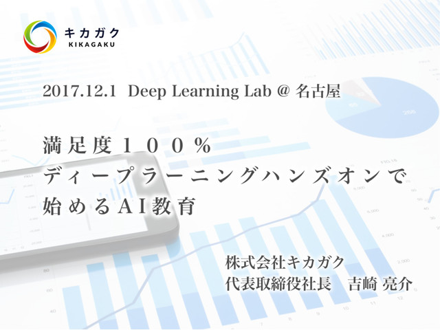 会社紹介 株式会社キカガク 事業内容 機械学習の教育およびコンサルティング 設⽴⽇ 2017年1⽉17⽇ 役員 代表取締役社⻑ 吉﨑 亮介