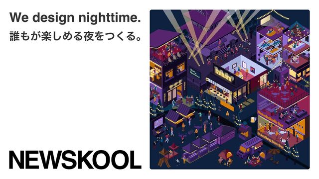 NEWSKOOLは、18:00~6:00までの所謂「ナイトタイム」を横断し、都市の成長や新規事業開発を支援するプロジェクトデザイン会社です。ヒト・モノ・カネの調査をしながら、夜という創造性が高い時間を起点に、次の10年をつ くる持続可能な仕組みを設計しています。 ナイトタイムはまだ完全に整備されておらず、市場創出をおこなうリソースとスペースに余白がある状態です。私たちは、観光やエンターテイメントなどに留まらず、様々な事業領域を横断して人々の暮らしを豊かにしていきます。