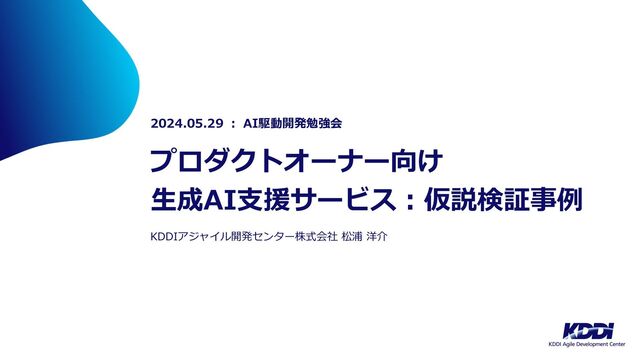 プロダクトオーナー向け ⽣成AI⽀援サービス︓仮説検証事例 2024.05.29 ︓ AI駆動開発勉強会 KDDIアジャイル開発センター株式会社 松浦 洋介