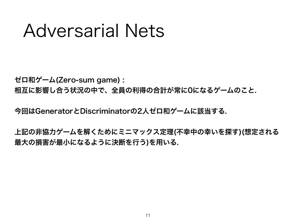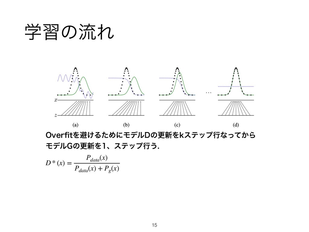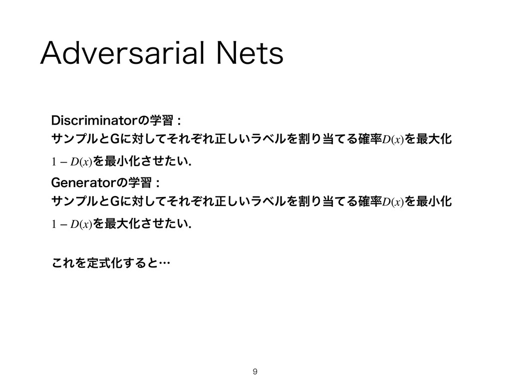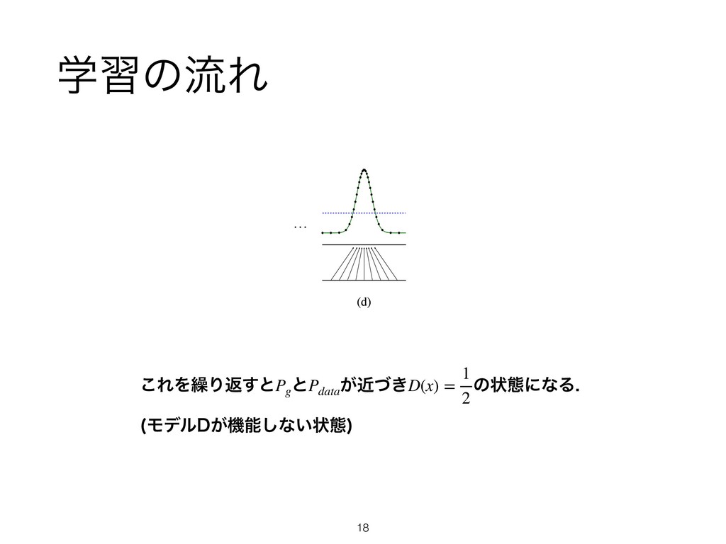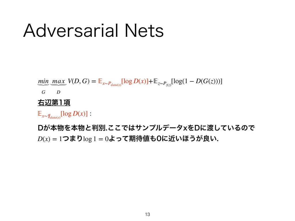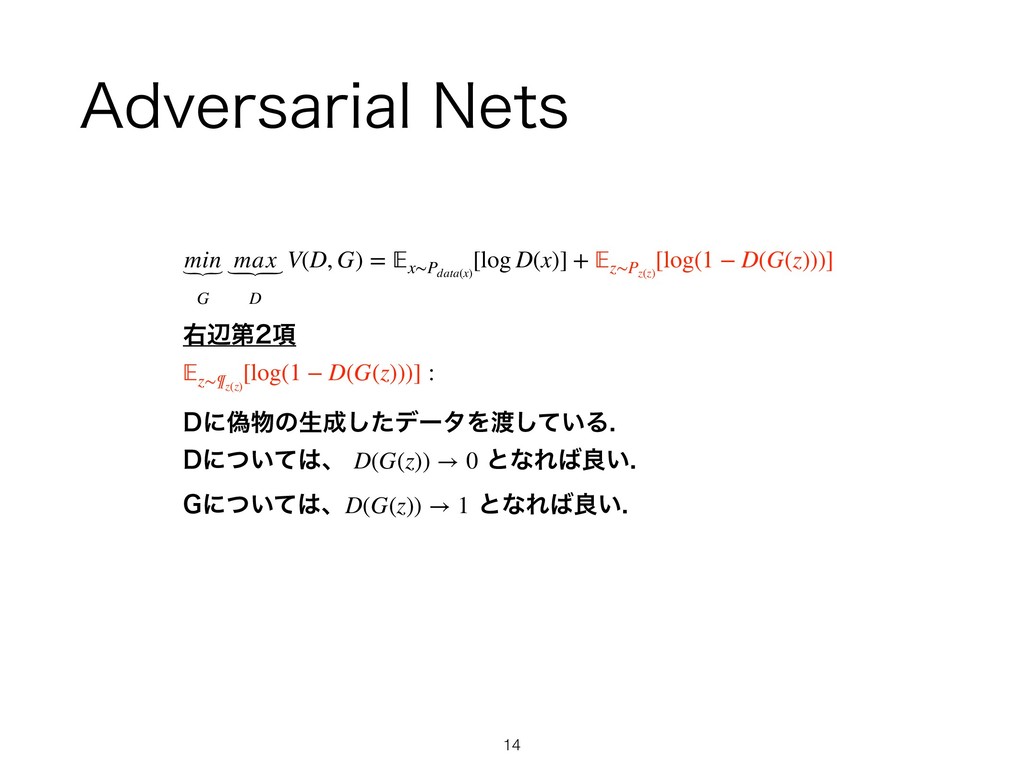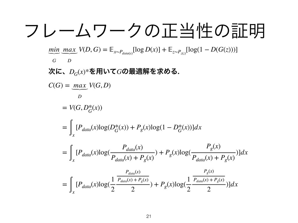 Y Ͱඍ͢Δ min ⏟ G max ⏟ D V(D, G) = x∼Pdata(x) [log D(x)] + z∼Pz(z) [log(1 − D(G(z)))] G D DG (x)* V(D, G) = ∫ x [Pdata (x)log(D(x))]dx + ∫ z [Pz (z)log(1 − D(G(z)))]dz = ∫ x [Pdata (x)log(D(x))]dx + ∫ x [Pg (x)log(1 − D(x))]dx = ∫ x [Pdata (x)log(D(x)) + Pg (x)log(1 − D(x))]dx 19