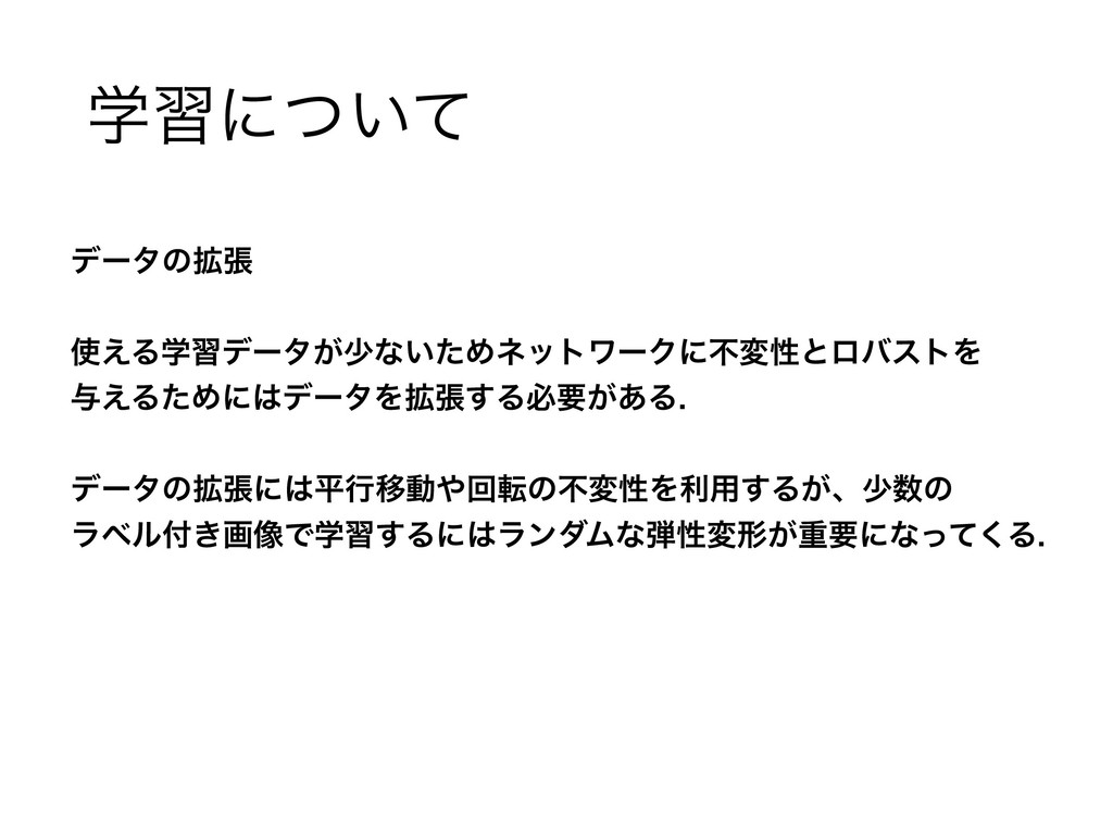 ֶशʹ͍ͭͯ σʔλͷ֦ு ͑Δֶशσʔλ͕গͳ͍ͨΊωοτϫʔΫʹෆมੑͱϩόετΛ ༩͑ΔͨΊʹσʔλΛ֦ு͢Δඞཁ͕͋Δ σʔλͷ֦ுʹฏߦҠಈճసͷෆมੑΛར༻͢Δ͕ɺগͷ ϥϕϧ͖ը૾Ͱֶश͢ΔʹϥϯμϜͳੑมܗ͕ॏཁʹͳͬͯ͘Δ