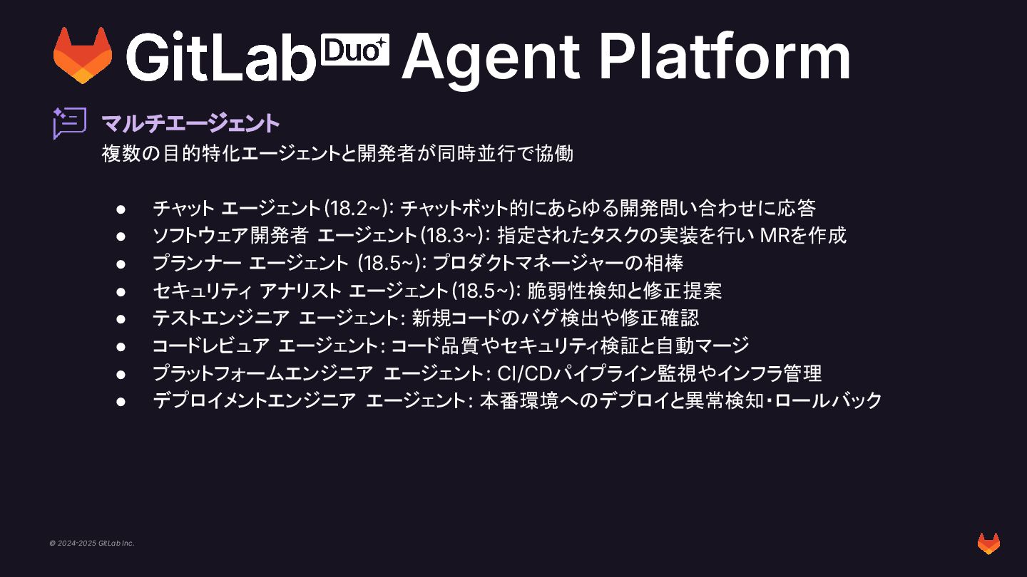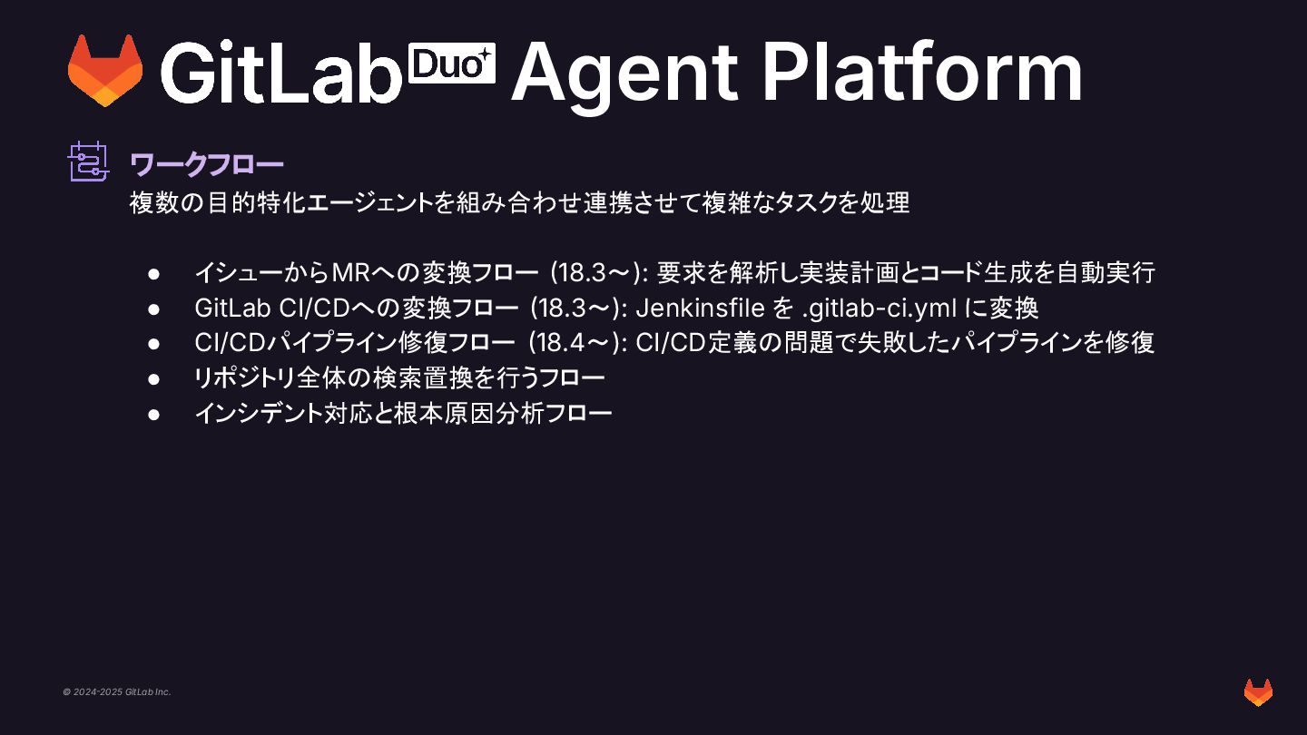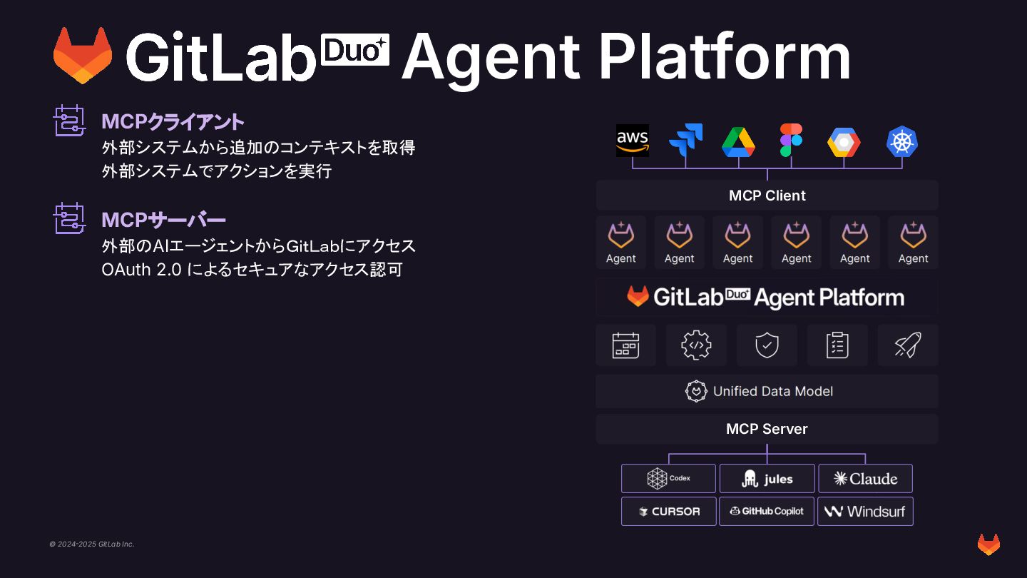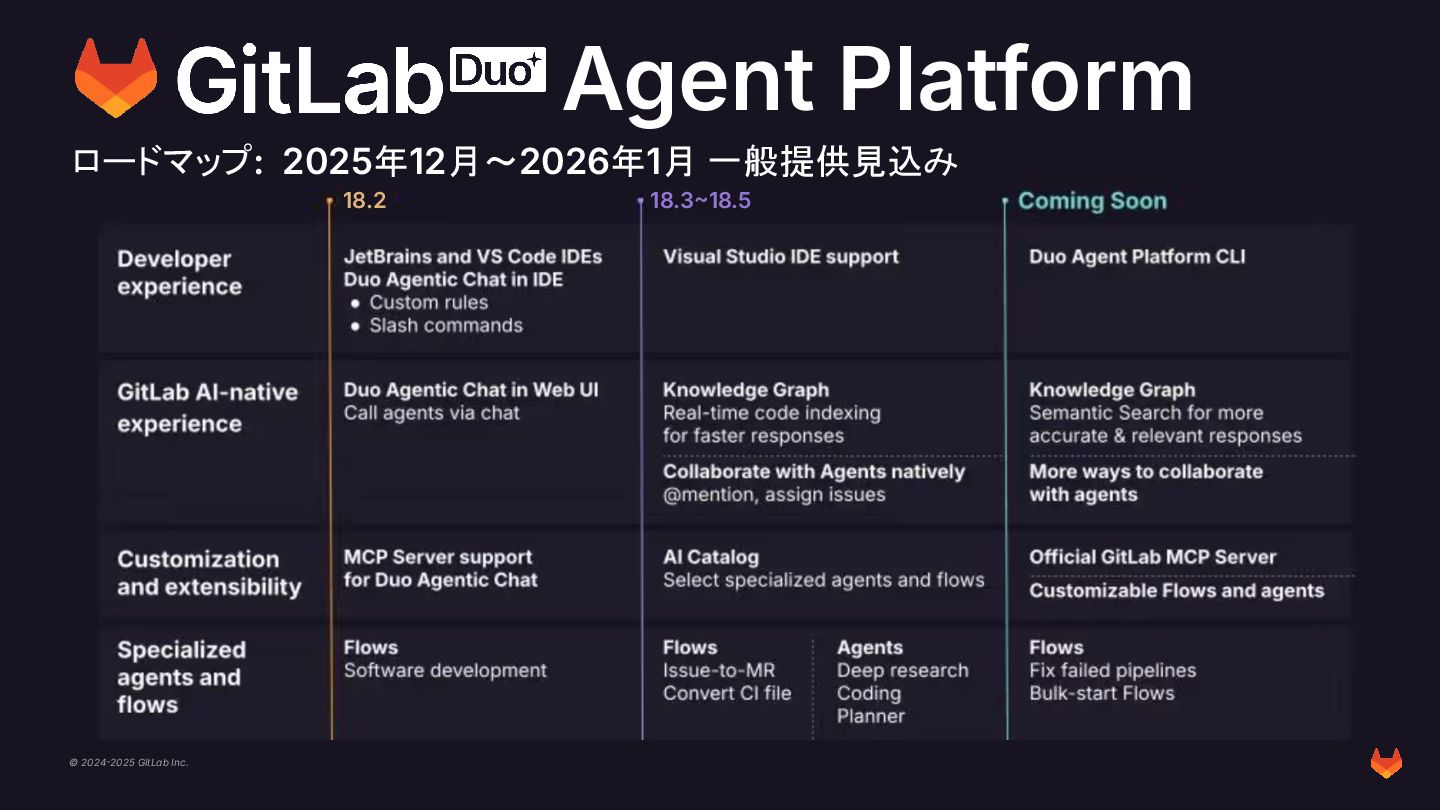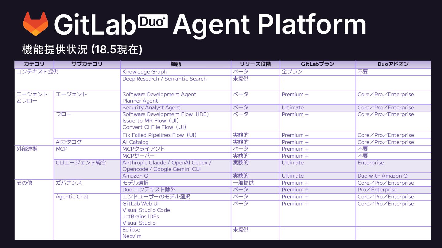 機能 リリース段階 GitLabプラン Duoアドオン コンテキスト提供 Knowledge Graph ベータ 全プラン 不要 Deep Research / Semantic Search 未提供 – – エージェント とフロー エージェント Software Development Agent Planner Agent ベータ Premium + Core/Pro/Enterprise Security Analyst Agent ベータ Ultimate Core/Pro/Enterprise フロー Software Development Flow(IDE) Issue-to-MR Flow(UI) Convert CI File Flow(UI) ベータ Premium + Core/Pro/Enterprise Fix Failed Pipelines Flow(UI) 実験的 Premium + Core/Pro/Enterprise AIカタログ AI Catalog 実験的 Premium + Core/Pro/Enterprise 外部連携 MCP MCPクライアント ベータ Premium + 不要 MCPサーバー 実験的 Premium + 不要 CLIエージェント統合 Anthropic Claude / OpenAI Codex / Opencode / Google Gemini CLI 実験的 Ultimate Enterprise Amazon Q 実験的 Ultimate Duo with Amazon Q その他 ガバナンス モデル選択 一般提供 Premium + Core/Pro/Enterprise Duo コンテキスト除外 ベータ Premium + Pro/Enterprise Agentic Chat エンドユーザーのモデル選択 ベータ Premium + Core/Pro/Enterprise GitLab Web UI Visual Studio Code JetBrains IDEs Visual Studio ベータ Premium + Core/Pro/Enterprise Eclipse Neovim 未提供 – –