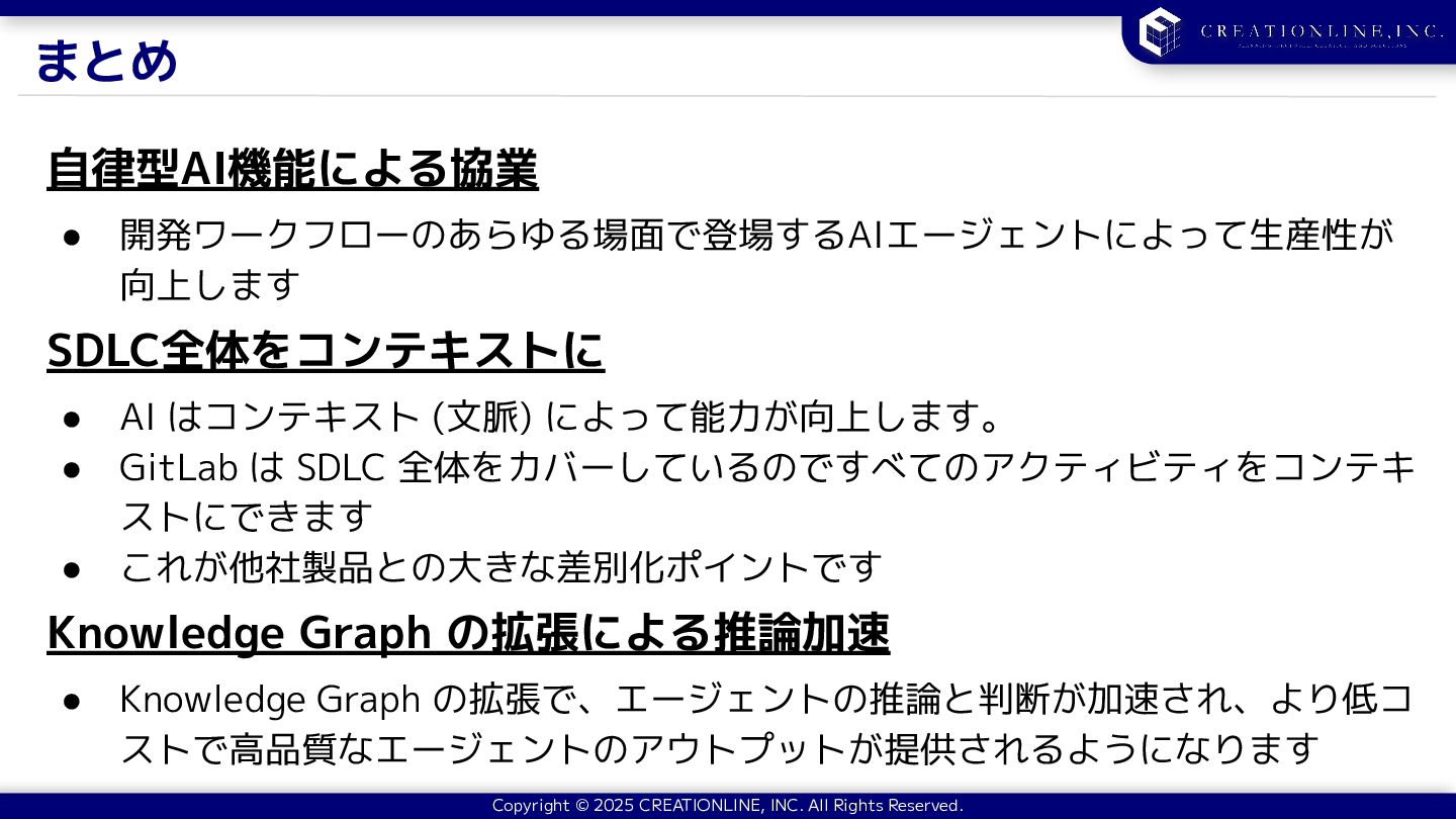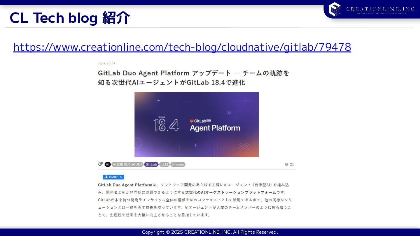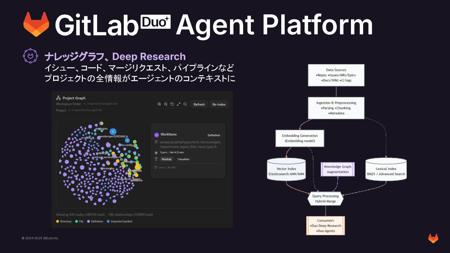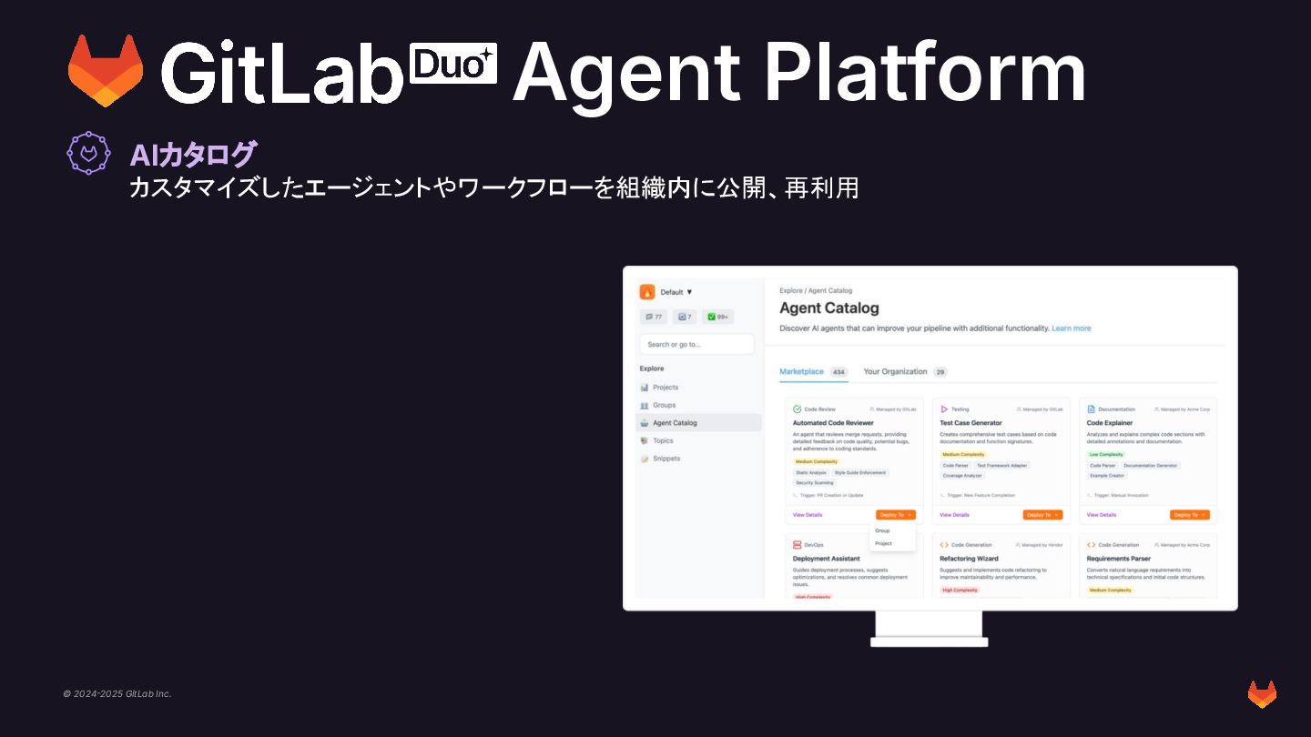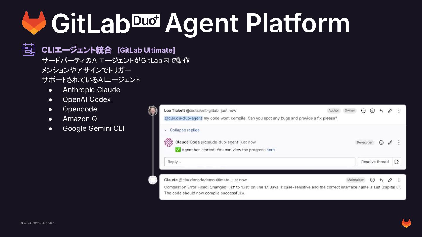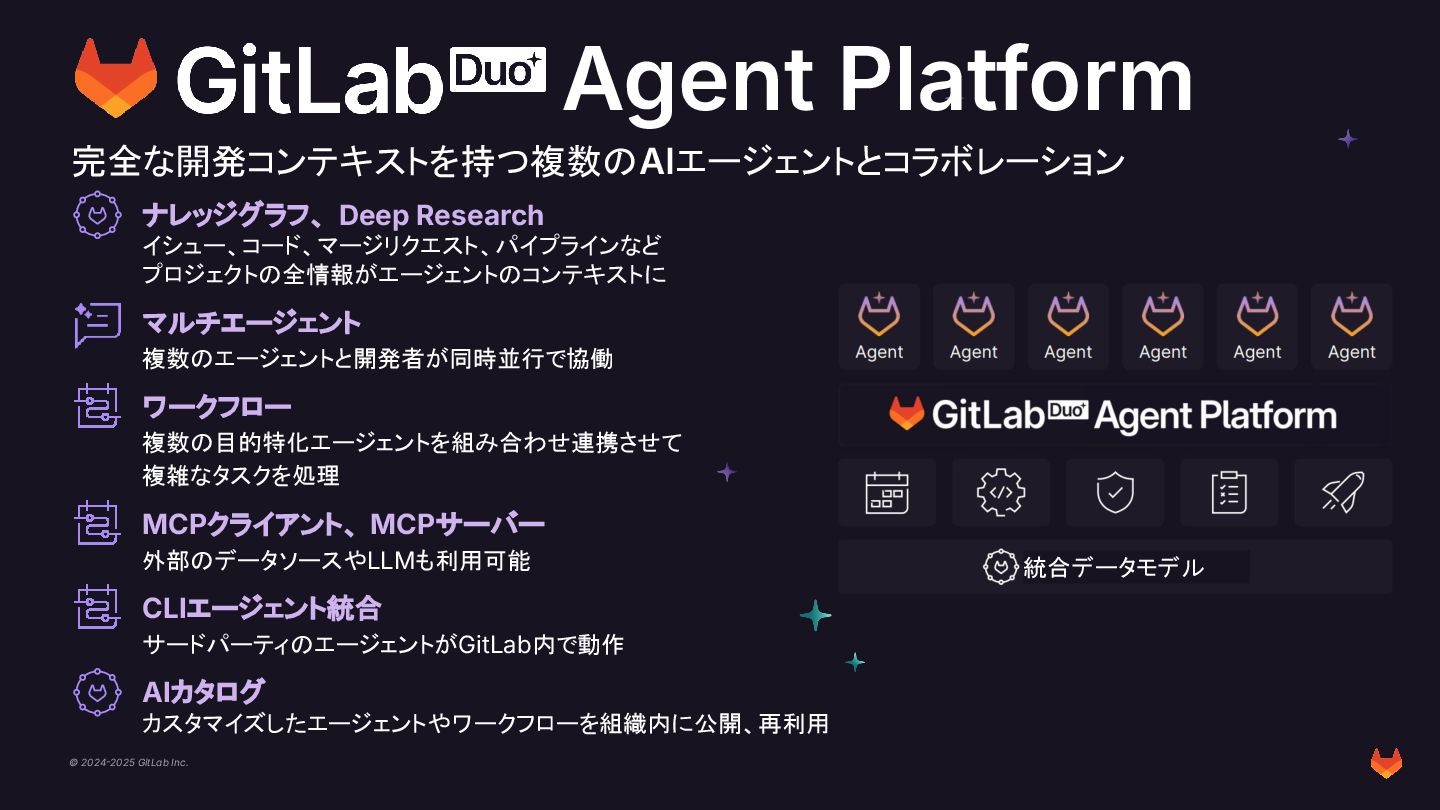 機能 リリース段階 GitLabプラン Duoアドオン コンテキスト提供 Knowledge Graph ベータ 全プラン 不要 Deep Research / Semantic Search 未提供 – – エージェント とフロー エージェント Software Development Agent Planner Agent ベータ Premium + Core/Pro/Enterprise Security Analyst Agent ベータ Ultimate Core/Pro/Enterprise フロー Software Development Flow(IDE) Issue-to-MR Flow(UI) Convert CI File Flow(UI) ベータ Premium + Core/Pro/Enterprise Fix Failed Pipelines Flow(UI) 実験的 Premium + Core/Pro/Enterprise AIカタログ AI Catalog 実験的 Premium + Core/Pro/Enterprise 外部連携 MCP MCPクライアント ベータ Premium + 不要 MCPサーバー 実験的 Premium + 不要 CLIエージェント統合 Anthropic Claude / OpenAI Codex / Opencode / Google Gemini CLI 実験的 Ultimate Enterprise Amazon Q 実験的 Ultimate Duo with Amazon Q その他 ガバナンス モデル選択 一般提供 Premium + Core/Pro/Enterprise Duo コンテキスト除外 ベータ Premium + Pro/Enterprise Agentic Chat エンドユーザーのモデル選択 ベータ Premium + Core/Pro/Enterprise GitLab Web UI Visual Studio Code JetBrains IDEs Visual Studio ベータ Premium + Core/Pro/Enterprise Eclipse Neovim 未提供 – –