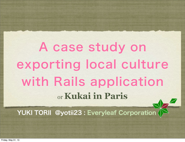 "DBTFTUVEZPO FYQPSUJOHMPDBMDVMUVSF XJUI3BJMTBQQMJDBUJPO or Kukai in Paris :6,*503**!ZPUJJ&WFSZMFBG$PSQPSBUJPO Friday, May