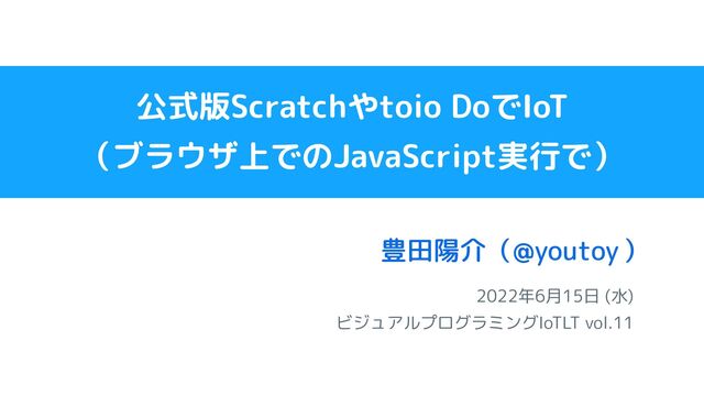公式版Scratchやtoio DoでIoT (ブラウザ上でのJavaScript実行で) 2022年6月15日 (水) ビジュアルプログラミングIoTLT vol.11 豊田陽介( ) @youtoy