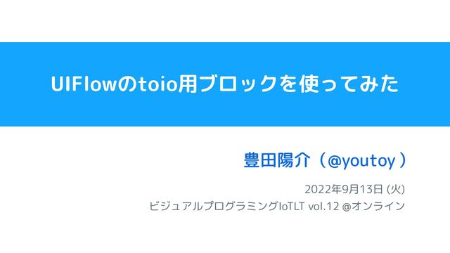 UIFlowのtoio用ブロックを使ってみた 2022年9月13日 (火) ビジュアルプログラミングIoTLT vol.12 @オンライン 豊田陽介( ) @youtoy