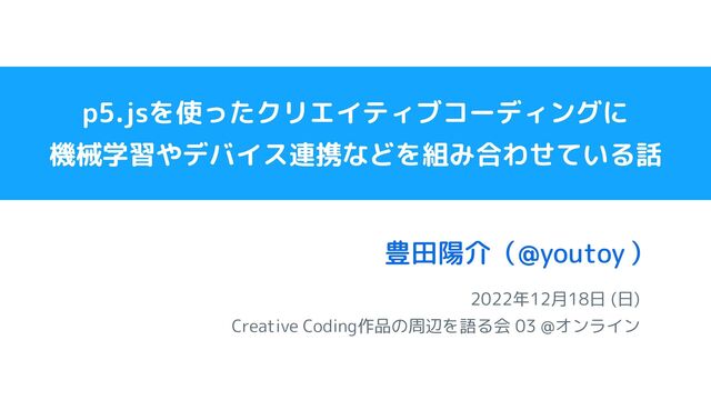 p5.jsを使ったクリエイティブコーディングに 機械学習やデバイス連携などを組み合わせている話 2022年12月18日 (日) Creative Coding作品の周辺を語る会 03 @オンライン 豊田陽介( )