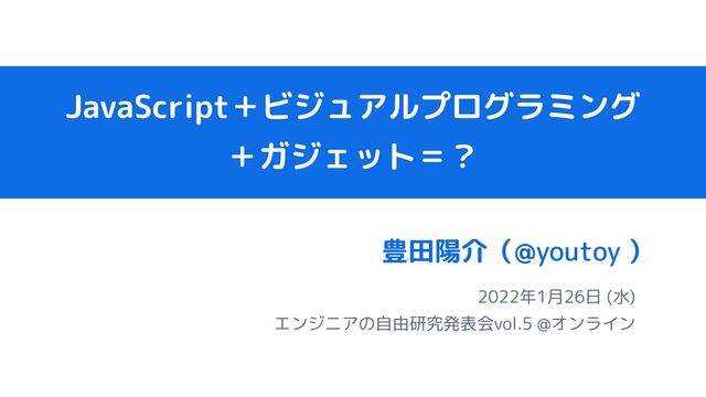 JavaScript+ビジュアルプログラミング +ガジェット=? 2022年1月26日 (水) エンジニアの自由研究発表会vol.5 @オンライン 豊田陽介( ) @youtoy