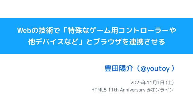 2025年11月1日 (土) HTML5 11th Anniversary @オンライン 豊田陽介( ) @youtoy Webの技術で「特殊なゲーム用コントローラーや