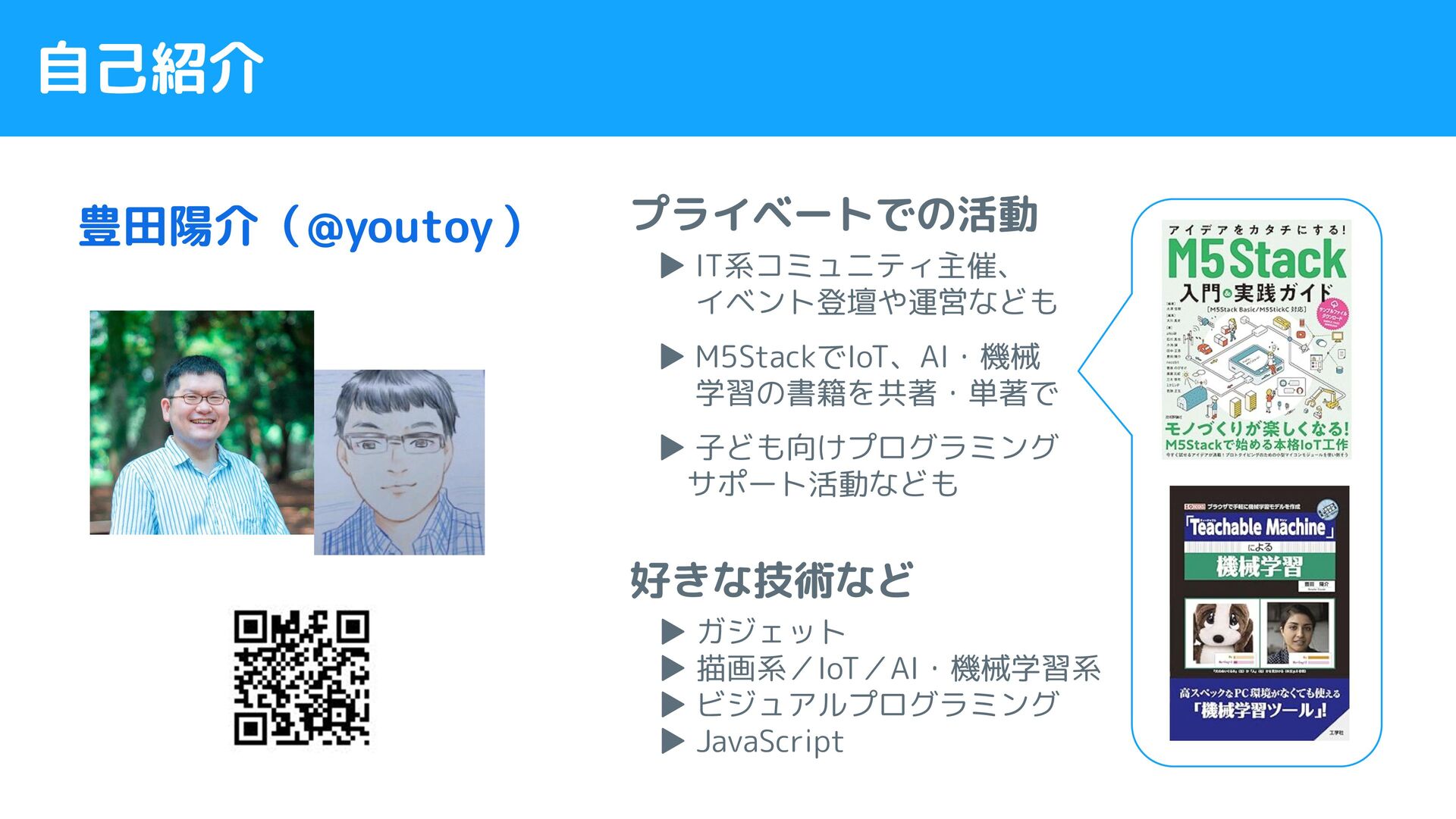 自己紹介 豊田陽介( ) @youtoy ▶ IT系コミュニティ主催、 イベント登壇や運営なども ▶ M5StackでIoT、AI・機械