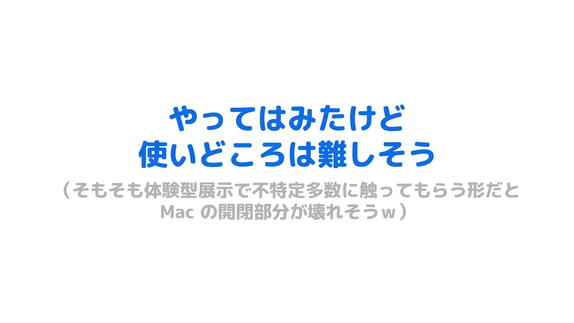 やってはみたけど 使いどころは難しそう (そもそも体験型展示で不特定多数に触ってもらう形だと Mac の開閉部分が壊れそうw)