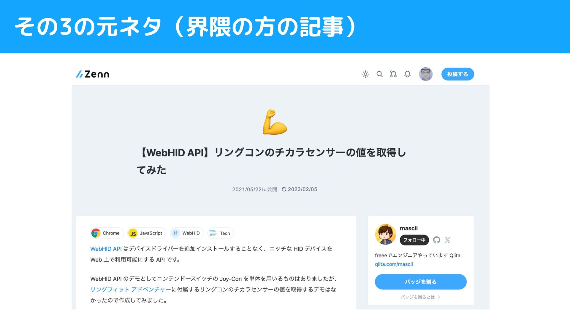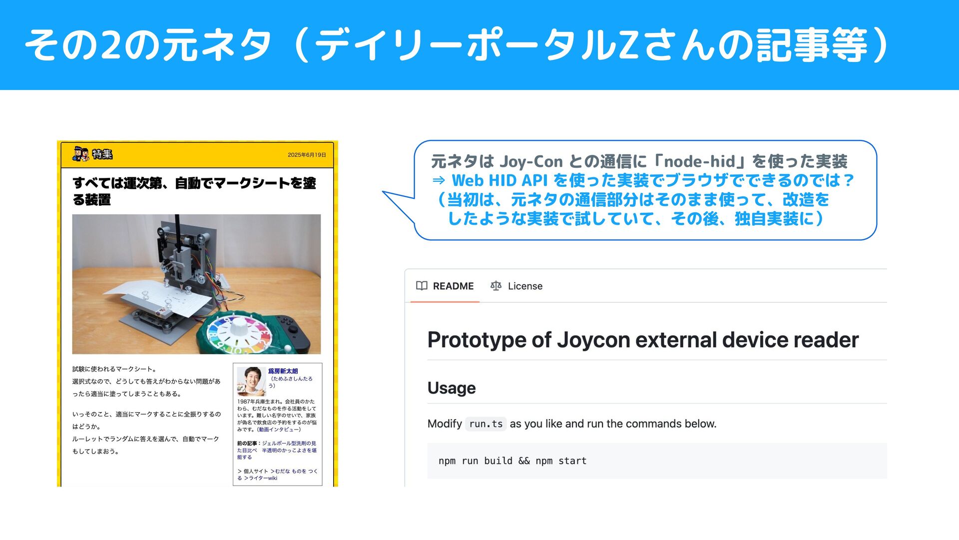 その2の元ネタ(デイリーポータルZさんの記事等) 元ネタは Joy-Con との通信に「node-hid」を使った実装 ⇒ Web HID API を使った実装でブラウザでできるのでは? (当初は、元ネタの通信部分はそのまま使って、改造を