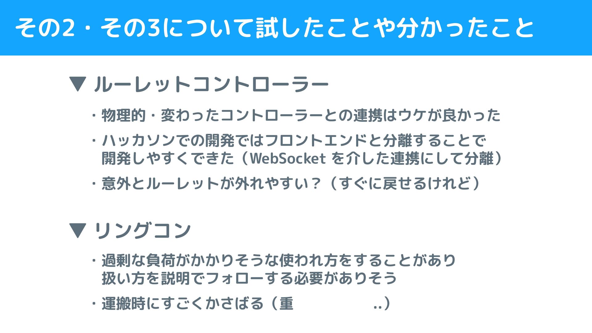 その2・その3について試したことや分かったこと ▼ ルーレットコントローラー ・物理的・変わったコントローラーとの連携はウケが良かった ・ハッカソンでの開発ではフロントエンドと分離することで 開発しやすくできた(WebSocket を介した連携にして分離) ・意外とルーレットが外れやすい?(すぐに戻せるけれど) ▼ リングコン