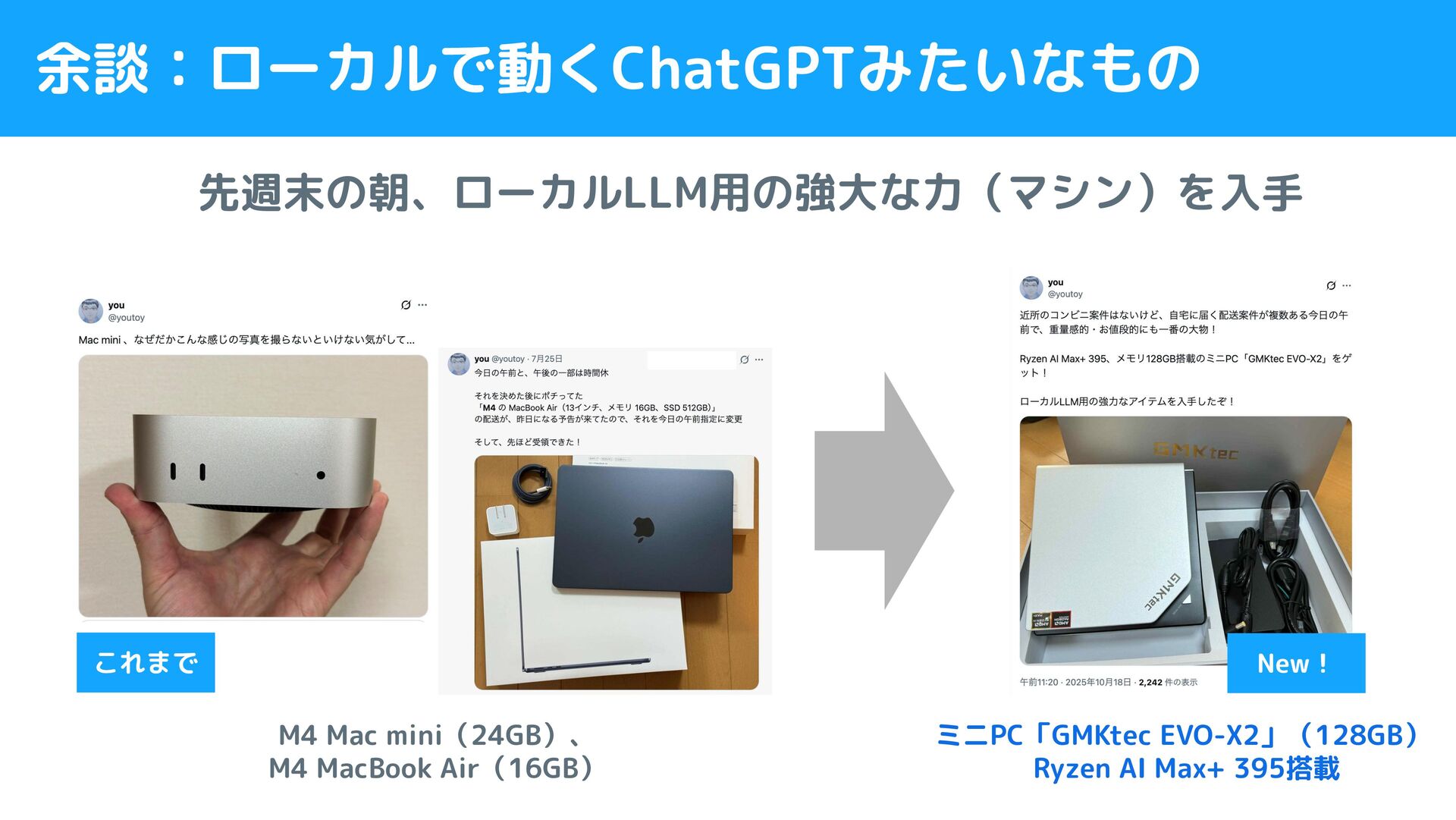 ミニPC「GMKtec EVO-X2」(128GB) Ryzen AI Max+ 395搭載 余談:ローカルで動くChatGPTみたいなもの 先週末の朝、ローカルLLM用の強大な力(マシン)を入手 M4 Mac