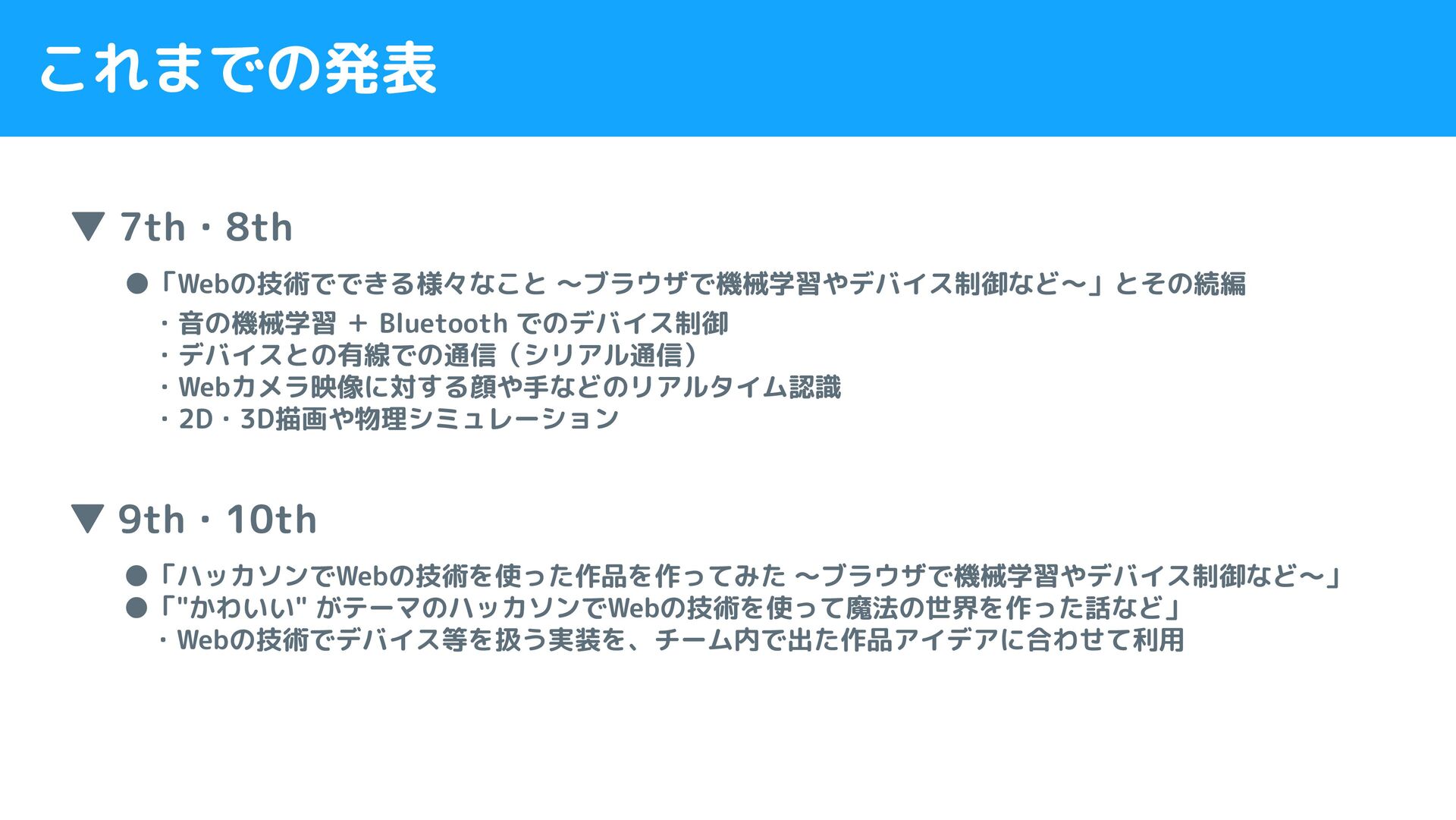 これまでの発表 ▼ 9th・10th •「ハッカソンでWebの技術を使った作品を作ってみた 〜ブラウザで機械学習やデバイス制御など〜」 •「"かわいい" がテーマのハッカソンでWebの技術を使って魔法の世界を作った話など」 ・Webの技術でデバイス等を扱う実装を、チーム内で出た作品アイデアに合わせて利用 ▼ 7th・8th