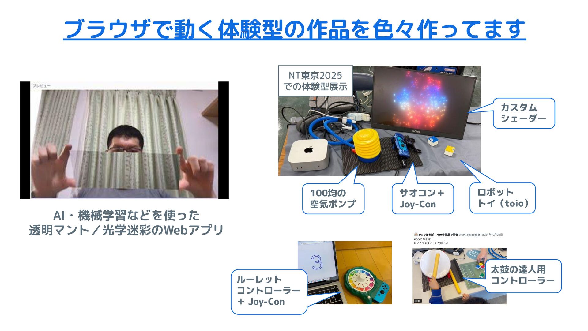 ブラウザで動く体験型の作品を色々作ってます AI・機械学習などを使った 透明マント/光学迷彩のWebアプリ NT東京2025 での体験型展示 100均の 空気ポンプ カスタム シェーダー サオコン+