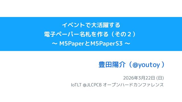 2026年3月22日 (日) IoTLT @JLCPCB オープンハードカンファレンス 豊田陽介( ) @youtoy イベントで大活躍する 電子ペーパー名札を作る(その2)