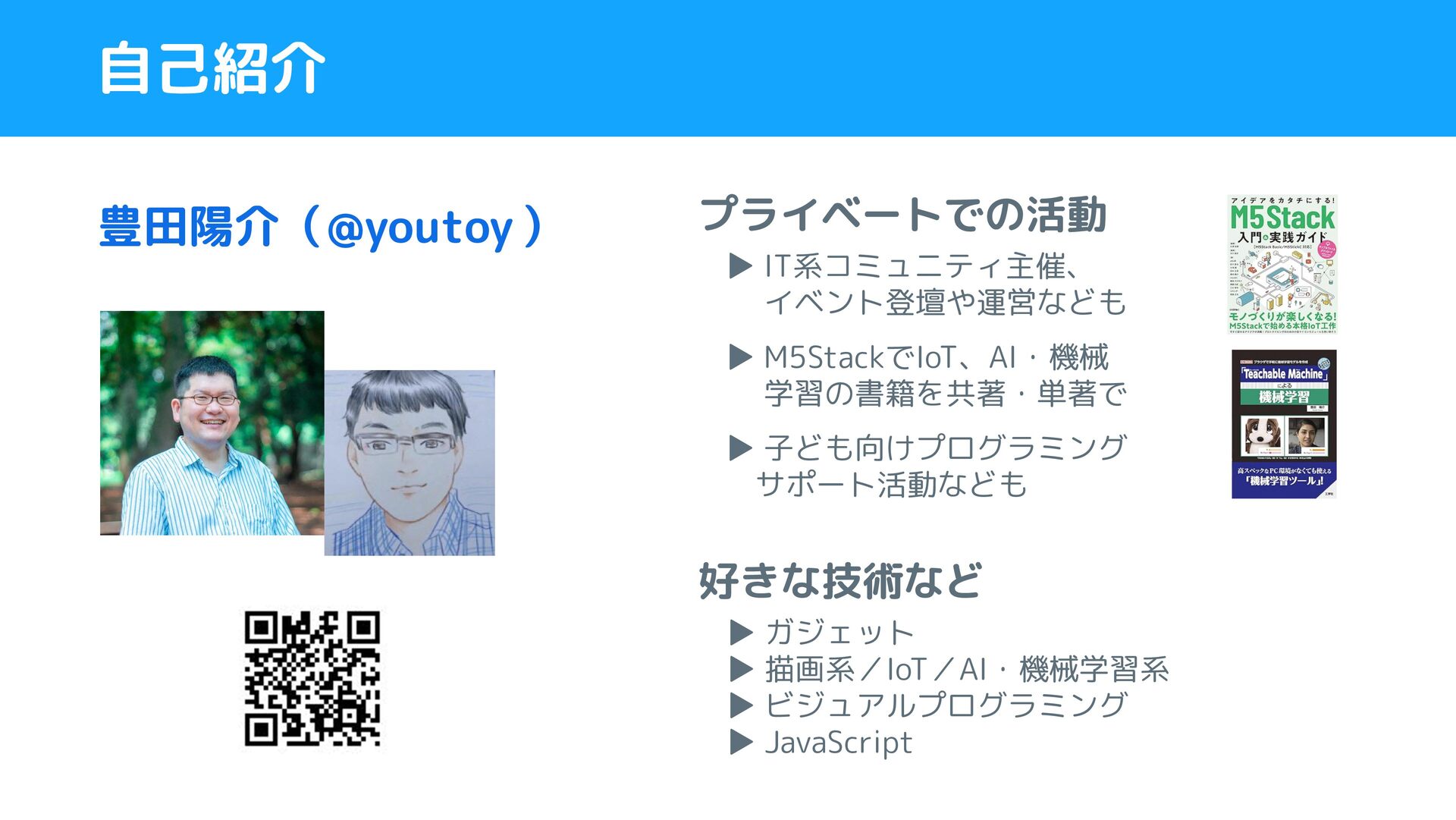 自己紹介 豊田陽介( ) @youtoy ▶ IT系コミュニティ主催、 イベント登壇や運営なども ▶ M5StackでIoT、AI・機械