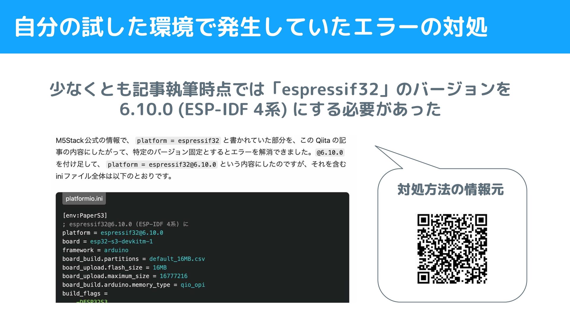 自分の試した環境で発生していたエラーの対処 少なくとも記事執筆時点では「espressif32」のバージョンを 6.10.0 (ESP-IDF 4系) にする必要があった 対処方法の情報元