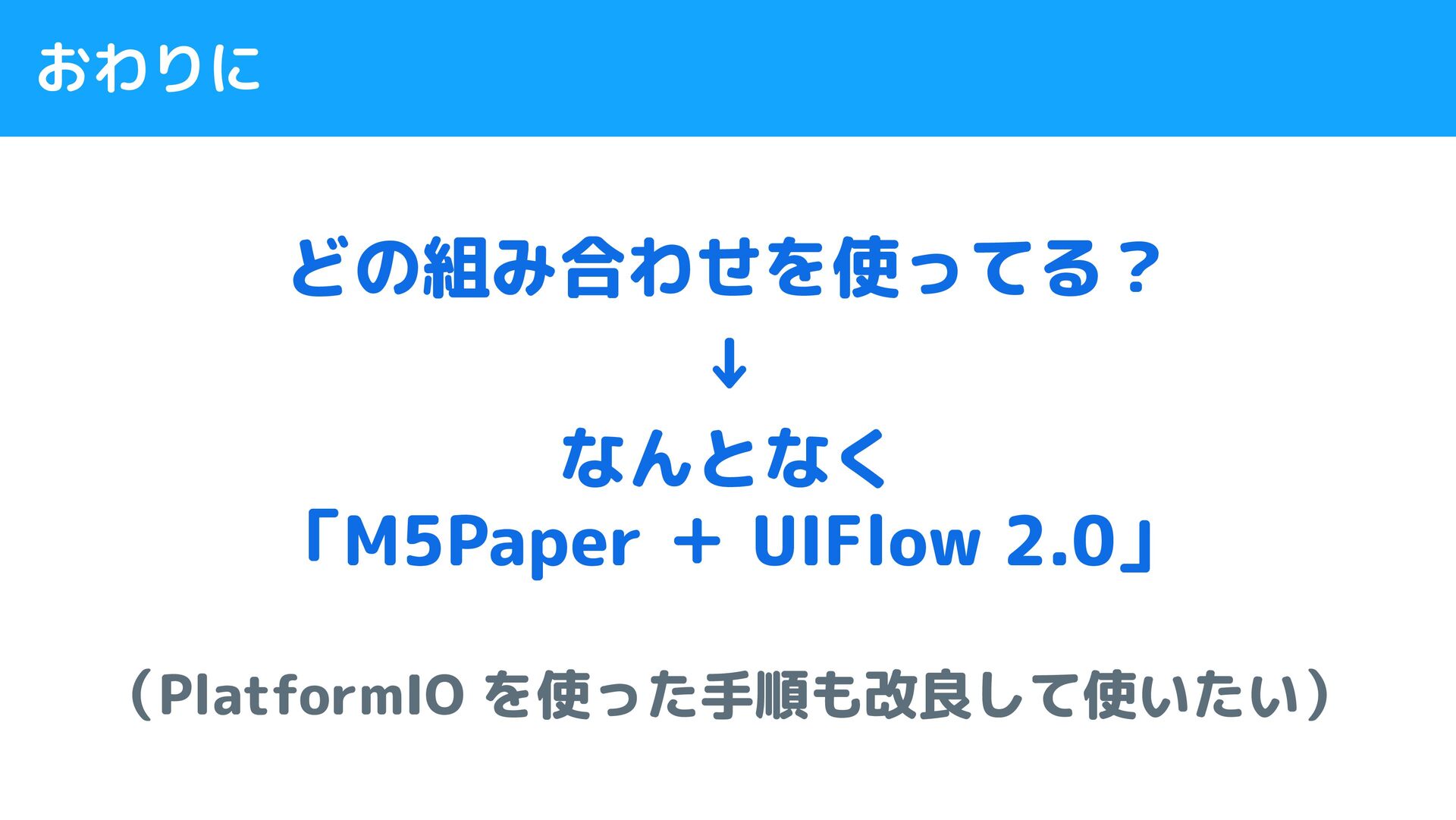 おわりに どの組み合わせを使ってる? ↓ なんとなく 「M5Paper + UIFlow 2.0」 (PlatformIO を使った手順も改良して使いたい)