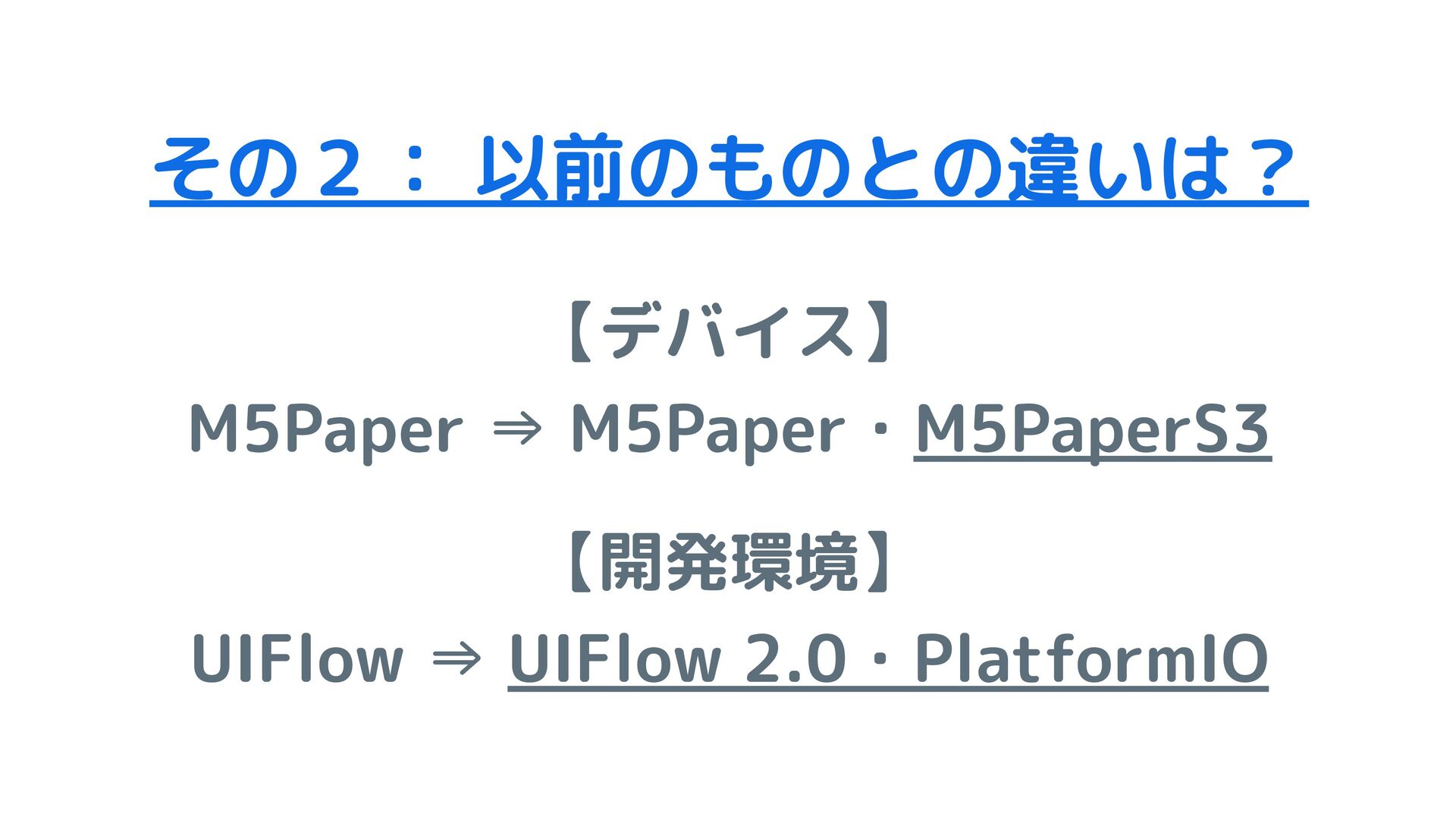 その2: 以前のものとの違いは? 【デバイス】 M5Paper ⇒ M5Paper・M5PaperS3 【開発環境】 UIFlow ⇒ UIFlow
