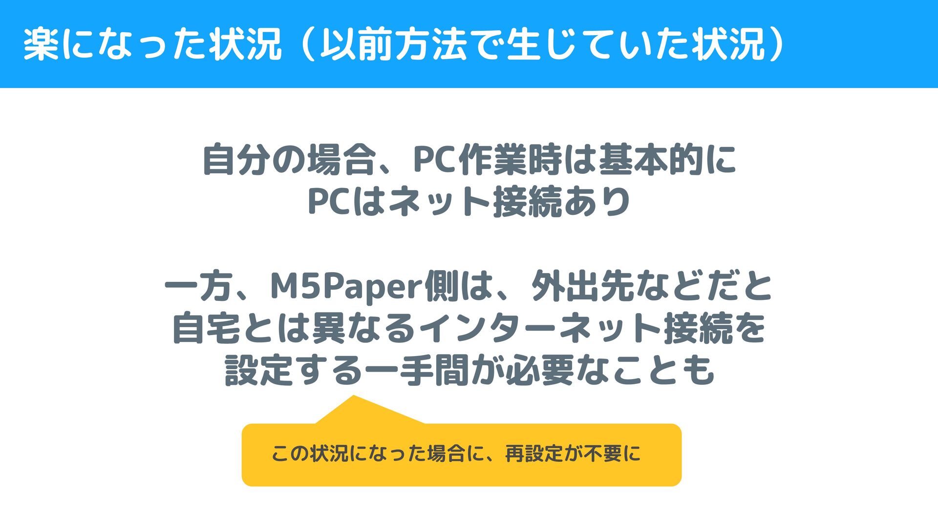 楽になった状況(以前方法で生じていた状況) 自分の場合、PC作業時は基本的に PCはネット接続あり 一方、M5Paper側は、外出先などだと 自宅とは異なるインターネット接続を 設定する一手間が必要なことも この状況になった場合に、再設定が不要に