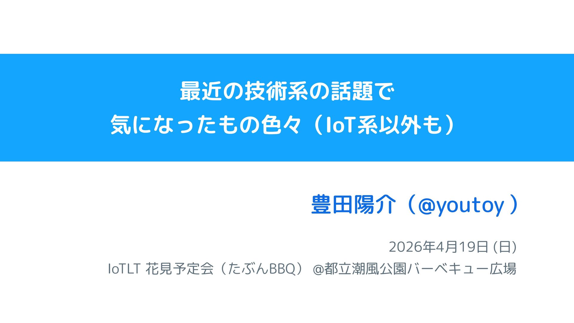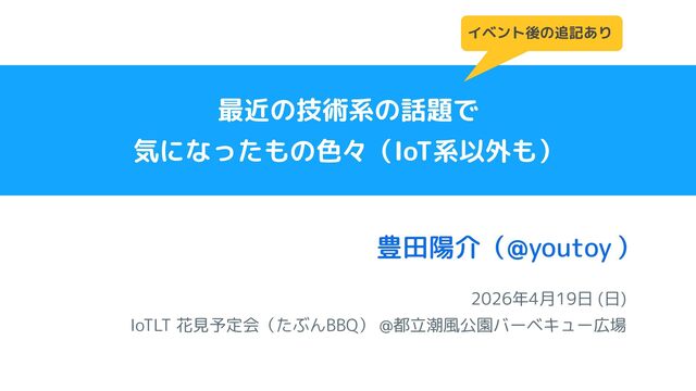 2026年4月19日 (日) IoTLT 花見予定会(たぶんBBQ) @都立潮風公園バーベキュー広場 豊田陽介( ) @youtoy 最近の技術系の話題で 気になったもの色々(IoT系以外も)
