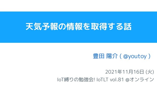 天気予報の情報を取得する話 2021年11月16日 (火) IoT縛りの勉強会! IoTLT vol.81 @オンライン 豊田 陽介 (